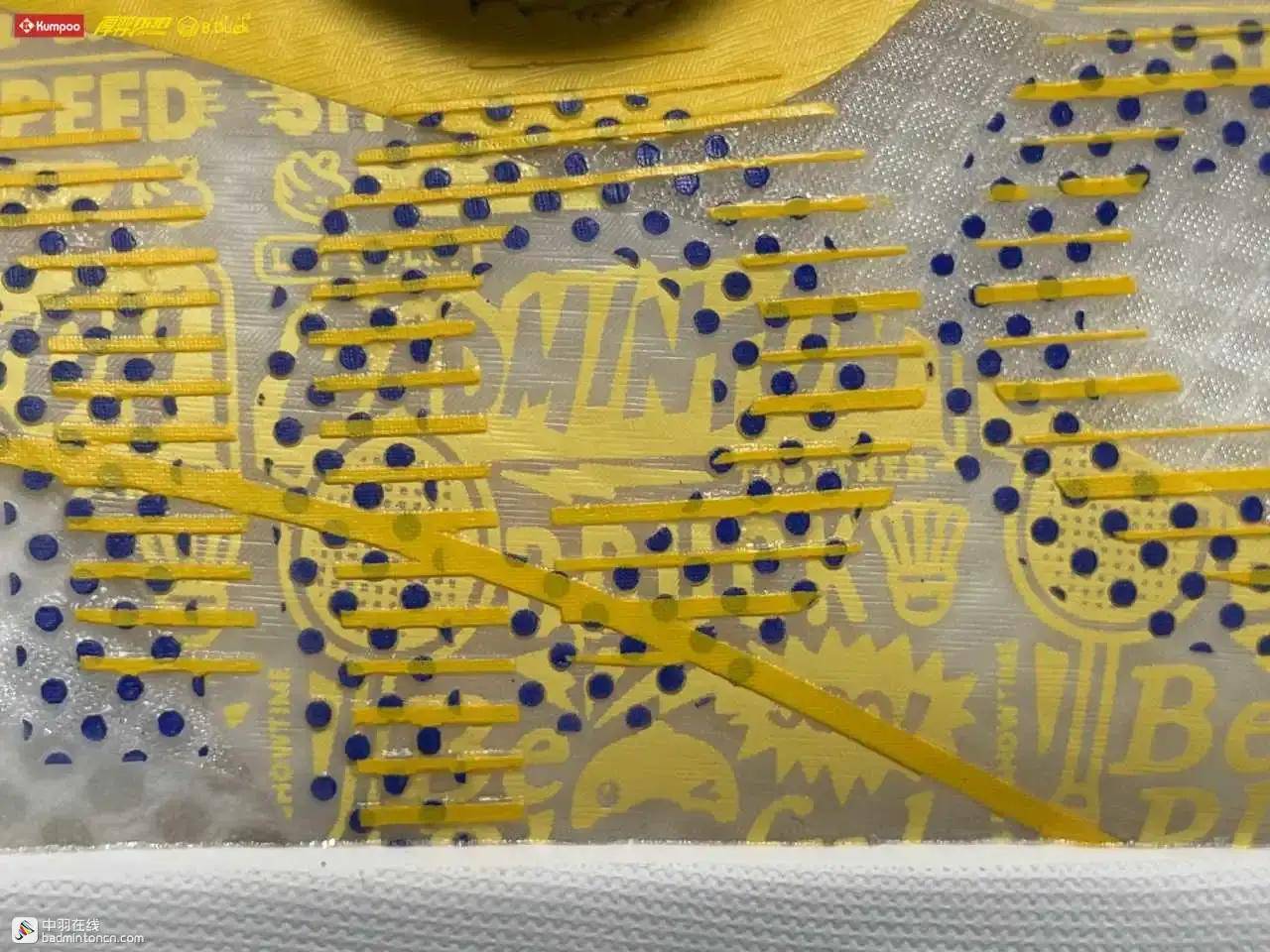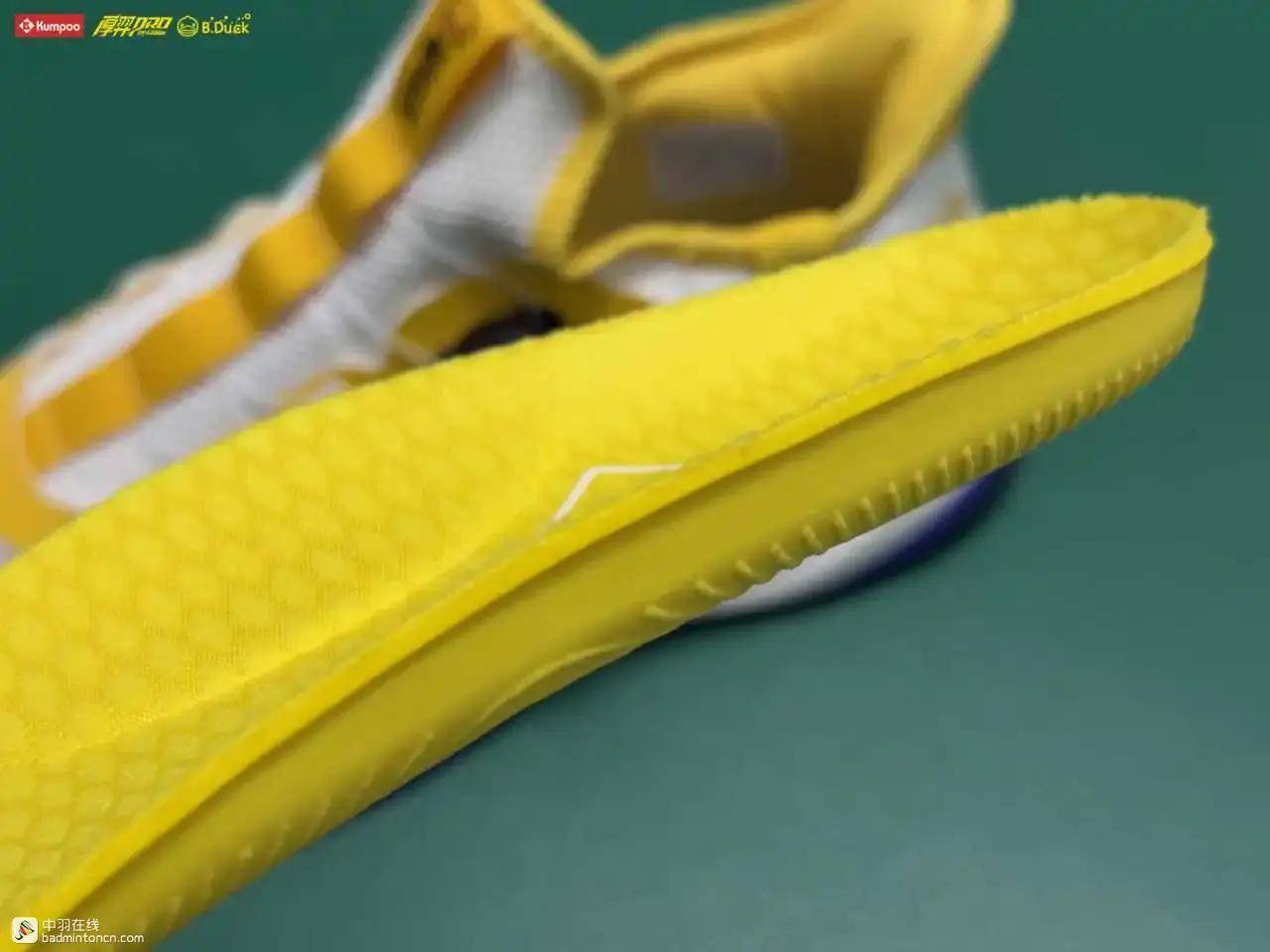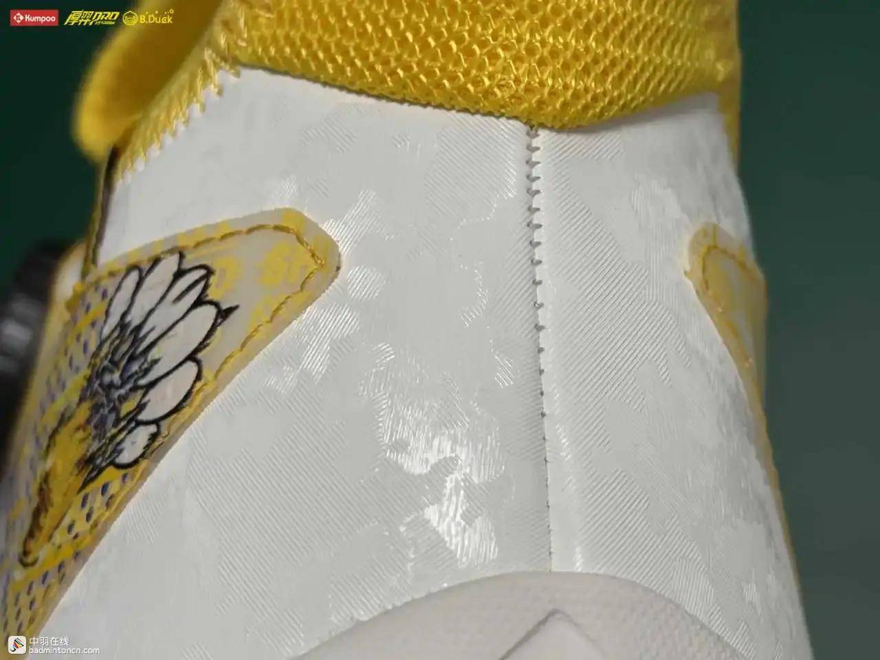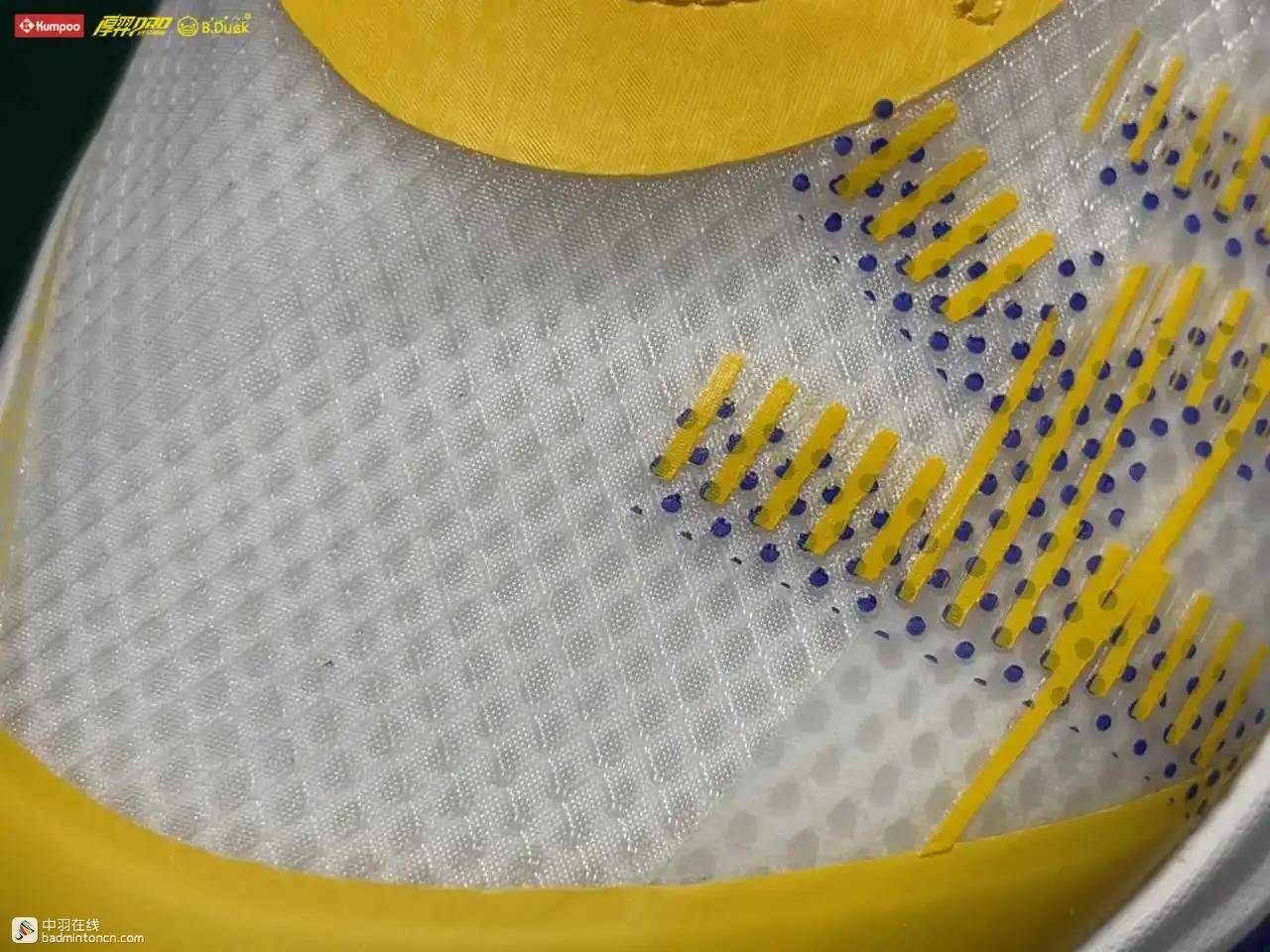 在鞋外侧的中后部、以及内侧鞋面网布的边缘的TPU薄膜上,遍布黄色的图案与文字,内容包括“BADMINTON”、“B. DUCK”、“Be Playful”、“SHUTTLE SPEED”、“yoo!”以及小黄鸭、羽毛球和羽毛球拍图案等等,以版画插图的形式展现“运动”与“快乐”的主题,彰显时代年轻人的时尚态度。