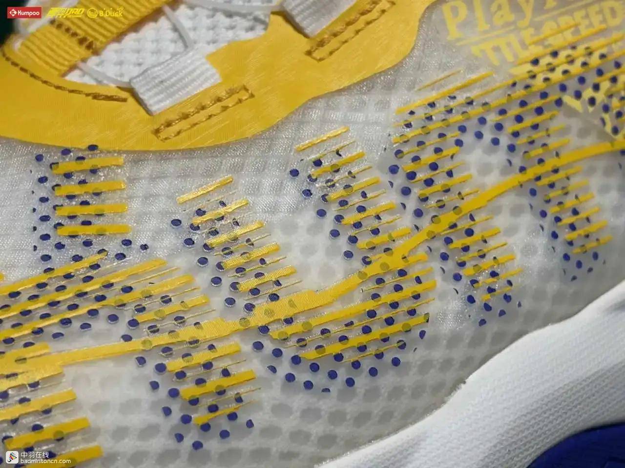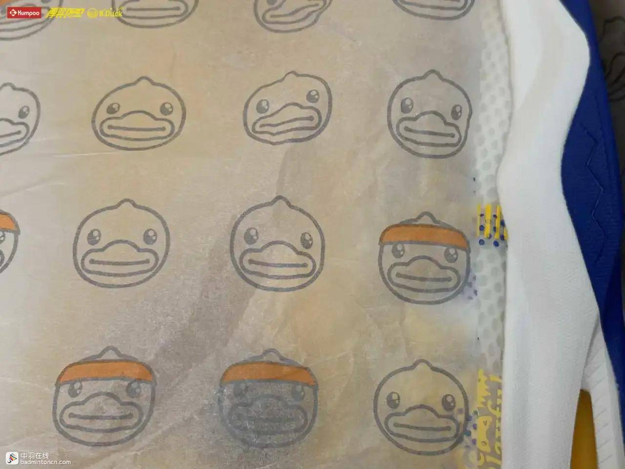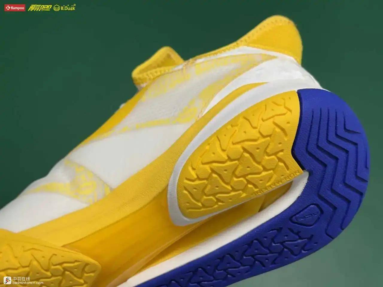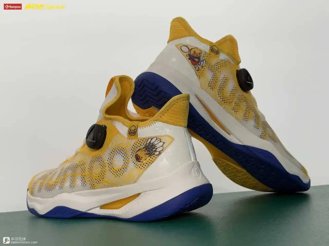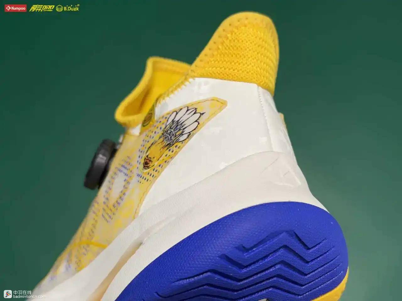 在鞋外侧的中后部、以及内侧鞋面网布的边缘的TPU薄膜上,遍布黄色的图案与文字,内容包括“BADMINTON”、“B. DUCK”、“Be Playful”、“SHUTTLE SPEED”、“yoo!”以及小黄鸭、羽毛球和羽毛球拍图案等等,以版画插图的形式展现“运动”与“快乐”的主题,彰显时代年轻人的时尚态度。