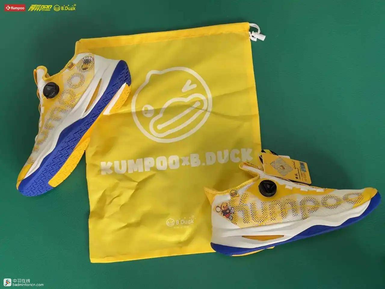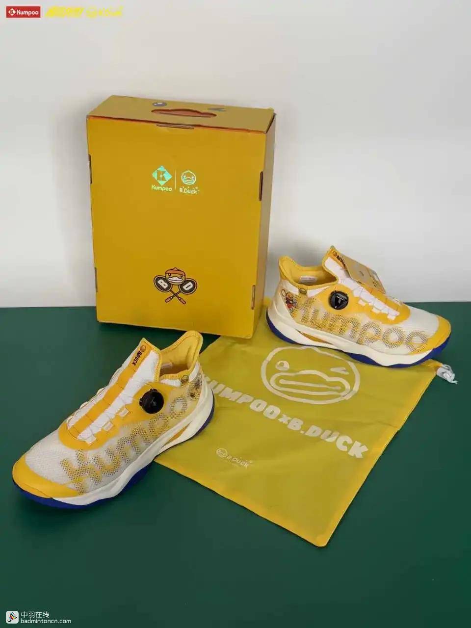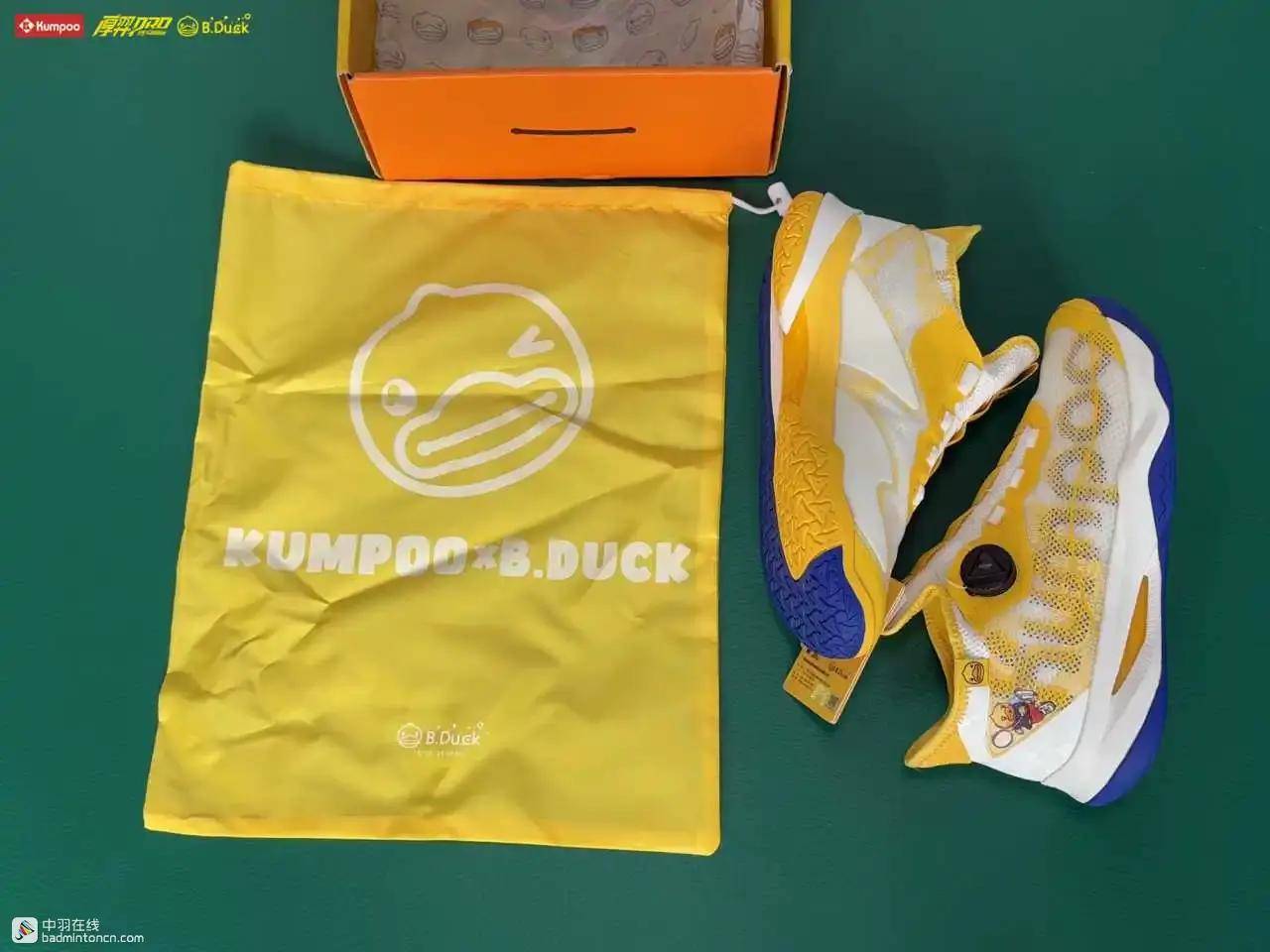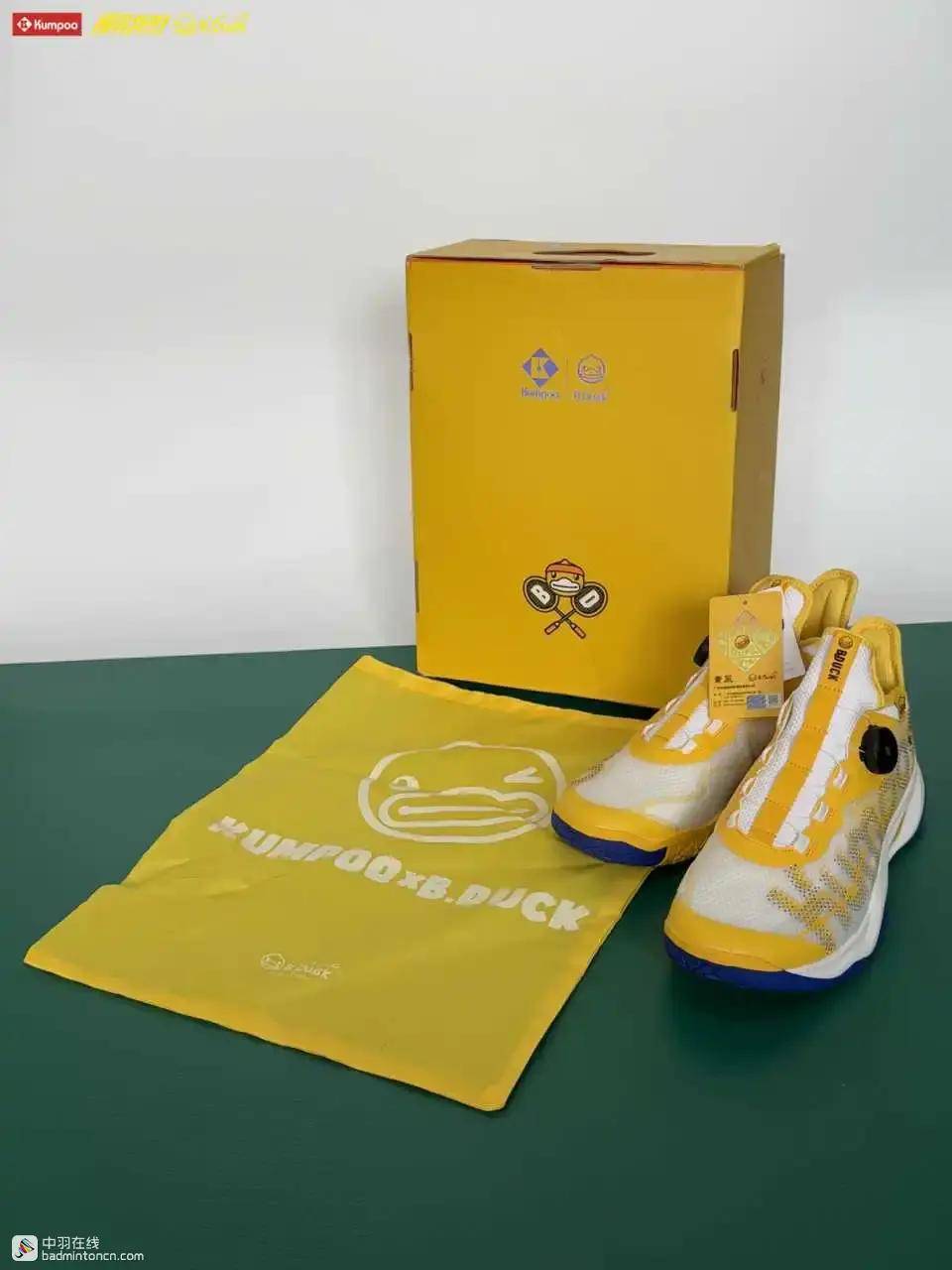 鞋盒内除了一双厚羿PRO 小黄鸭球鞋以外,还附赠了球鞋收纳袋,黄色的鞋袋上印有白色的小黄鸭头像图案以及“KUMPOO ×B. DUCK”联名标识。