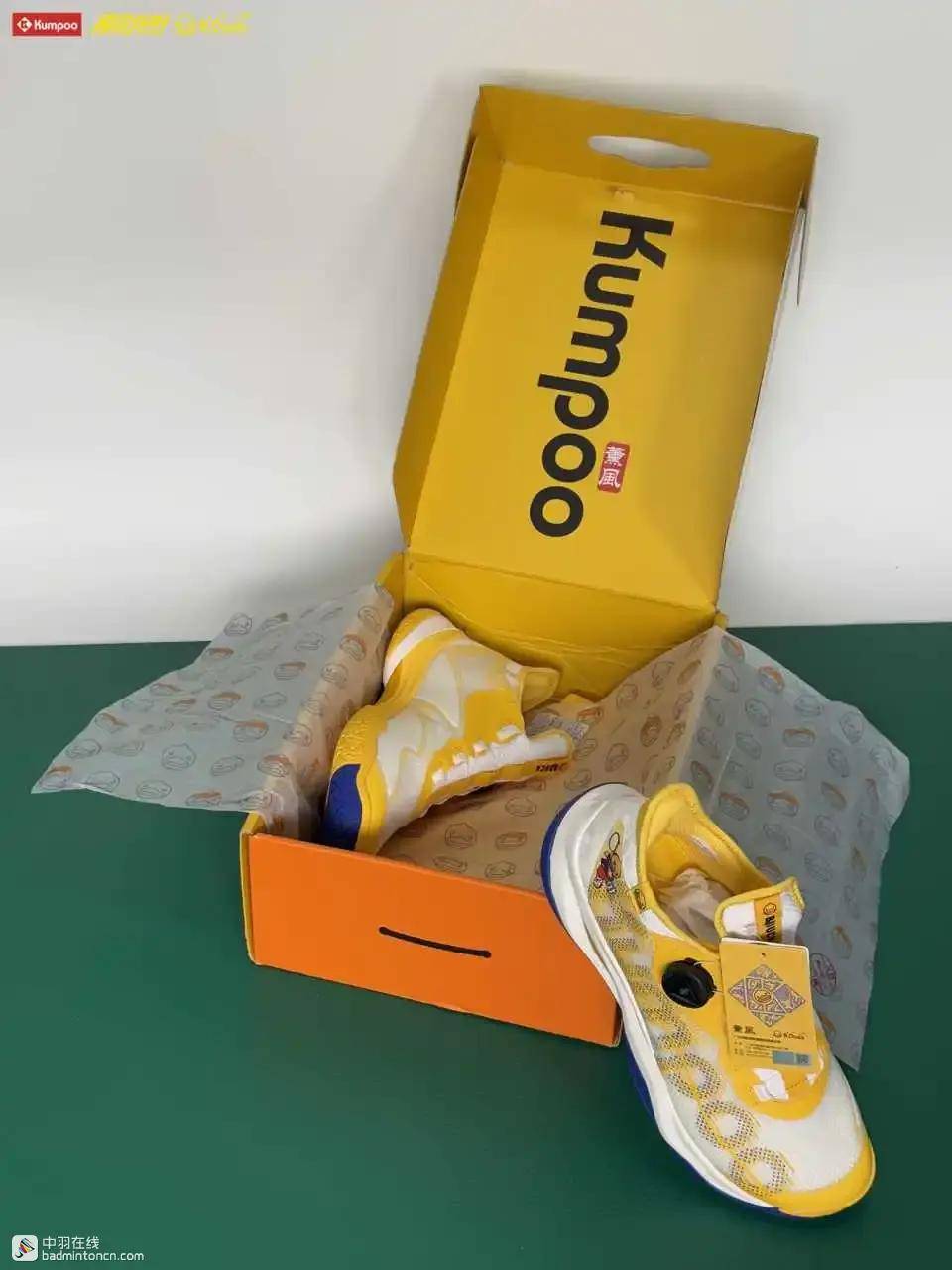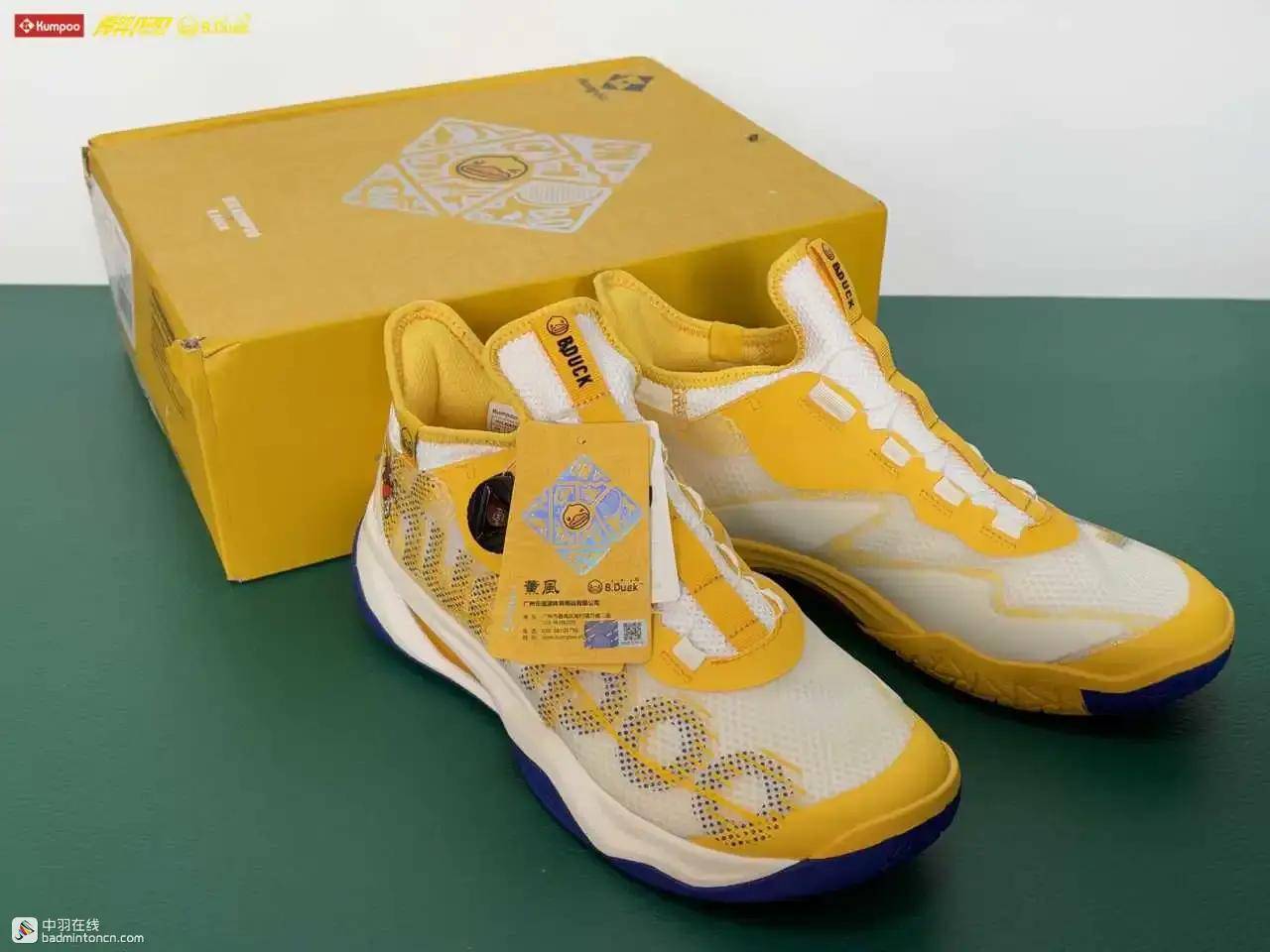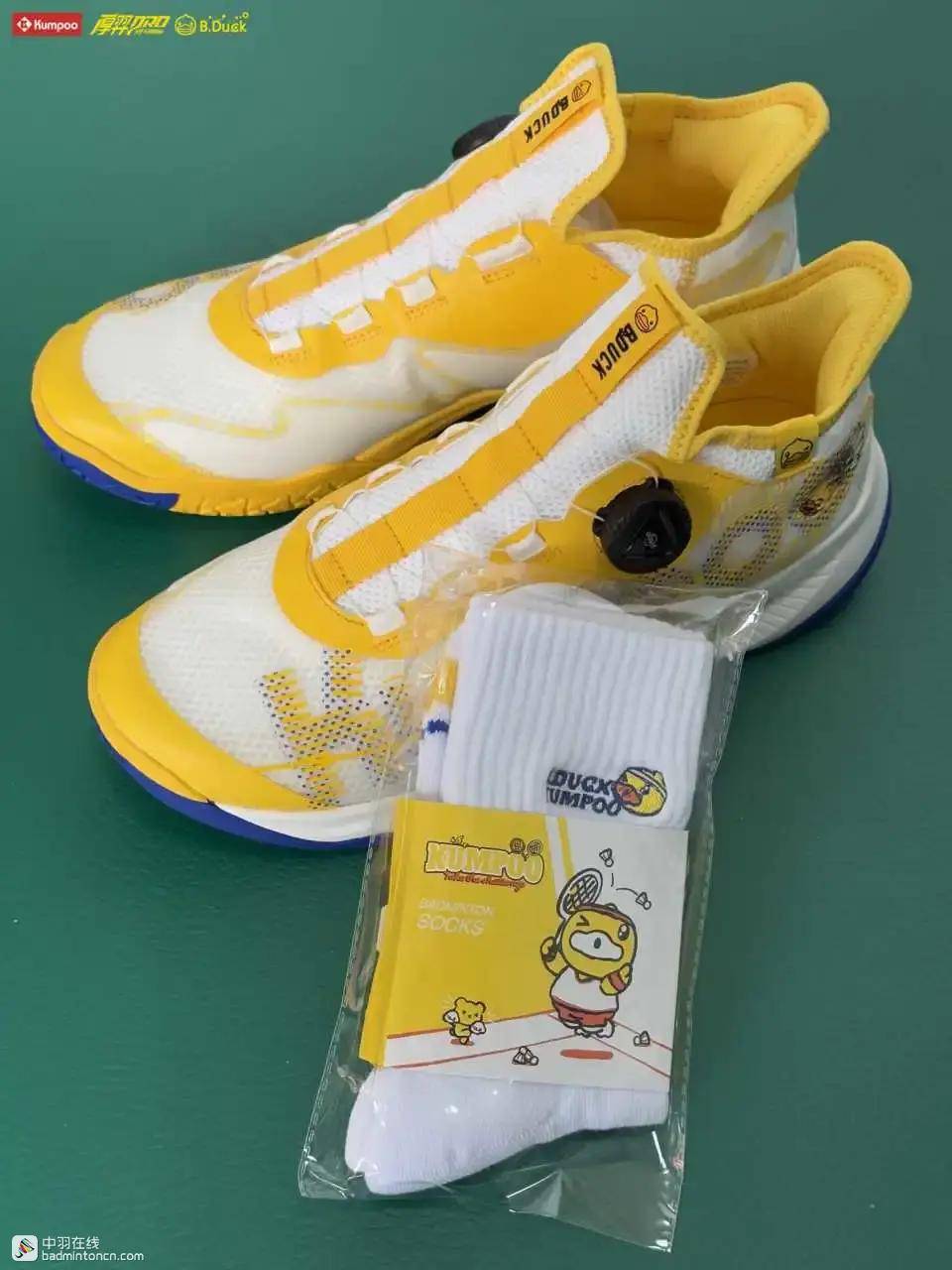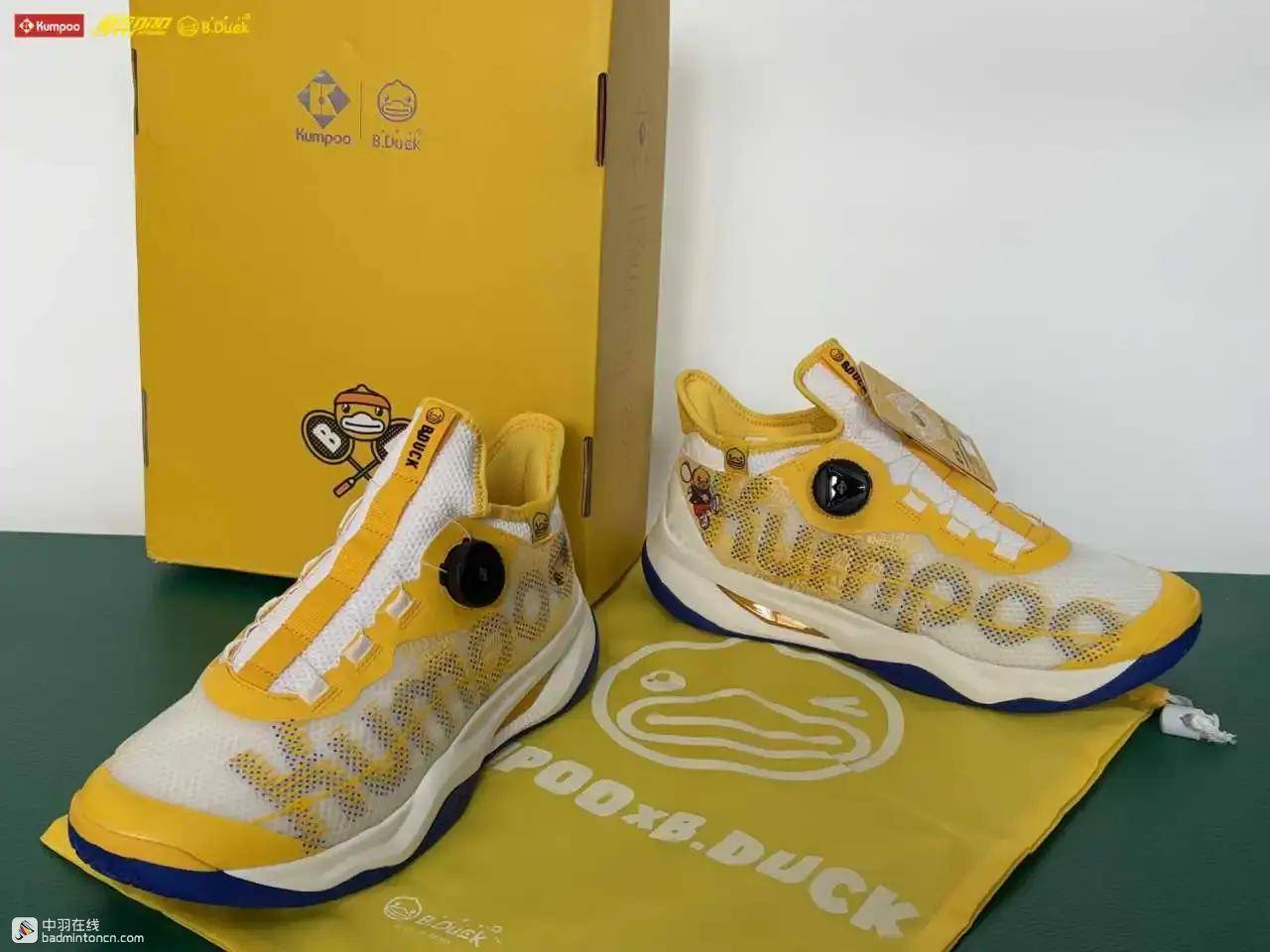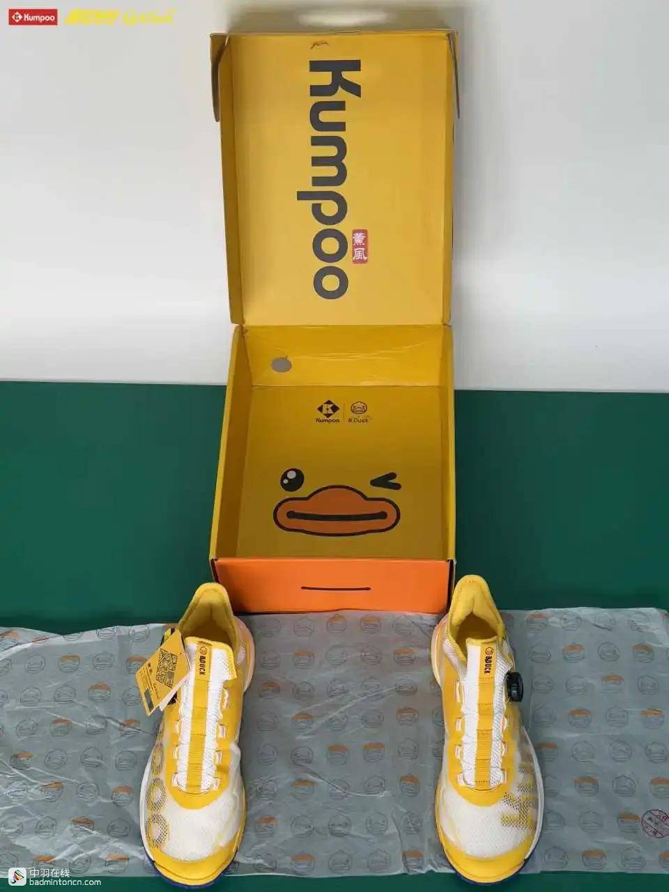 鞋盒内除了一双厚羿PRO 小黄鸭球鞋以外,还附赠了球鞋收纳袋,黄色的鞋袋上印有白色的小黄鸭头像图案以及“KUMPOO ×B. DUCK”联名标识。