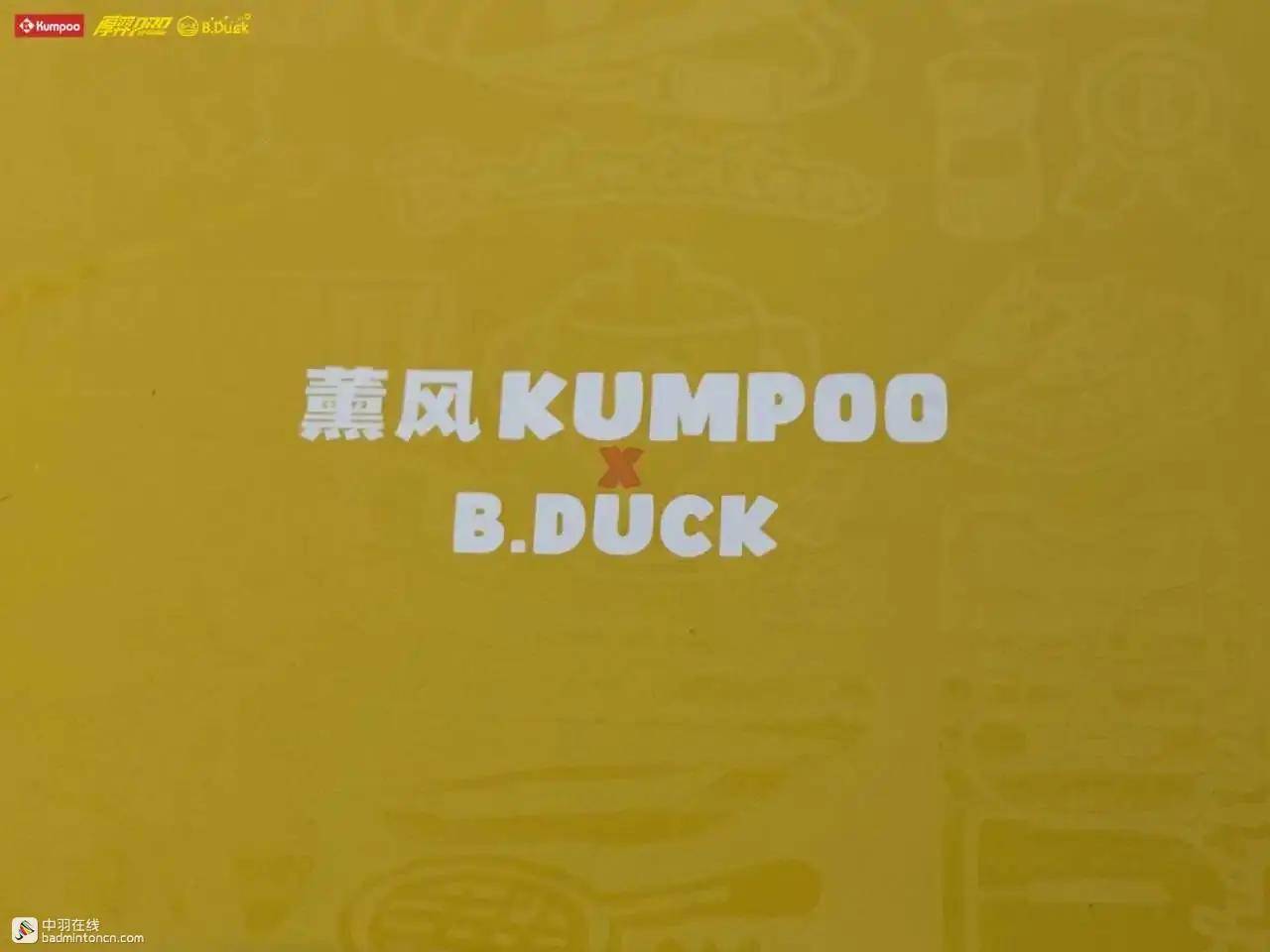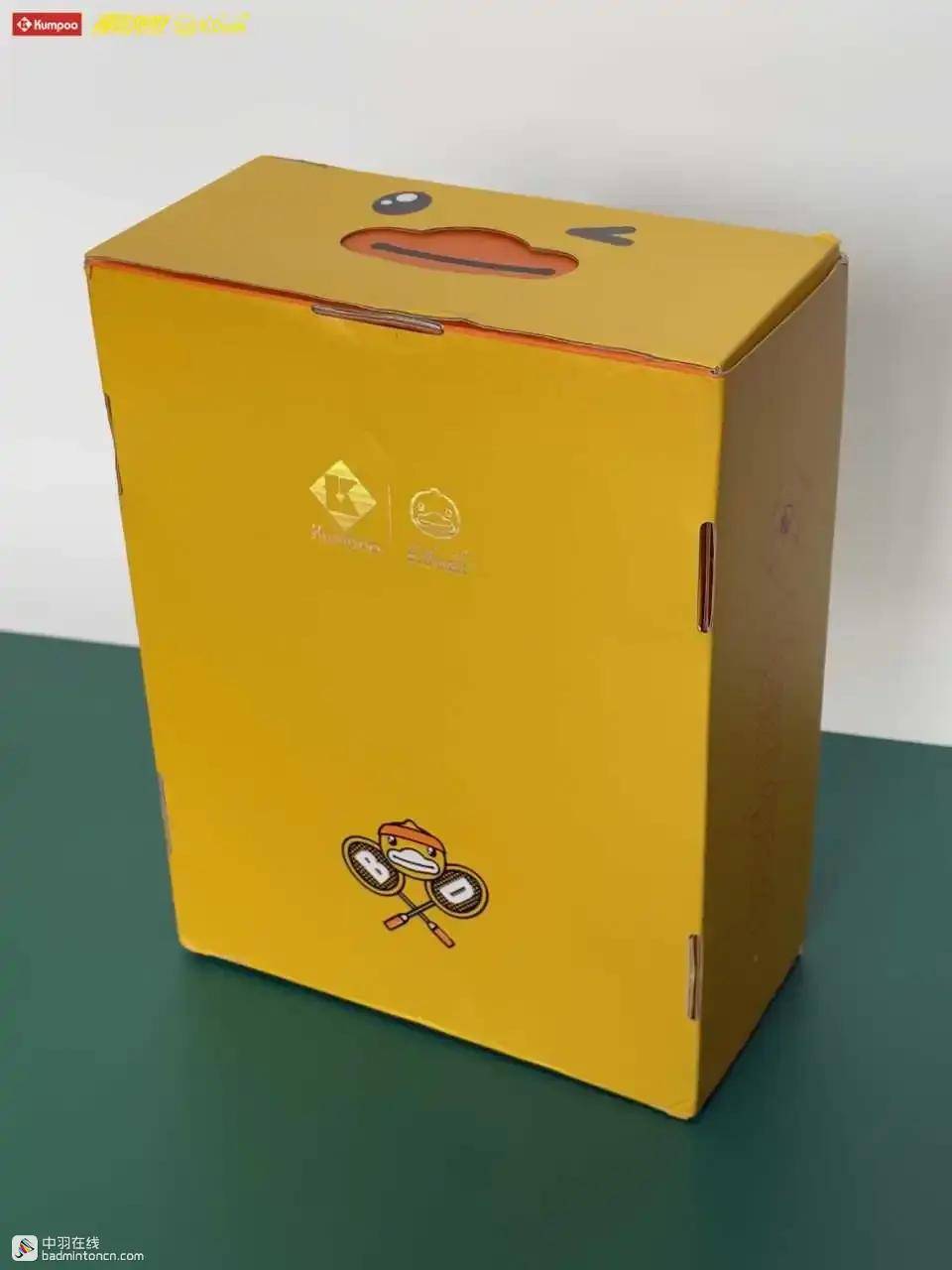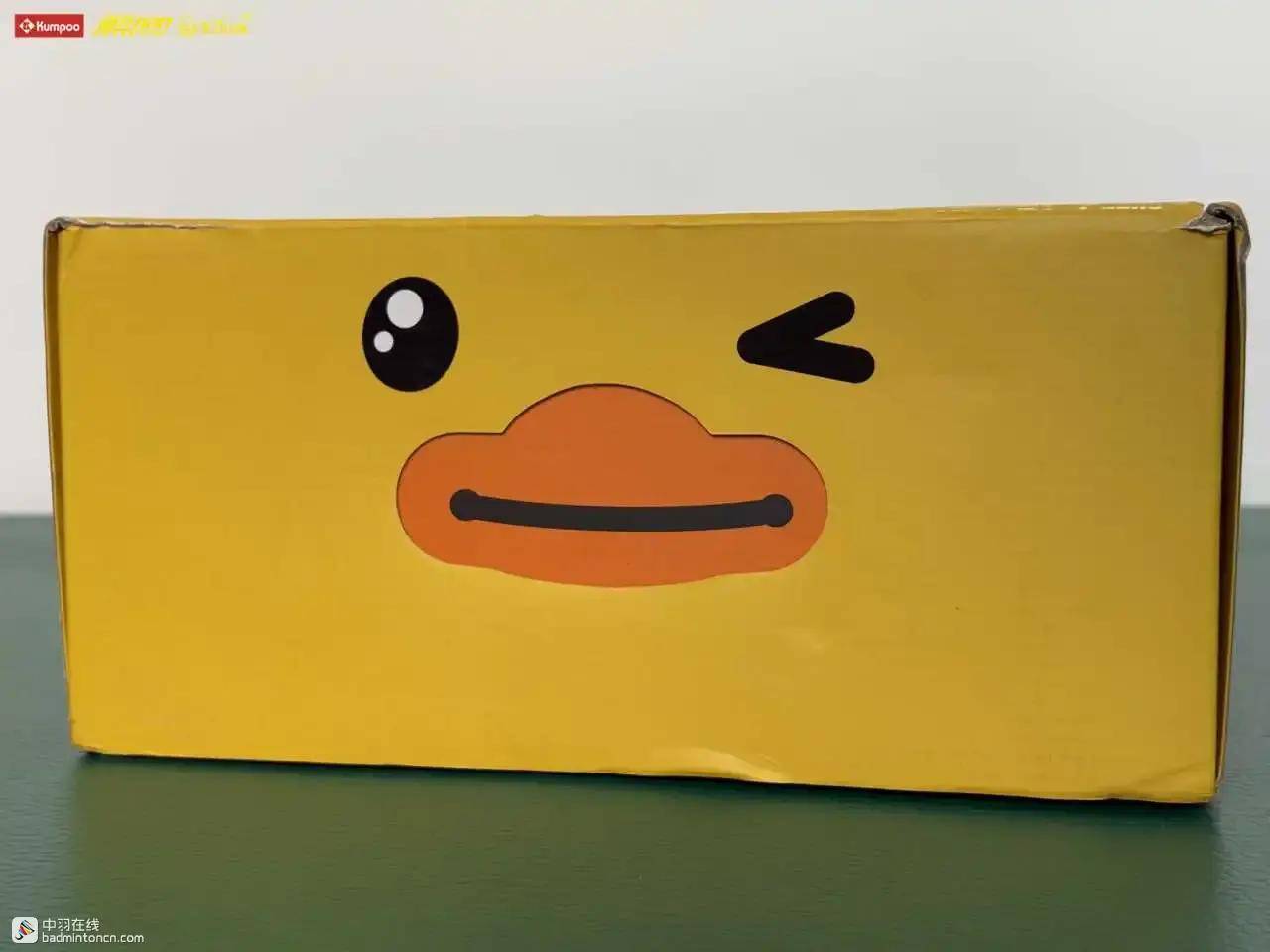 鞋盒采用的是手提的设计,通过上方翻盖的方式打开,内外大量采用带有小黄鸭和薰风品牌元素的图案设计,如正面的薰风LOGO以及标志性的小黄鸭头像,以及侧面由橙色线条勾勒的且融入小黄鸭头像的薰风LOGO和品牌名称“Kumpoo”字样、硕大的小黄鸭表情图案,还有底面的小黄鸭与球拍图案等等。