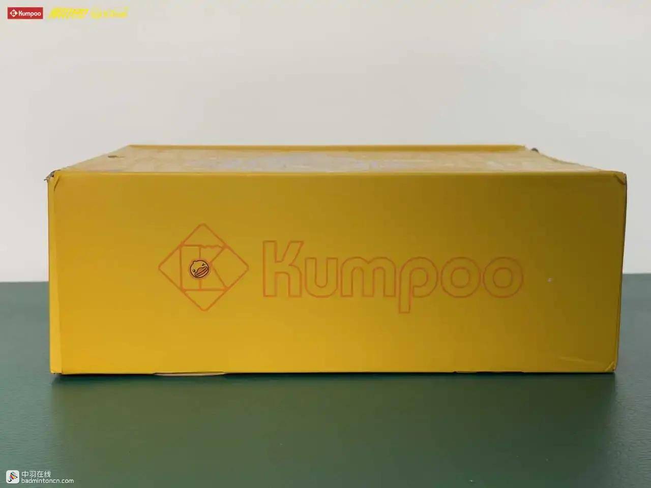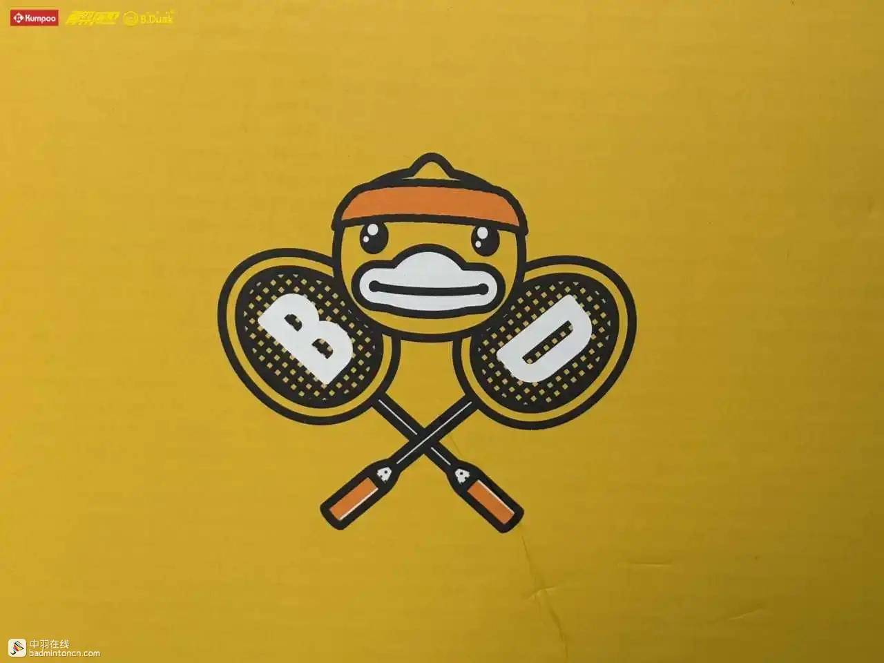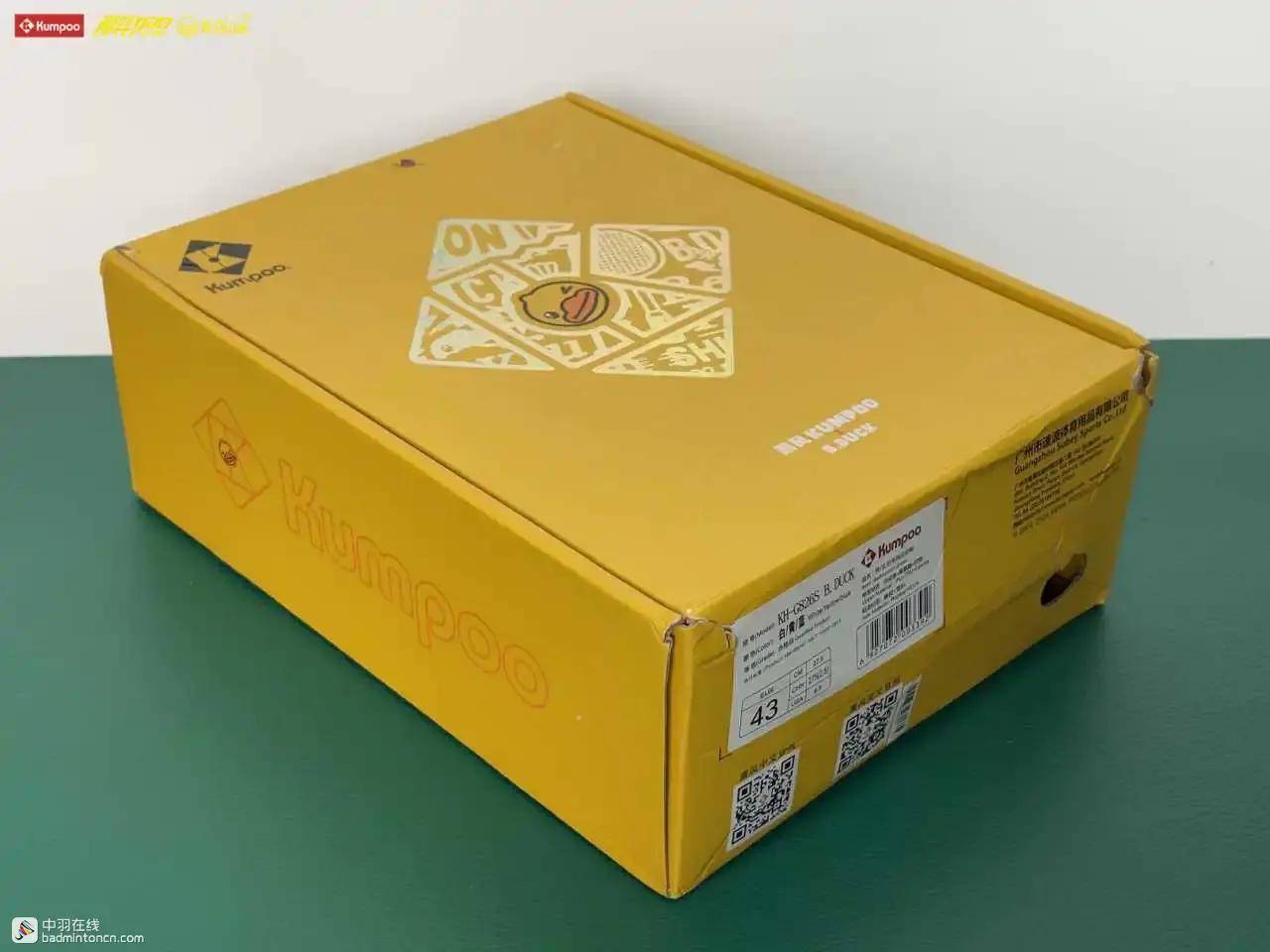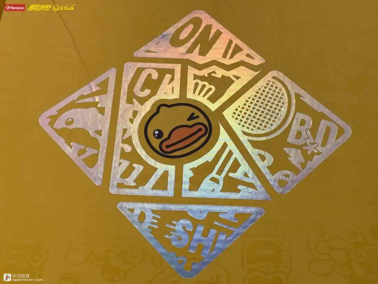 鞋盒采用的是手提的设计,通过上方翻盖的方式打开,内外大量采用带有小黄鸭和薰风品牌元素的图案设计,如正面的薰风LOGO以及标志性的小黄鸭头像,以及侧面由橙色线条勾勒的且融入小黄鸭头像的薰风LOGO和品牌名称“Kumpoo”字样、硕大的小黄鸭表情图案,还有底面的小黄鸭与球拍图案等等。