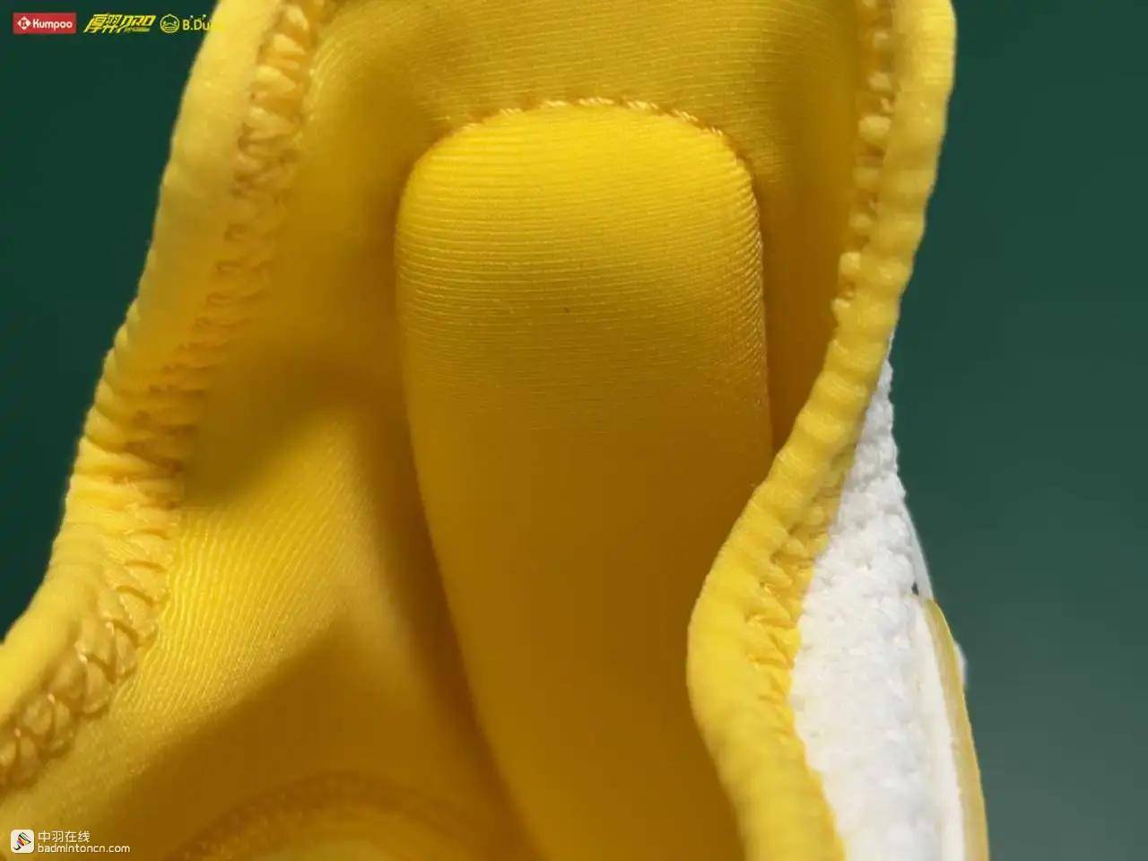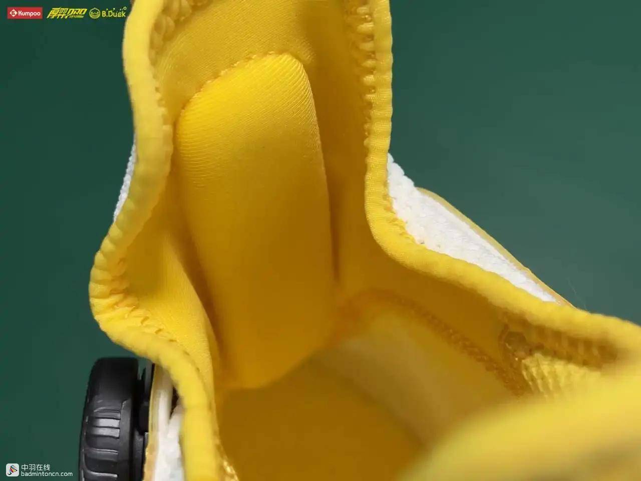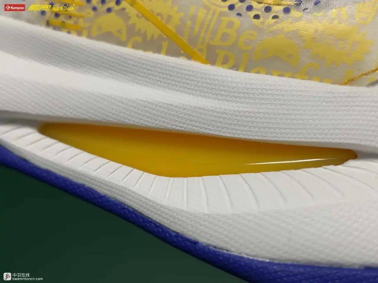 厚羿PRO 小黄鸭鞋内部空间相比一般的标准楦球鞋要偏大一些,笔者平时多穿鞋码为内长275mm,相同码数下,搭配薰风×小黄鸭联名款球袜KSO-415 B. DUCK,脚面的包裹不够紧实,前掌周围以及足弓两侧均有些许空间。相比同码数的厚羿,厚羿PRO 小黄鸭上脚的包裹感要显得略微空一些。因此厚羿PRO 小黄鸭可能会更适合脚型偏宽的球友穿着,对于其他球友,建议搭配厚一些的球袜来改善整体的包裹、让脚在鞋内达到一个稳定的锁定状态,实战中也会更加安全。