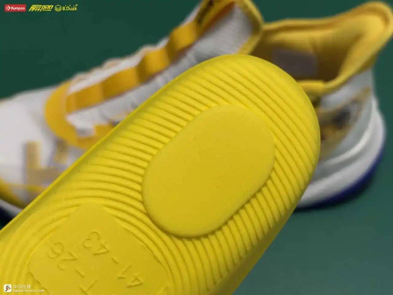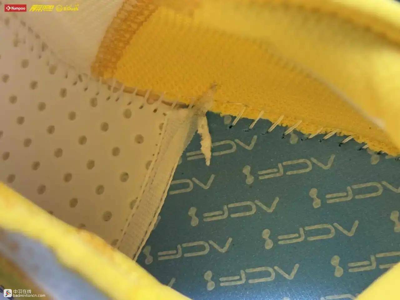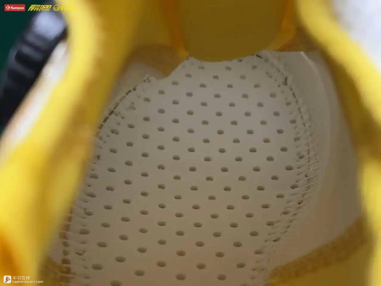 厚羿PRO 小黄鸭鞋内部空间相比一般的标准楦球鞋要偏大一些,笔者平时多穿鞋码为内长275mm,相同码数下,搭配薰风×小黄鸭联名款球袜KSO-415 B. DUCK,脚面的包裹不够紧实,前掌周围以及足弓两侧均有些许空间。相比同码数的厚羿,厚羿PRO 小黄鸭上脚的包裹感要显得略微空一些。因此厚羿PRO 小黄鸭可能会更适合脚型偏宽的球友穿着,对于其他球友,建议搭配厚一些的球袜来改善整体的包裹、让脚在鞋内达到一个稳定的锁定状态,实战中也会更加安全。