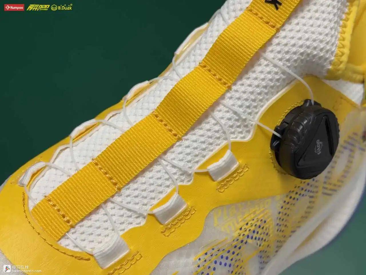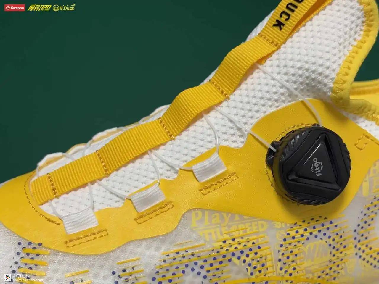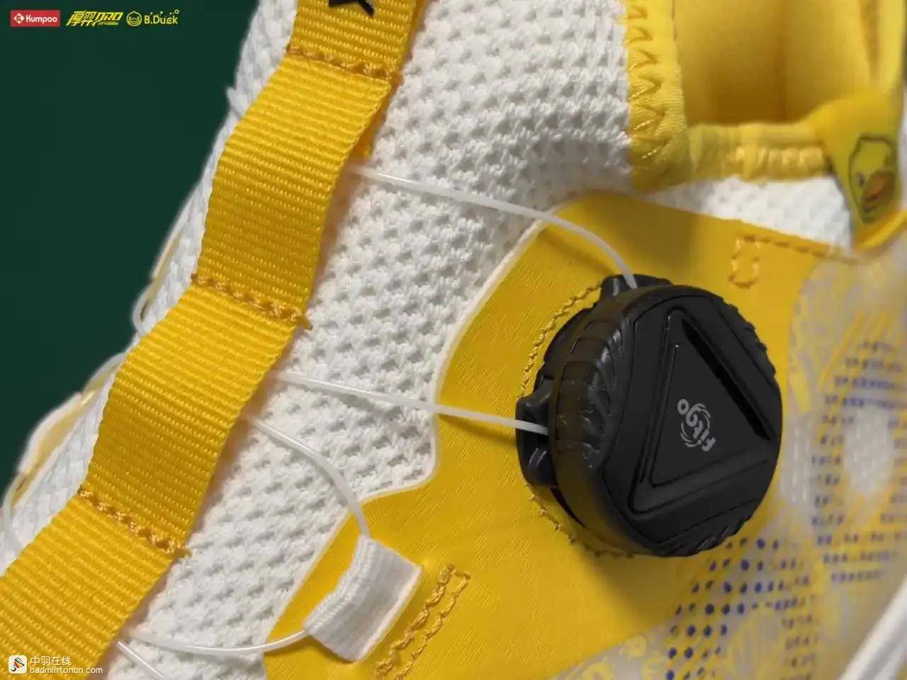 厚羿PRO 小黄鸭采用飞扣系统(Fitgo),搭配动态绑缚式设计的鞋带孔,让穿脱过程变得更为方便快捷。