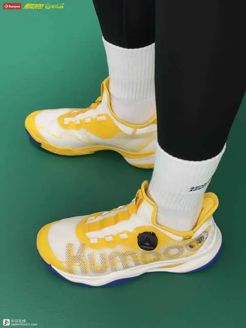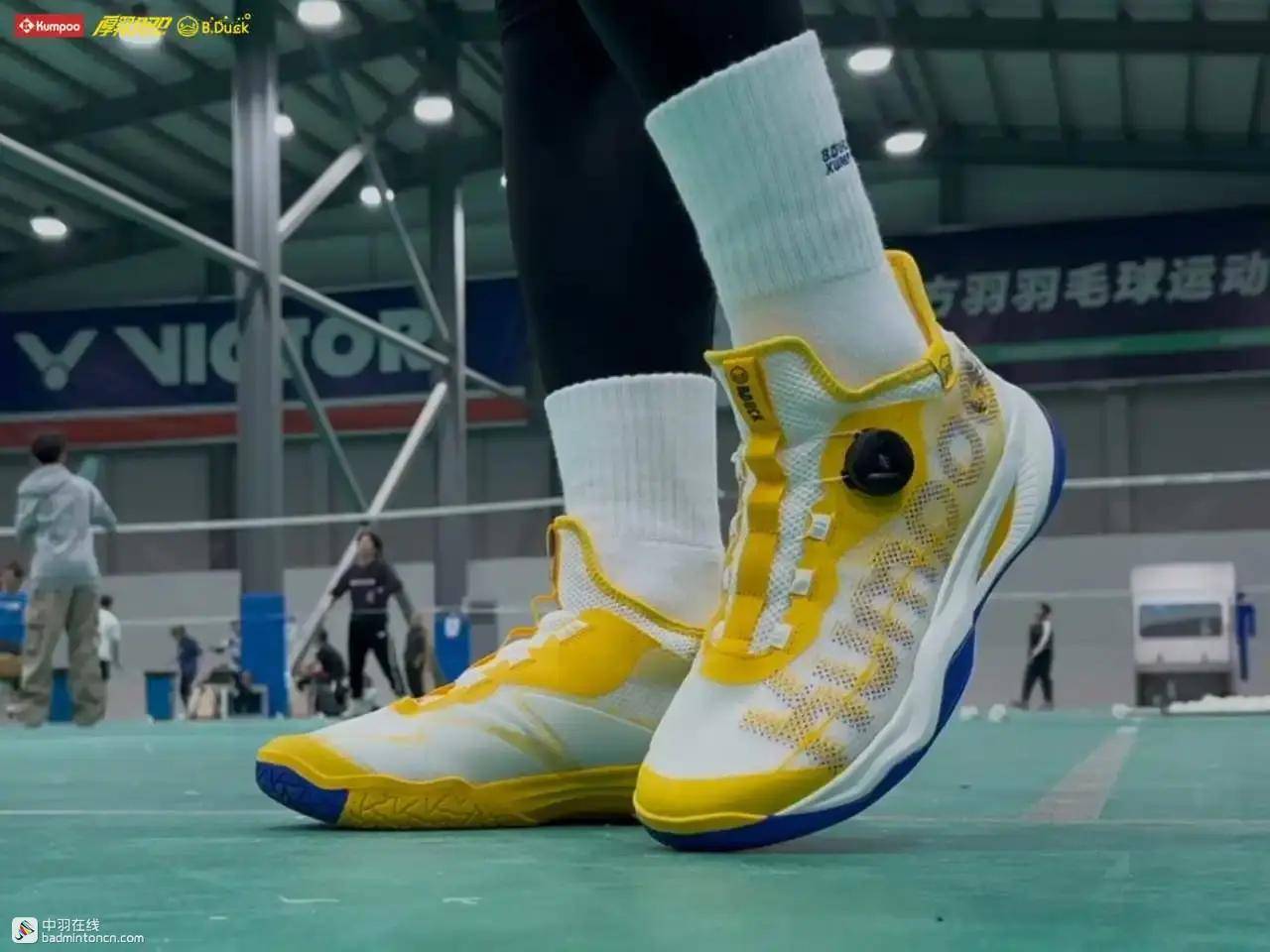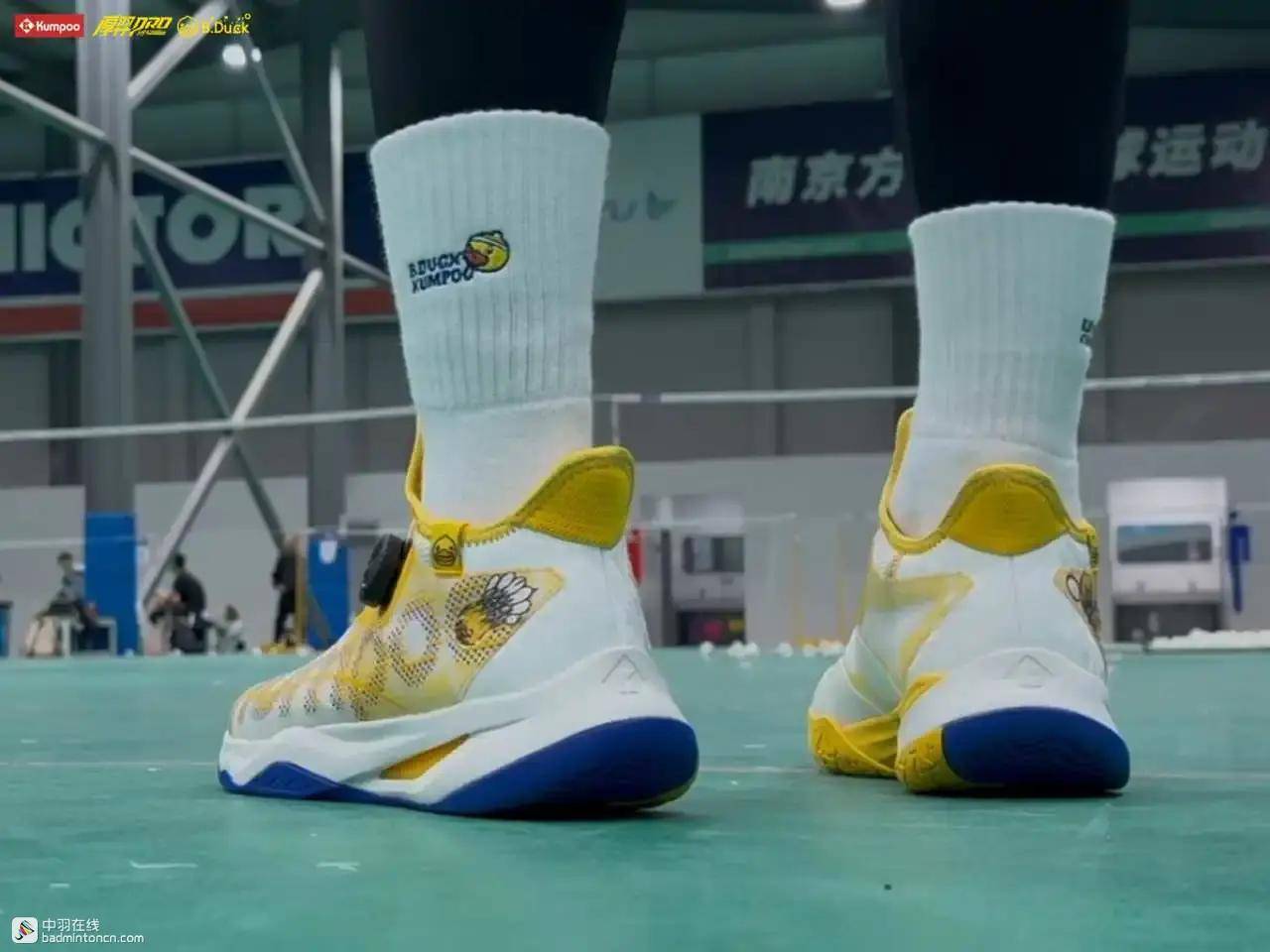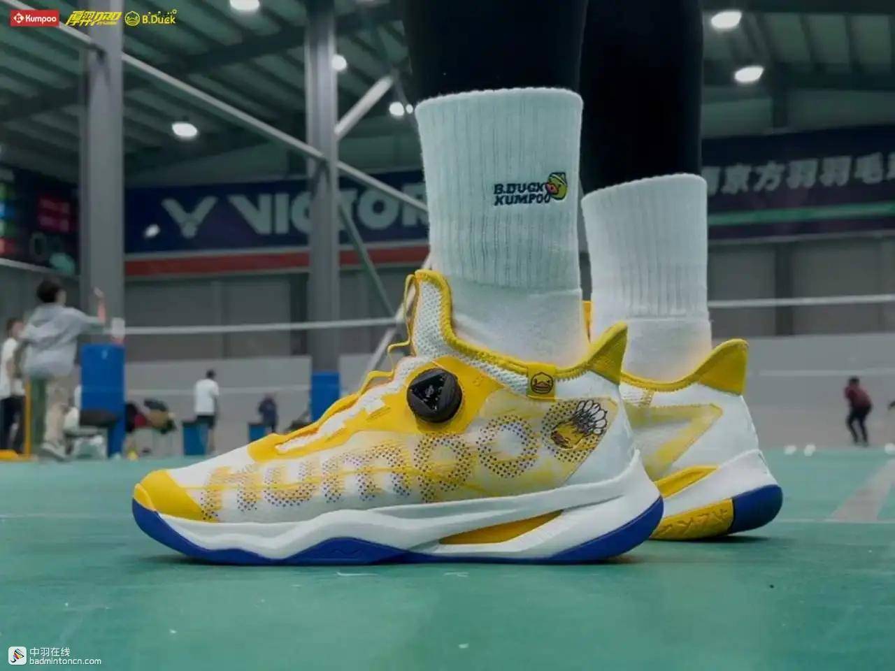 提起小黄鸭(B. DUCK),相信各行各界都有所耳闻,这一令中国人骄傲的IP形象自二十年前正式诞生以来,可谓是广受欢迎和喜爱,它由中国香港设计师Eddie创造,始于从小黄鸭漂流故事中汲取的灵感,承载着为孩子们带来乐趣的初衷,二十年来传播的不仅仅是可爱的IP角色形象,更是深入人心的正能量。从诞生到无人不晓,二十年的“冒险”之路上,小黄鸭衍生出多种不同的造型,与各界品牌展开联名合作,创造了许许多多令人印象深刻的产品。而2024年薰风和小黄鸭的联名合作,让这只家喻户晓的黄色小鸭子第一次走进羽毛球的领域。2024年9月初,薰风×小黄鸭联名全系列产品正式发售,包括羽毛球拍、羽毛球鞋、服装、拍包和多种羽毛球运动配件。今天本文的主角就是其中的这双厚羿PRO 小黄鸭(KH-G826S B. DUCK)。