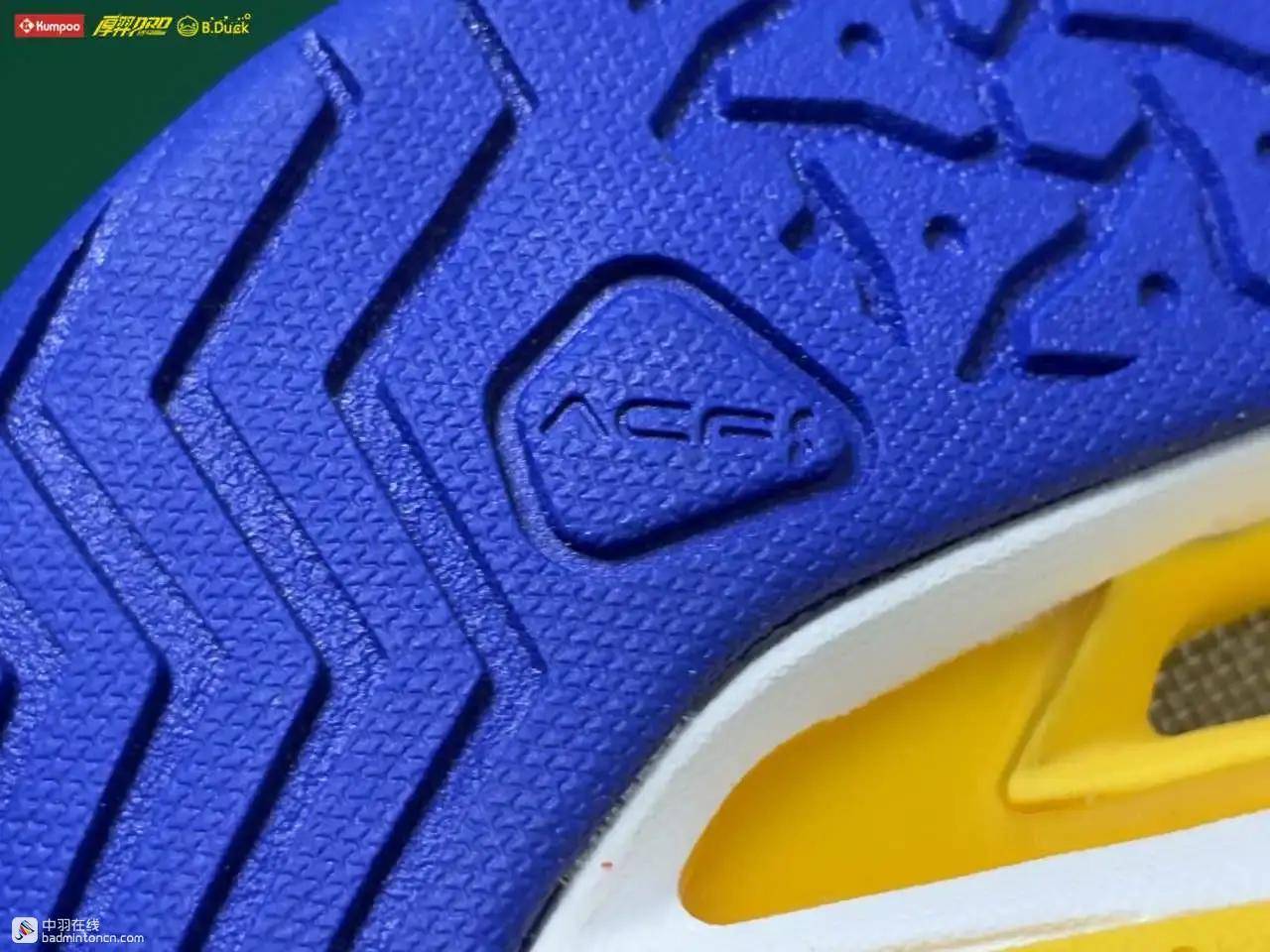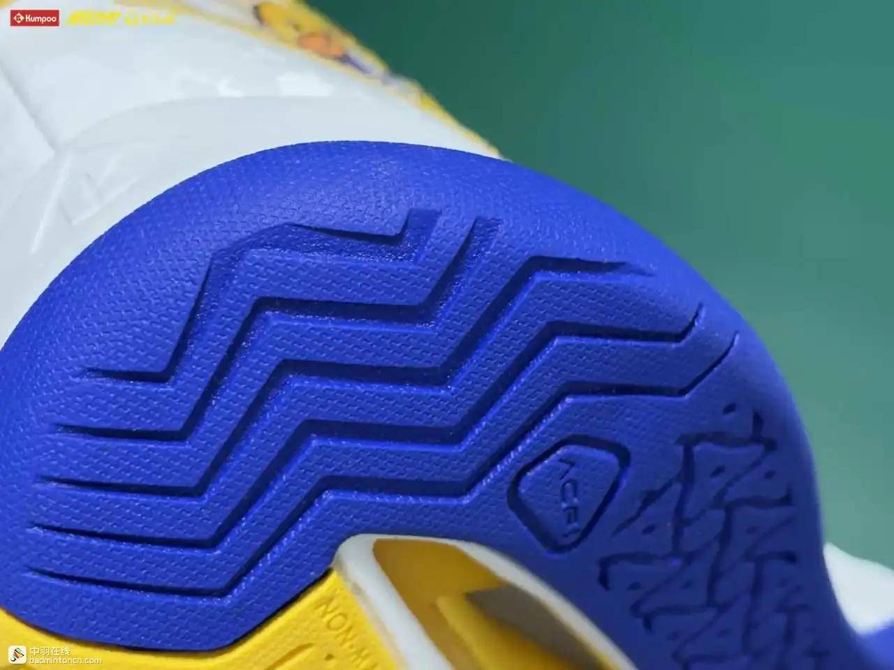 在上网以及后场被动步伐中,弓箭步落地时脚后跟处的缓震也做得相当足,有效减轻了脚踝处由于落地冲击带来的负荷,为脚踝带来了舒适的体验。