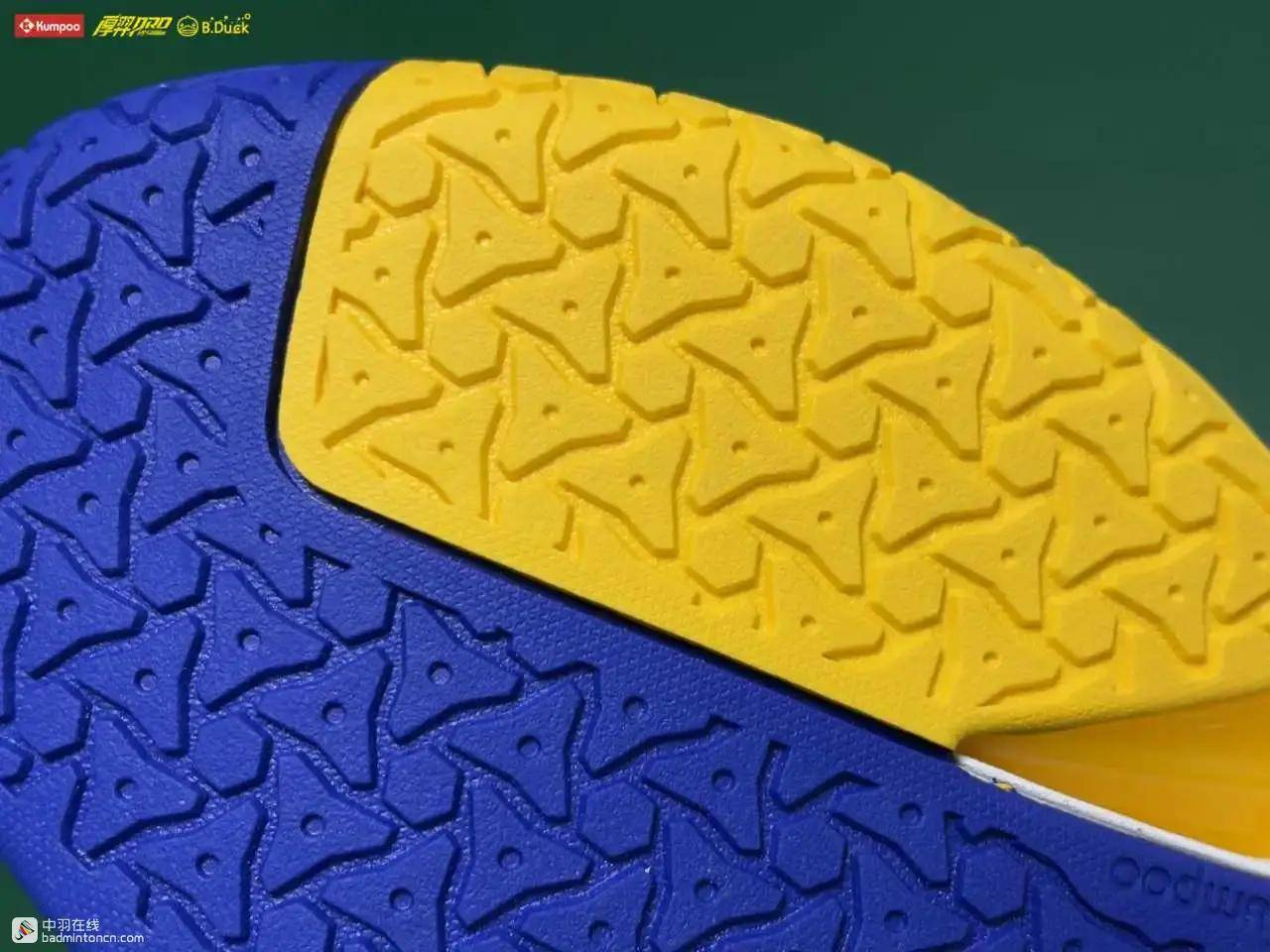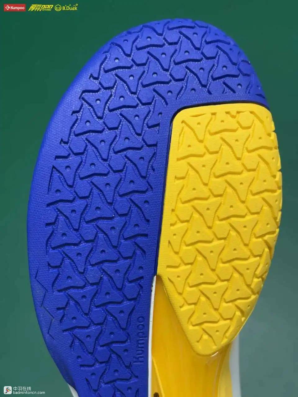 厚羿PRO 小黄鸭采用实色防滑橡胶,以及特殊设计的三角形防滑纹路,提供稳定的抓地力,蓝黄两色区分抓地区域。