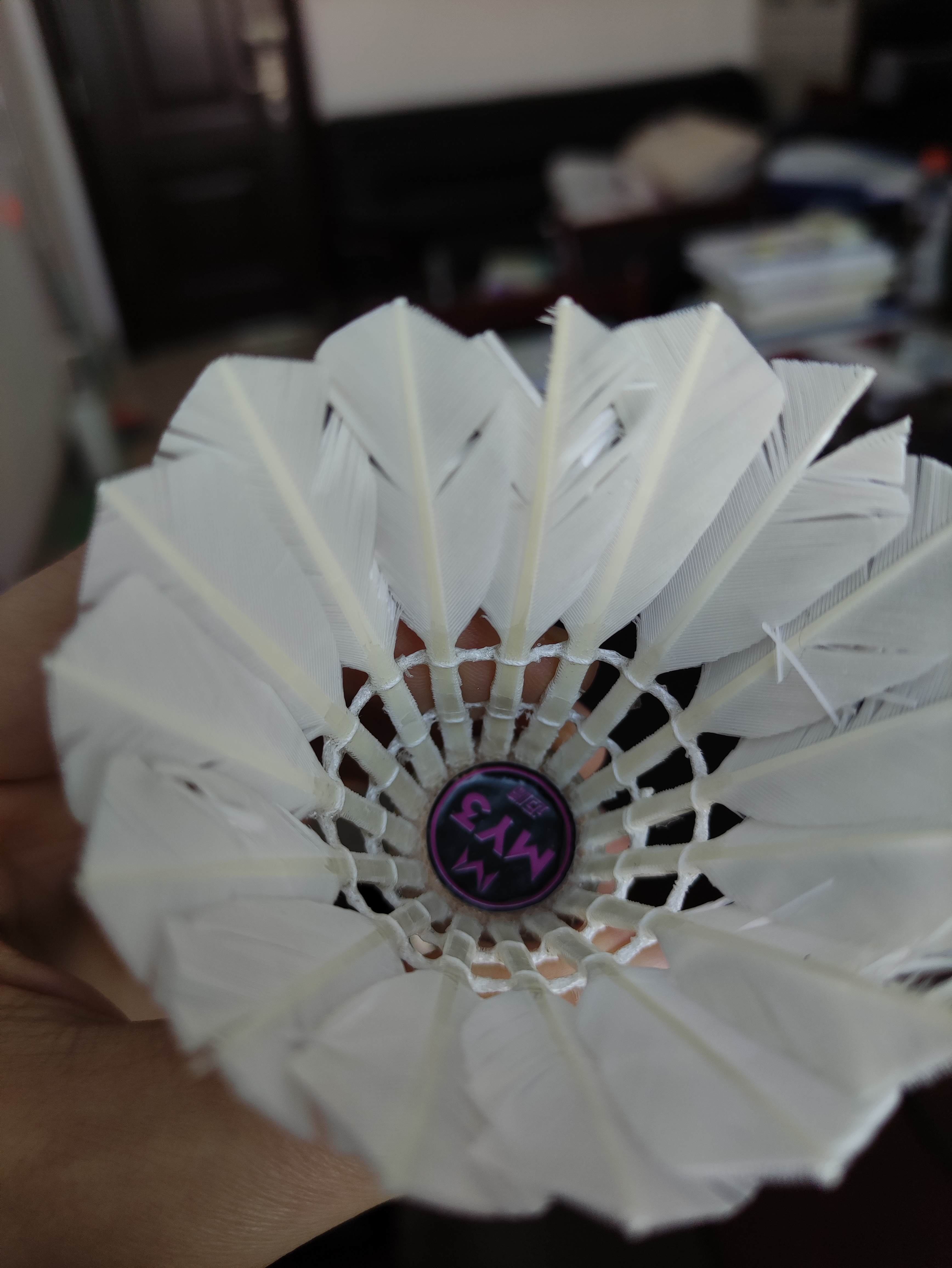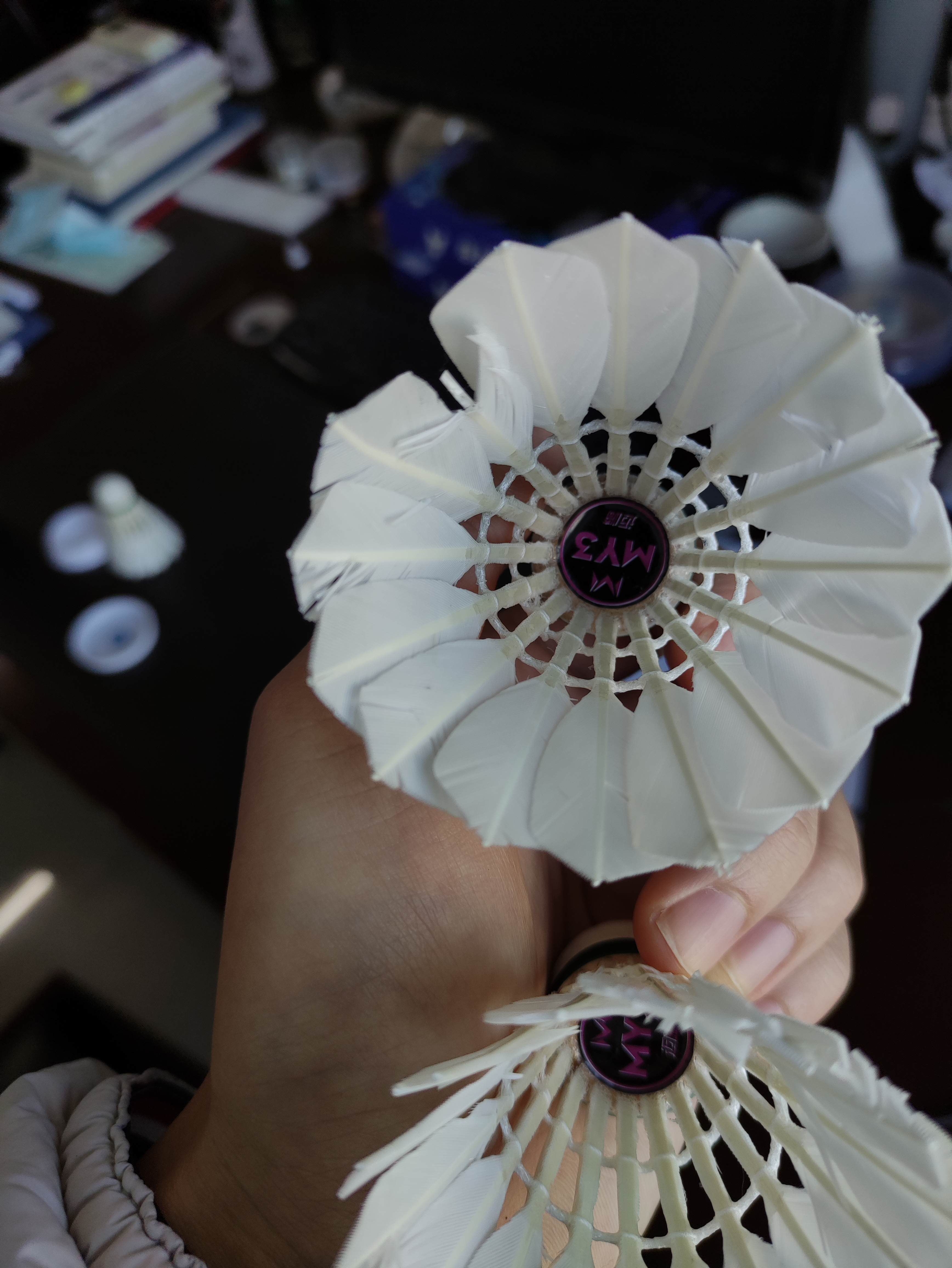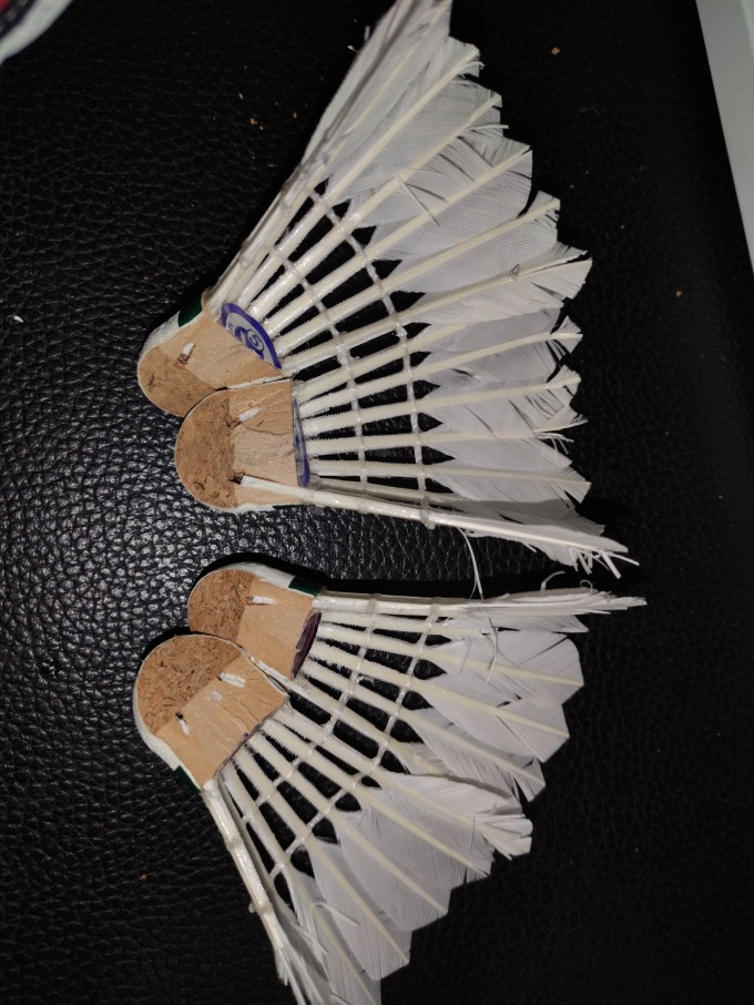 实际表现:三个字形容,轻快弹。被动球飞行距离远。耐打性是大师3的一大优势,虽然球头是复合双拼(在百元鹅毛球中,其实少有不用天然软木二拼、三拼甚至全软木的了),但从硬度和形状保持来看都相当不错;不易断毛,体现在断1根毛甚至未断毛之前,毛杆被拍框砸了很多次而未变形或折断,到折断1根毛为止能坚持2.5-3局男双。这是2局之后的样子: