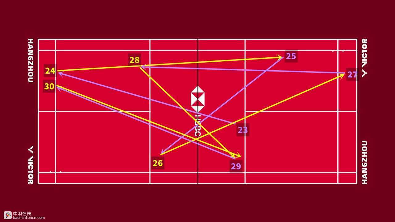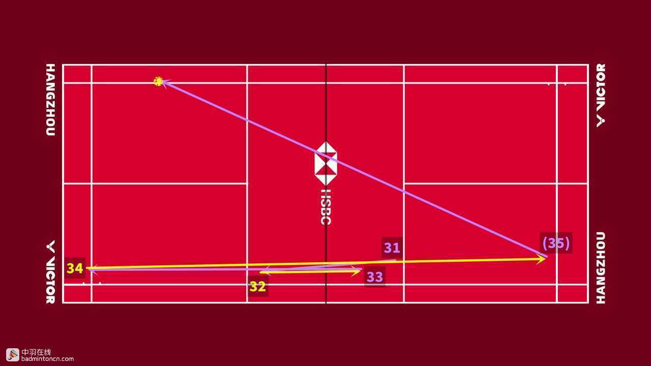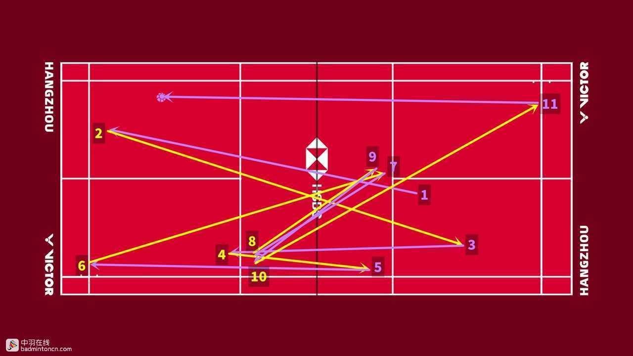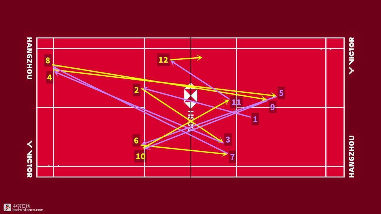 石宇奇非常耐心,前三次头顶区回球都采取软压中路,目的在于迅速连贯,拿住网前。第三次下压后,安赛龙做出变化,不再挡网,而是回顶石宇奇头顶后场,石宇奇借力发起进攻,先突击直线,再杀对角,通过两侧较开的落点拉扯安赛龙。