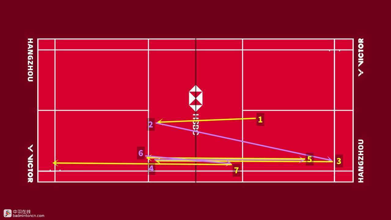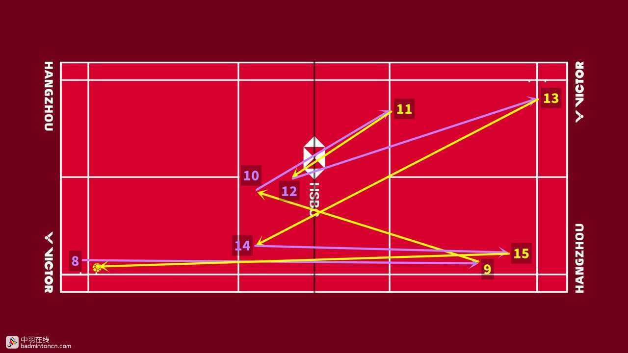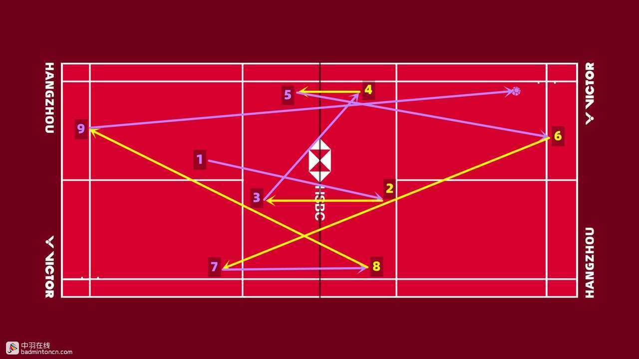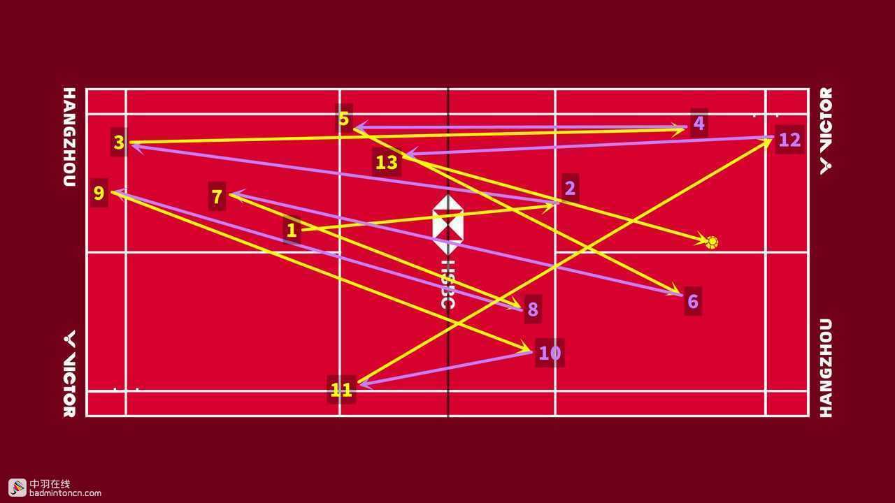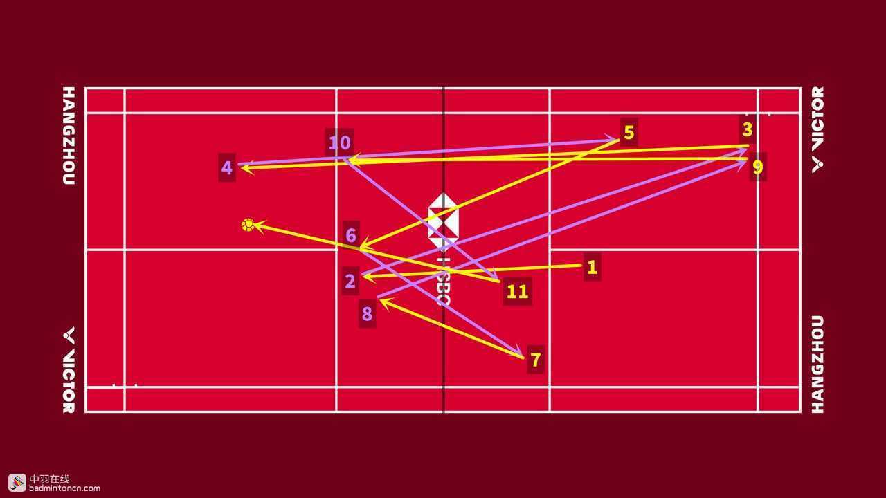 石宇奇非常耐心,前三次头顶区回球都采取软压中路,目的在于迅速连贯,拿住网前。第三次下压后,安赛龙做出变化,不再挡网,而是回顶石宇奇头顶后场,石宇奇借力发起进攻,先突击直线,再杀对角,通过两侧较开的落点拉扯安赛龙。