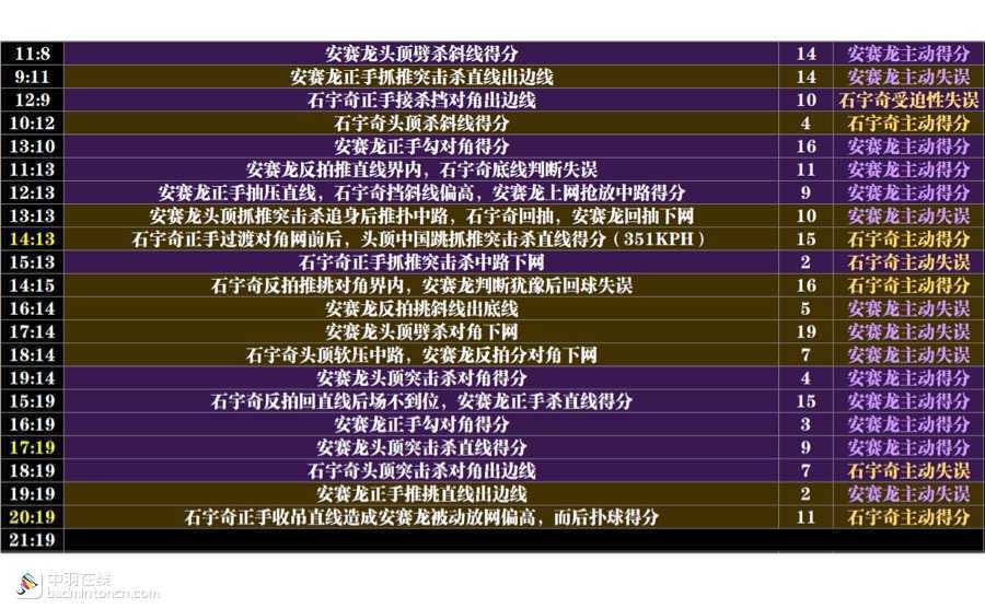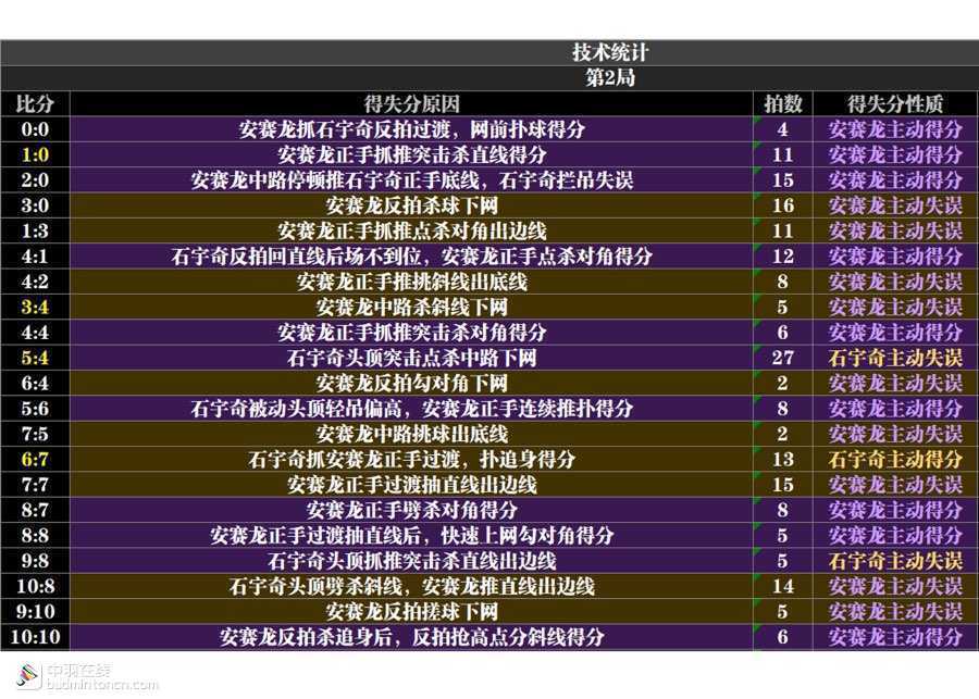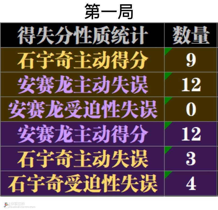 两局比赛中,安赛龙的主动得分率一直很高,这体现了其强大的进攻能力,但比赛考量的是综合发挥,石宇奇在失误控制方面明显更出色,每局几乎都能凭借更少的失误拉开十分左右的分差,这是最终获胜的关键原因之一。