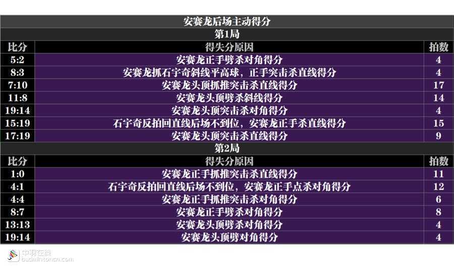 纵观整场比赛,安赛龙的主动得分其实并不少,甚至高于石宇奇,这说明其进攻威胁并非没有发挥出来,相反其利用自身身高臂长、抓推能力强的优势,屡屡通过擅长的突击、劈杀、点杀得分。