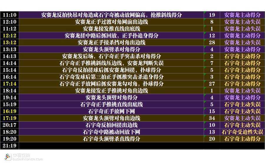 第一局,石宇奇从0:0开局到21:19拿下最后一分,全程处于领先。开局阶段,安赛龙对比赛的适应明显不够理想,主动失误非常多,石宇奇迅速建立领先优势,取得10:5的开局,并以11:8进入局休。