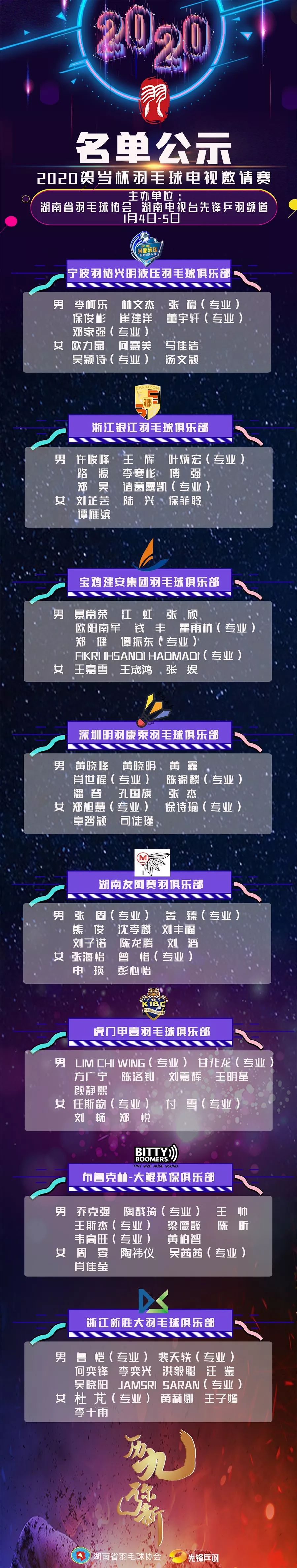 最终受邀参加2020年贺岁杯羽毛球电视邀请赛的八支参赛队伍为: 宝鸡建安集团羽毛球俱乐部 湖南友阿赛羽羽毛球俱乐部 宁波兴明液压俱乐部 布鲁克林-大鲲环保俱乐部 浙江新胜大羽毛球俱乐部 浙江银江羽毛球俱乐部 虎门甲壹羽毛球俱乐部 深圳明羽康泰羽毛球俱乐部