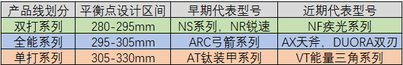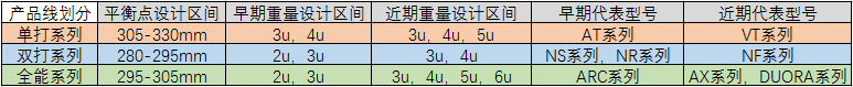 全面系列球拍:犹如兵器中的大刀,重剑,重心位置略靠前,灵活性和杀伤性介于前面二者之间,单双打都能胜任。平衡点参数一般设计在295-305mm区间。这个系列早期一般只设计生产2u和3u参数,随着这几年轻量化趋势发展,现在也会推出4u甚至5u。以yonex为例,早期是arcsarber系列(arc弓箭系列),弓箭系列停产后由ASTROX(天斧系列)接替。其实双刃(DUORA)系列也是全能系列一员,只是由于其独特的异面框型,所以被分出去单独成为一个系列。