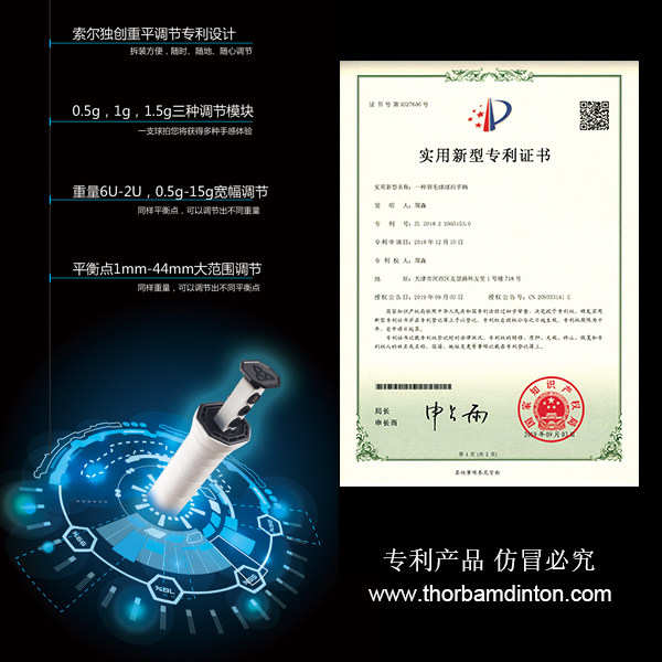 索尔根据球拍生产过程中,木柄钻孔调节重平的原理,设计出全新专利产品,让每个球友都可以拥有一把专属的独门兵器。