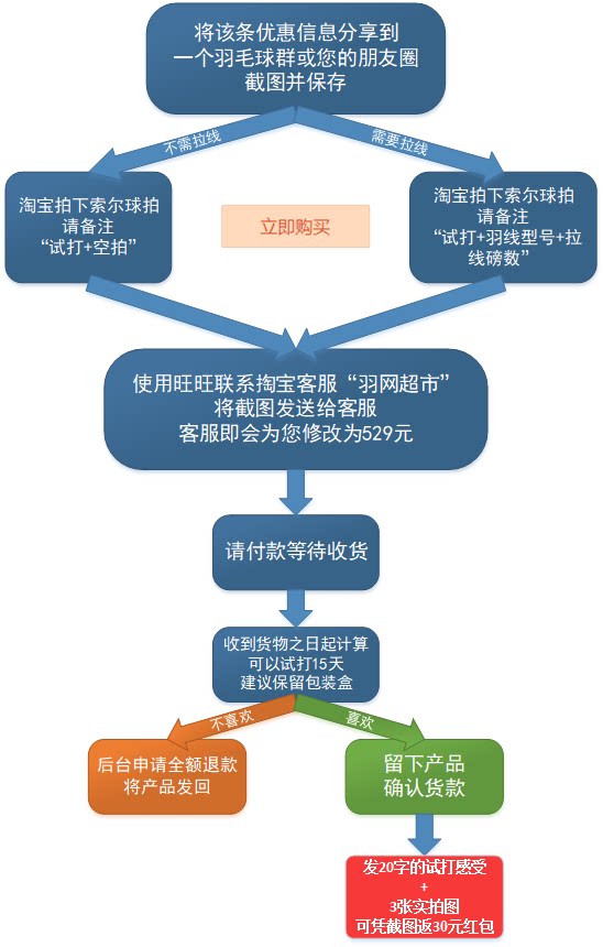 1.将该条优惠信息分享到一个羽毛球群或分享到您的朋友圈,截图并保存。2.淘宝拍下索尔产品,若无需拉线,请备注“试打+空拍”,若需要拉线请备注“试打+羽线型号+拉线磅数”。3.使用旺旺联系客服“羽网超市”,将截图发送给客服,客服即会为您修改为529元。4.请付款等待收货。5.收到货之日起,可以试打15天,建议保留包装盒。6.喜欢:留下产品,确认货款,发20字的试打感受+3张实拍图,可凭截图返30元红包,找微信客服thorbadminton领取。7.不喜欢,后台申请全额退款,将产品发回。