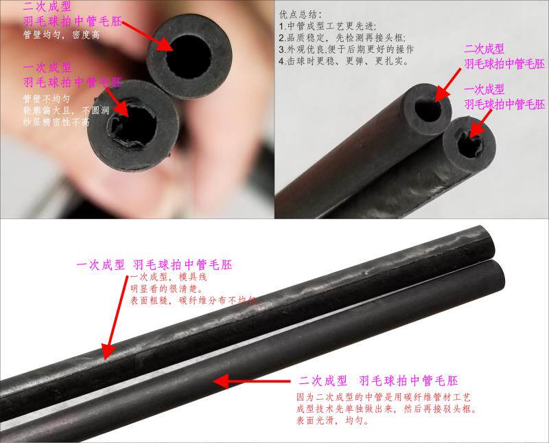 一般来说,头框加上中杆的毛胚重量(不含拍柄)在35-44g(35g就是一条小包装的士力架的净重)范围,也就是球拍生产过程中碳砂的调整范围区间不到10g。并且由于球拍头框和中杆管壁做的太薄会影响耐用度,而做得太厚弹性性能会降低,所以实际设计产品时候,碳砂重量可调整的范围更小。