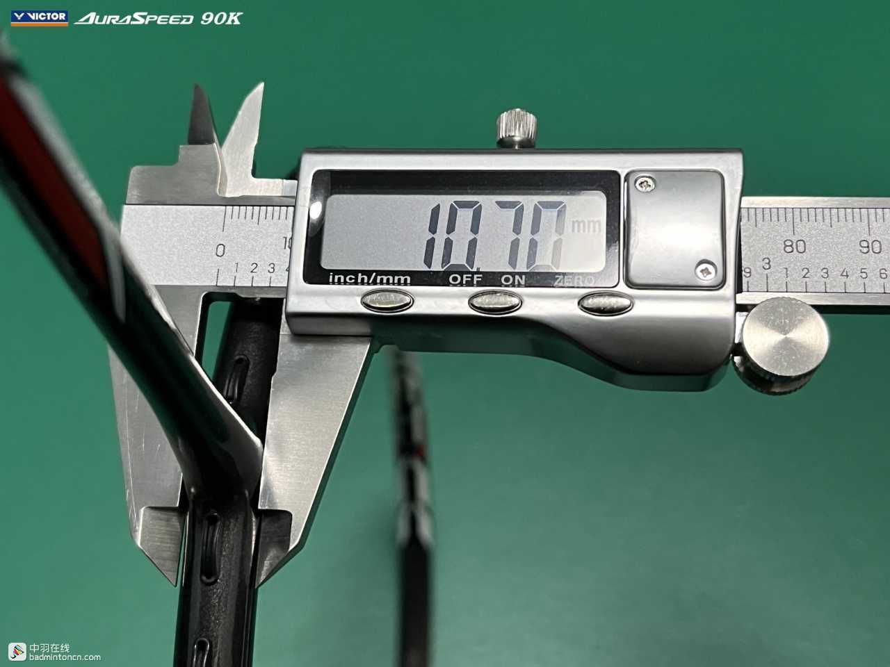 经实际测量得ARS-90K的拍身总长为672mm,其中,拍框长度约255mm,中杆(锥盖顶部至T头两侧最下方线孔处)长度约210mm,手柄(底盖至锥盖顶部)则约为207mm,属于中杆和手柄均为标准长度的大拍面球拍。