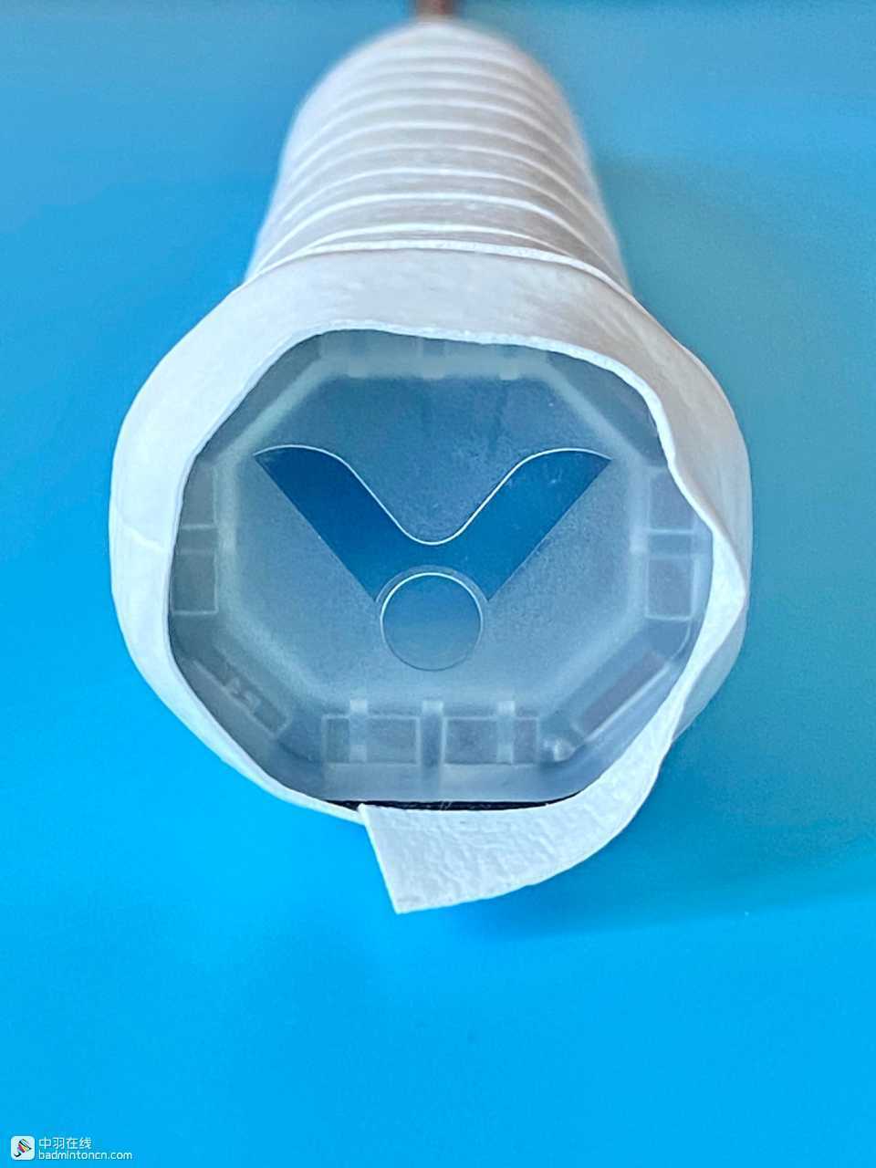 手柄当然是最新纳米尼龙材料的悬浮柄,锥盖为半透明暗灰色,底盖是全透明白色,透过锥盖能够看到里面的红色力量环,这项技术在之前上市的神速100x上面也有使用,可以使中杆与悬浮手柄更好的结合,释放更加扎实的打感。