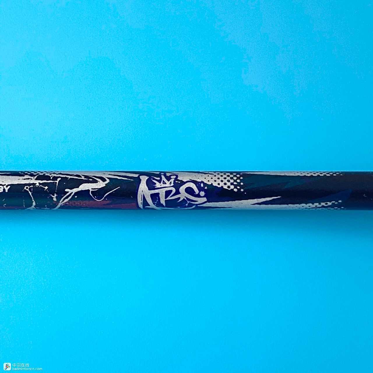 先看外观,拍框涂装以黑蓝为主色,整体上还是保持对称式设计,只在十点钟方向额外增加了玫粉色RTC字母(胜利拍框加强技术,迅弹传导结构,可以加强拍框的反弹性能,有效提升击球的质量和速度),拍身多处有亮白色与暗紫色的闪电状纹路,可能有快若闪电的寓意吧。