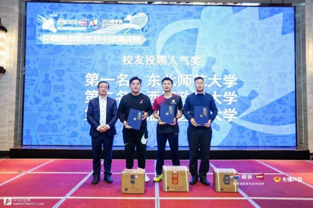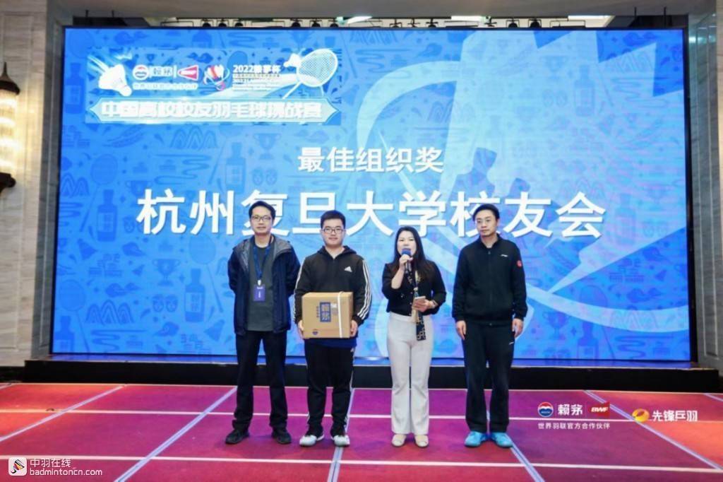 颁奖晚宴上,校友们欢聚一堂,以杯酒致敬赛场荣耀,追忆往日校友情、结交新朋。宴会上还颁发了比赛之外的其他奖项,杭州复旦大学校友会获得最佳组织奖,东北师范大学校友会、西南政法大学校友会、温州医科大学校友会获得最佳人气奖。赖茅酒业品牌部相关负责人表示,赖茅于2018年牵手世界羽联,以推广羽毛球运动文化、倡导健康的生活、鼓励全民健身为己任,一直致力于支持国际大型赛事、组织开展各领域的业余羽毛球赛事,并在2020年成立了“赖茅爱羽成长”少儿羽毛球发展公益基金,积极投身羽毛球公益事业。