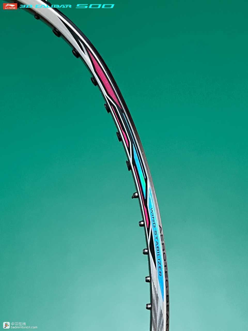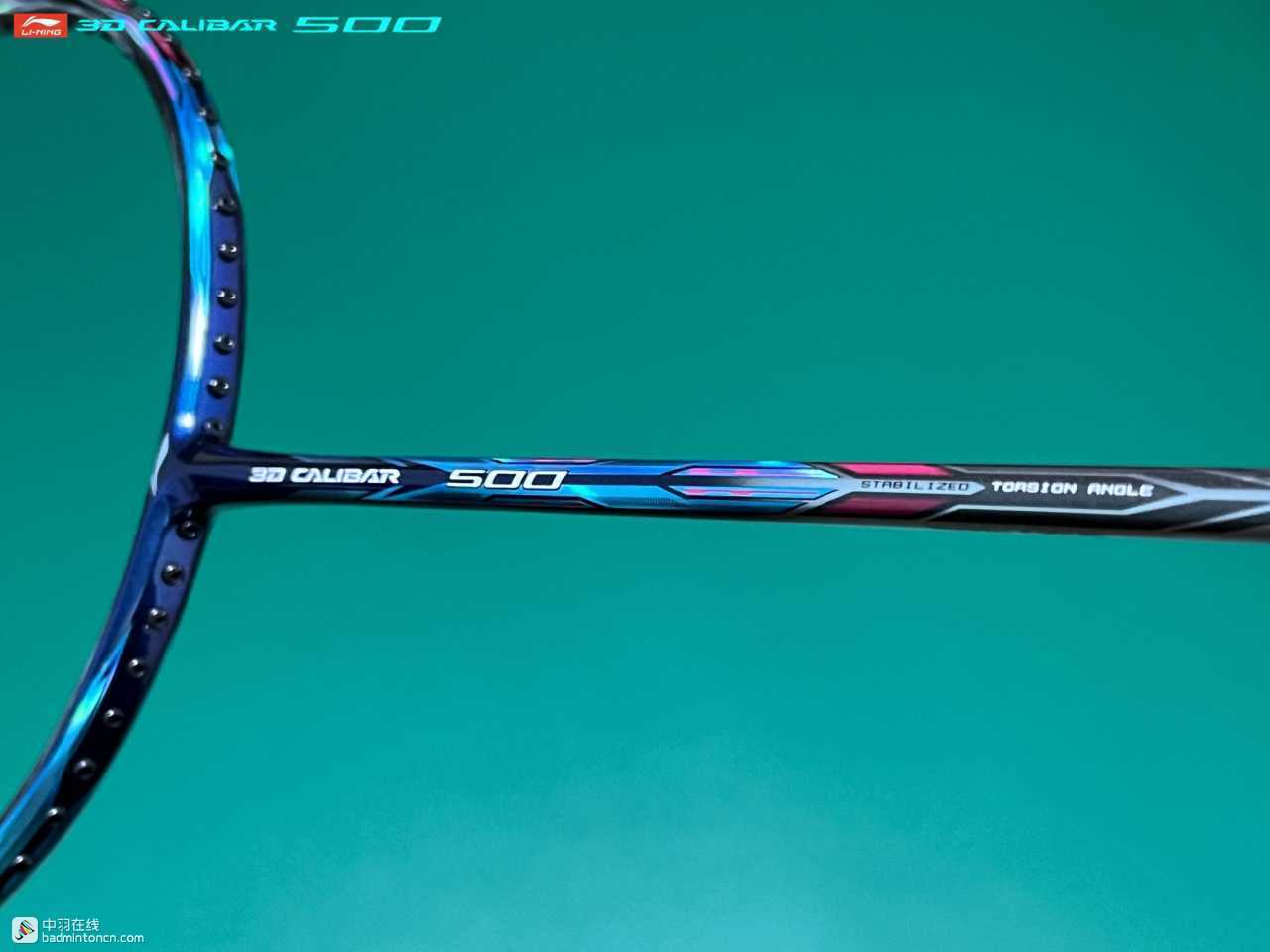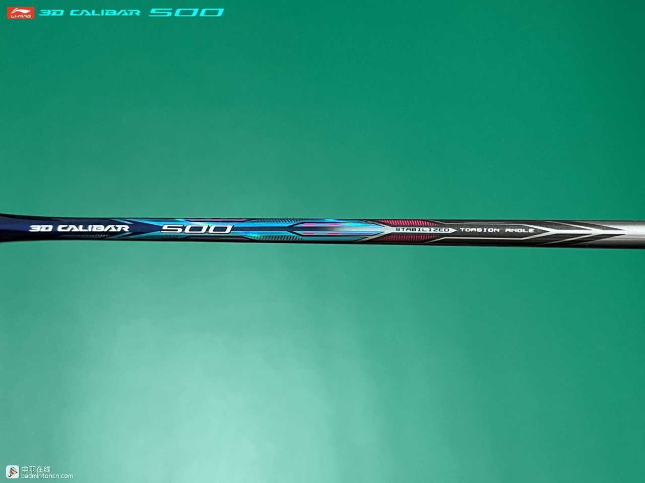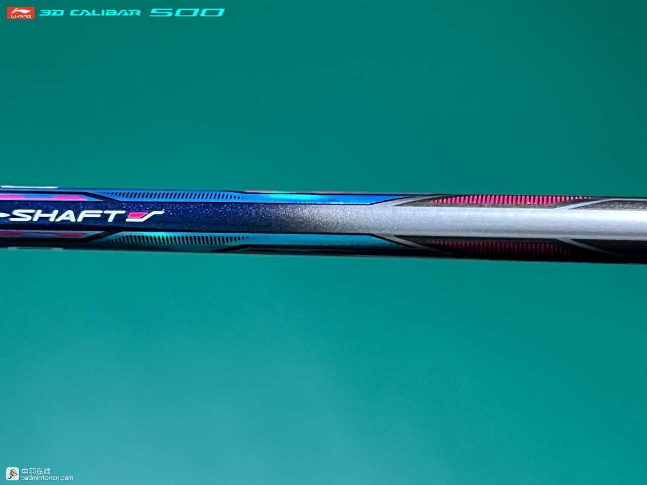 中杆上半部分采用了和拍框上一样的湖蓝色贴纸,簇拥着中间的型号名称“3D CALIBAR 500”字样。下半部分则以深灰色和玫红色承接,所有的图案设计以直线为主,尽显锋芒。