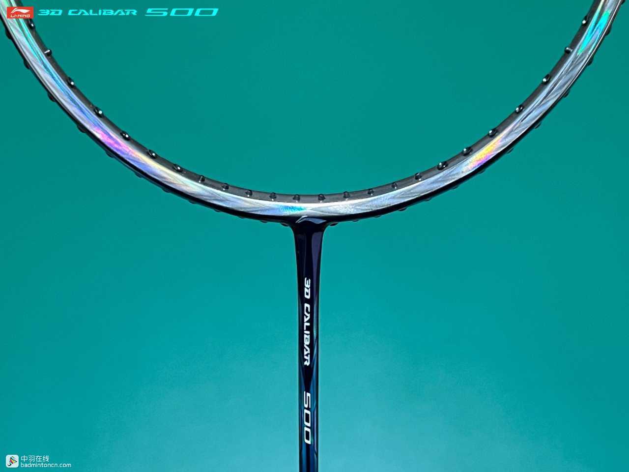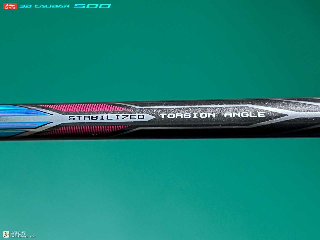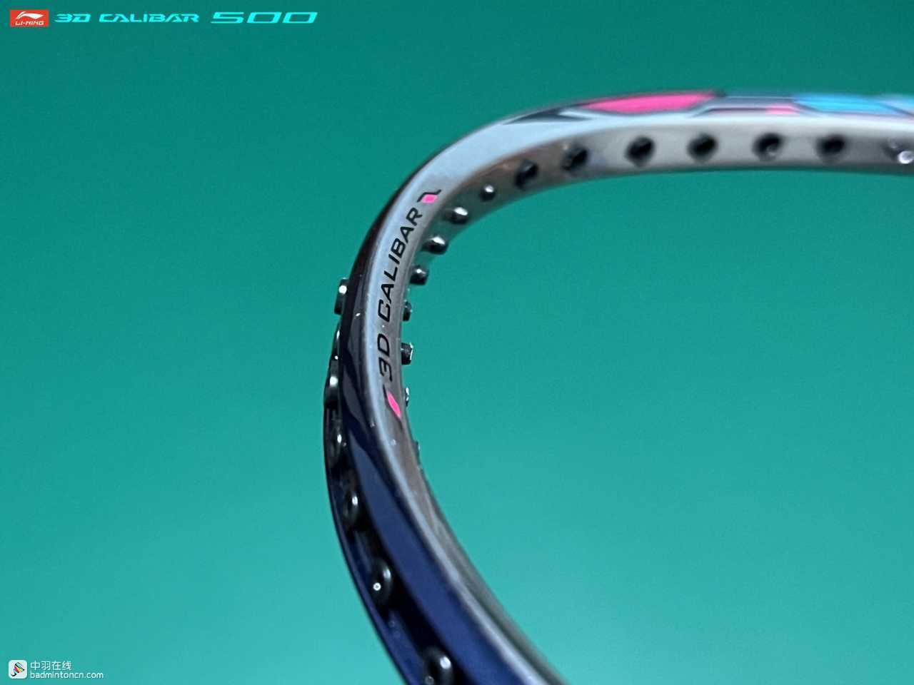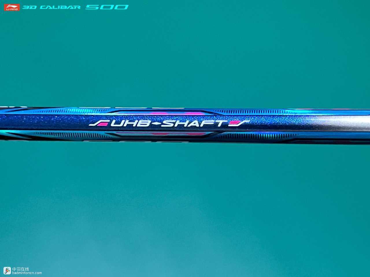 中杆上半部分采用了和拍框上一样的湖蓝色贴纸,簇拥着中间的型号名称“3D CALIBAR 500”字样。下半部分则以深灰色和玫红色承接,所有的图案设计以直线为主,尽显锋芒。