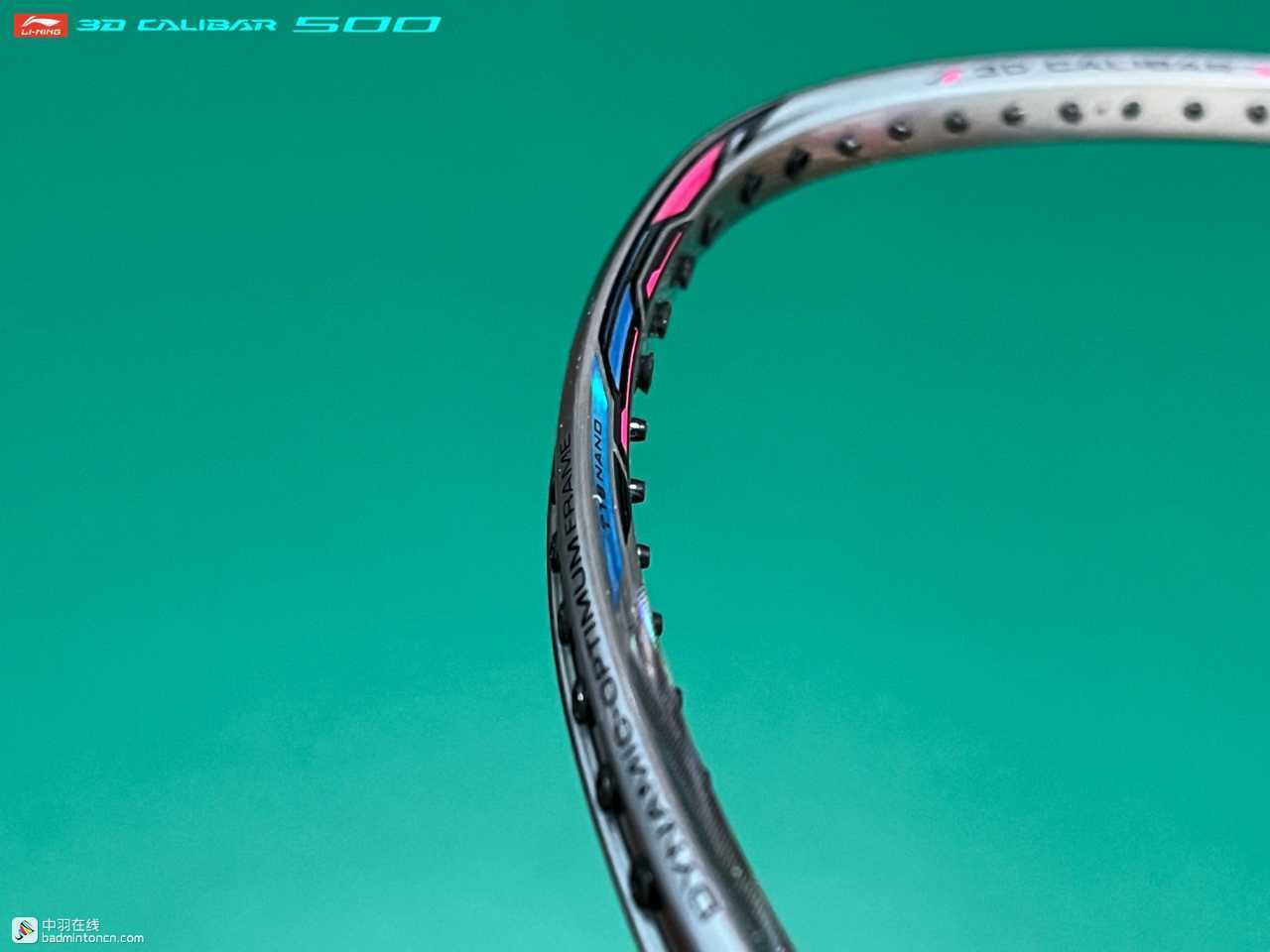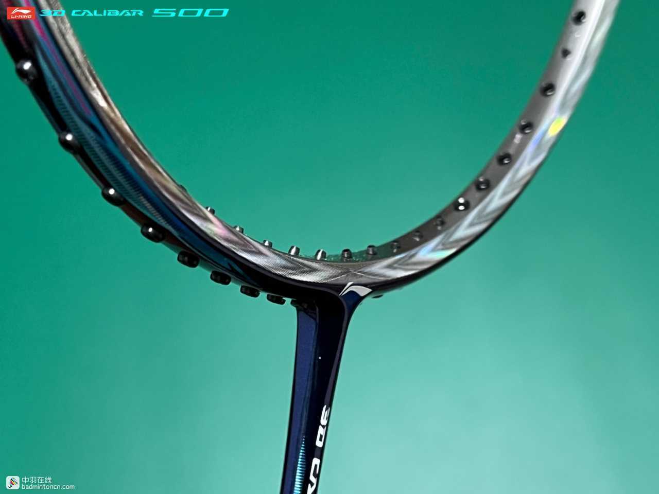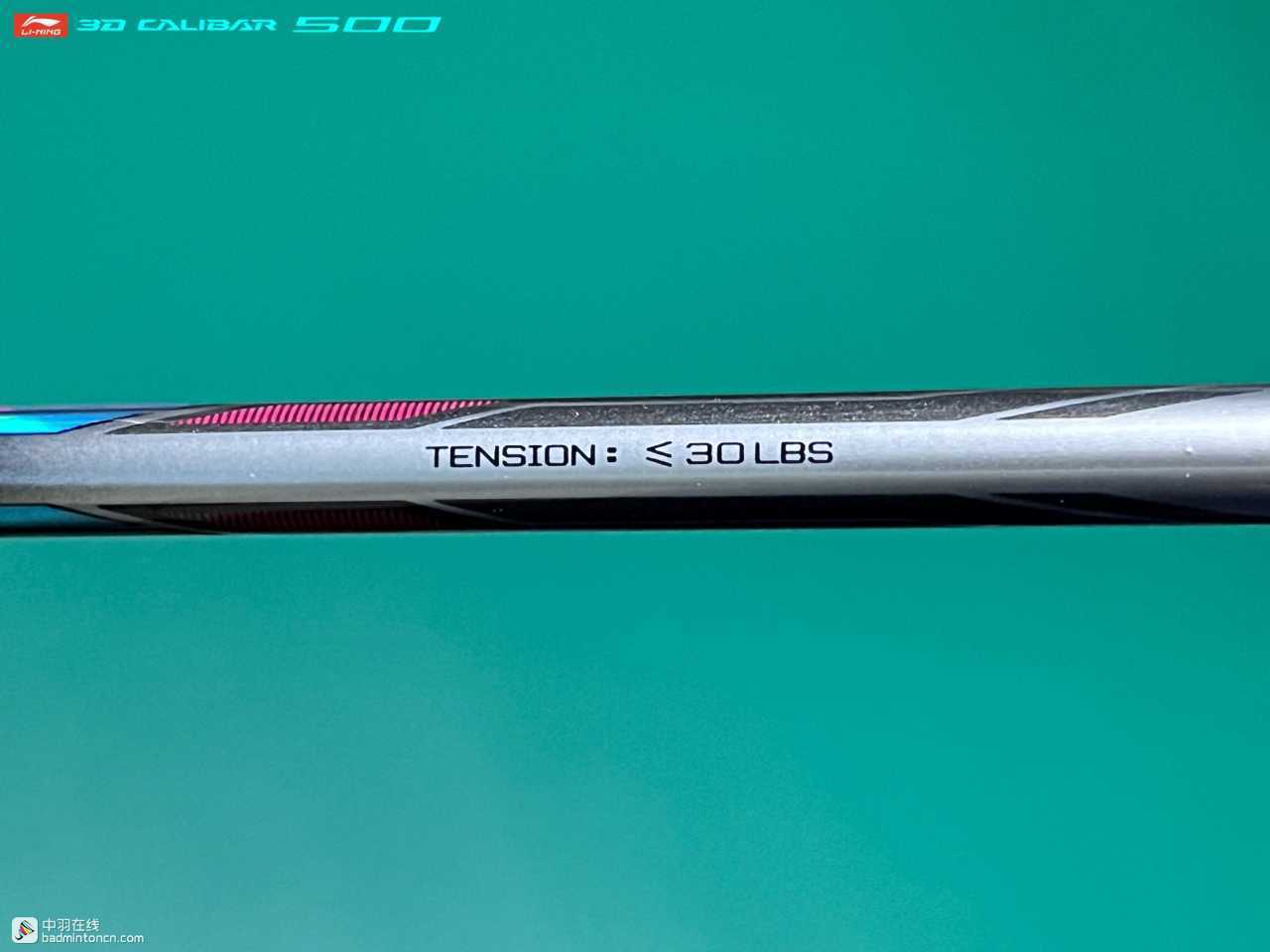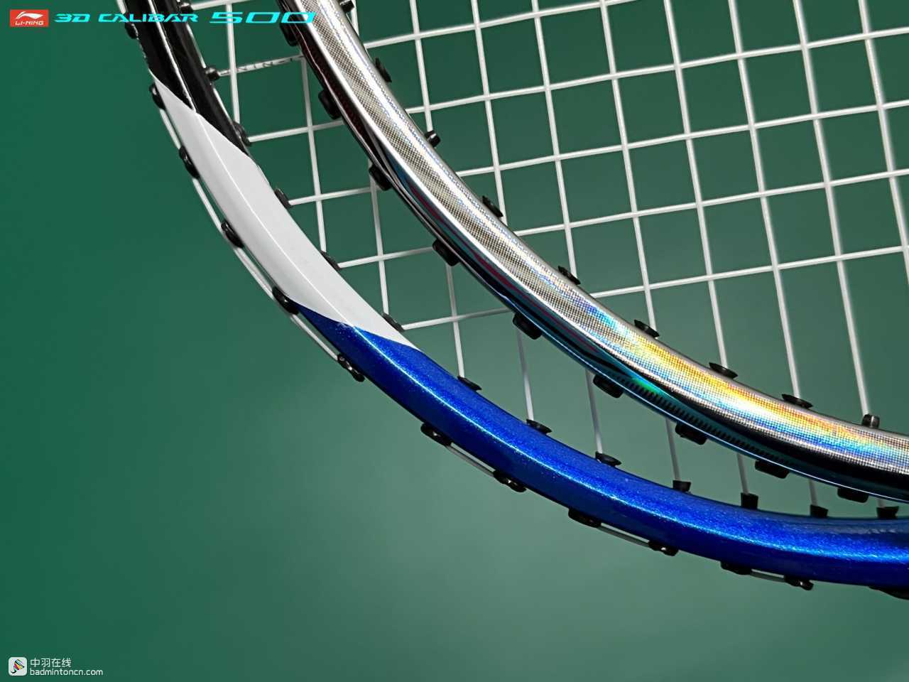 中杆上半部分采用了和拍框上一样的湖蓝色贴纸,簇拥着中间的型号名称“3D CALIBAR 500”字样。下半部分则以深灰色和玫红色承接,所有的图案设计以直线为主,尽显锋芒。