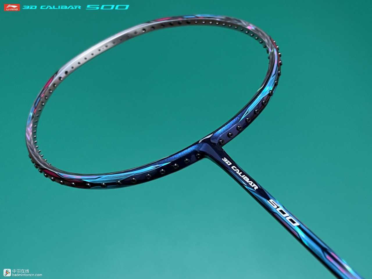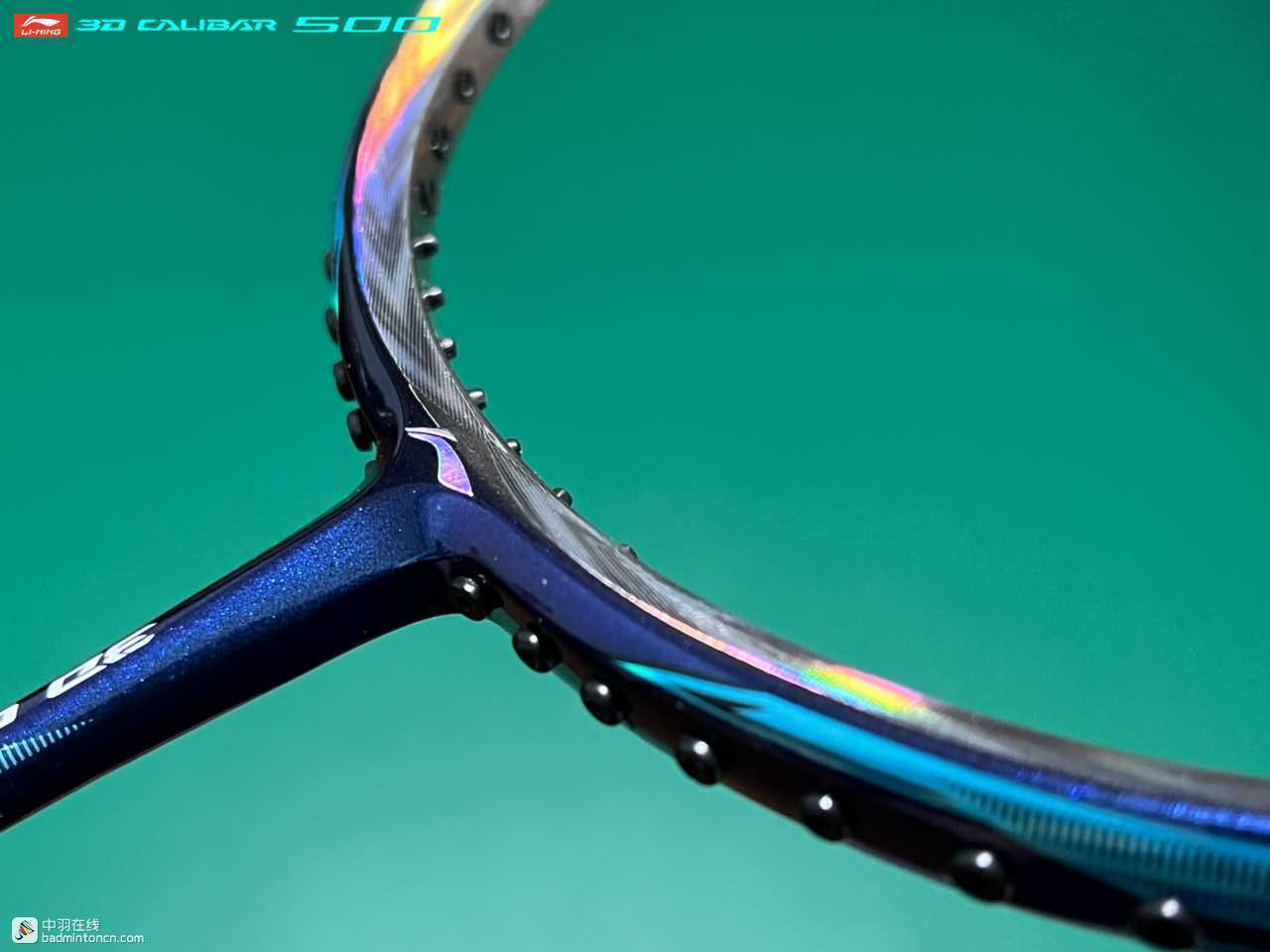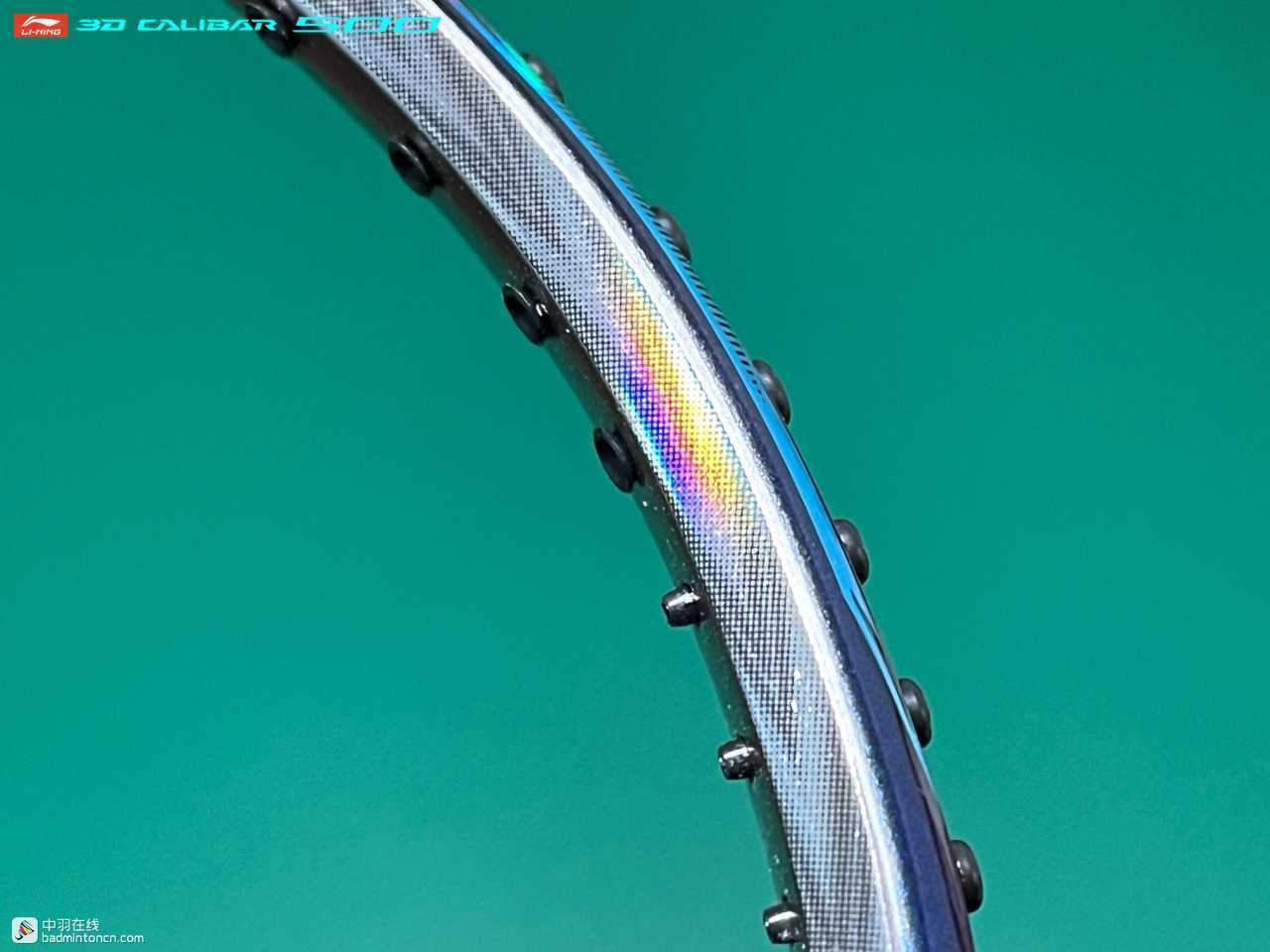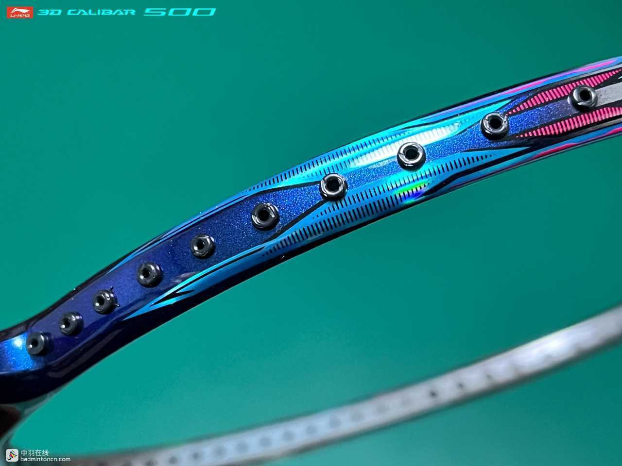 中杆上半部分采用了和拍框上一样的湖蓝色贴纸,簇拥着中间的型号名称“3D CALIBAR 500”字样。下半部分则以深灰色和玫红色承接,所有的图案设计以直线为主,尽显锋芒。