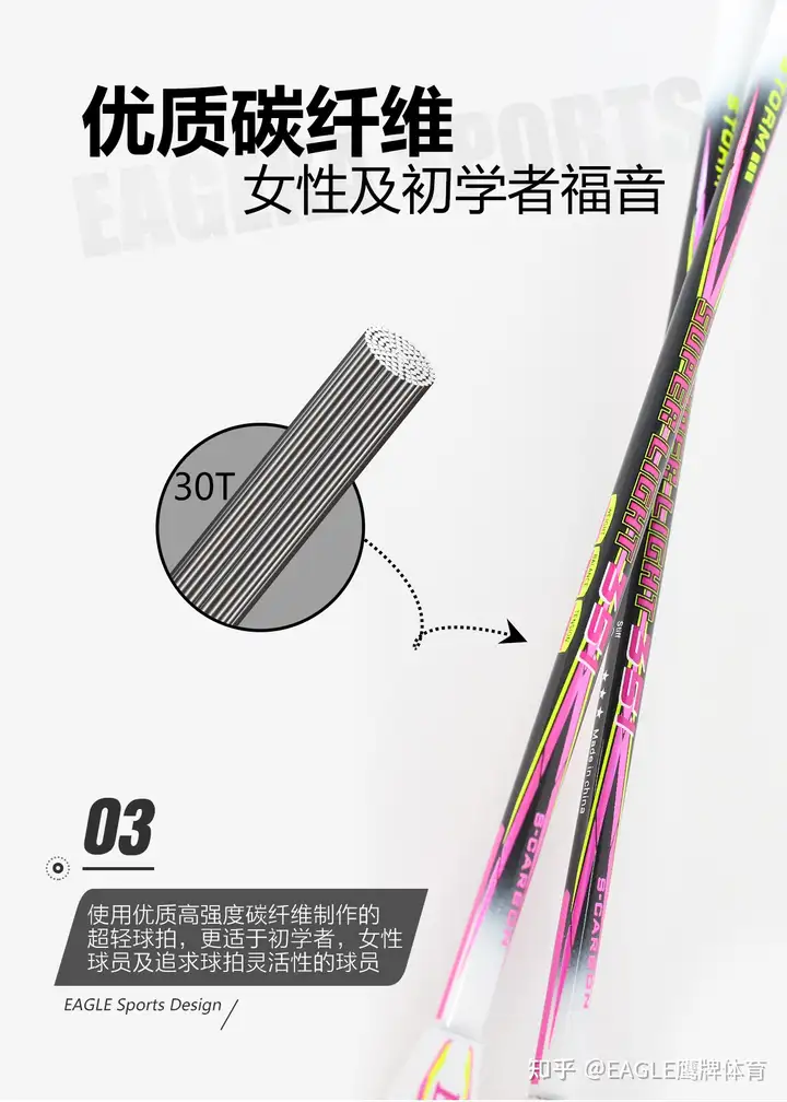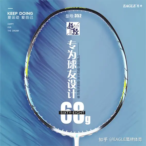 鹰牌SUPER LIGHT超轻E351/352羽毛球拍,连续多年位居超轻羽拍界销量榜首。7U 68克  外观:选用了最为持久性的国际流行色粉红、粉蓝两色搭配,同时以LASER镭射外观效果的水标图案加以呈现,动感且时尚,既有女性之柔美,又展现了男性之刚强。  科技:SUPER LIGHT超轻E351/352羽毛球拍使用了ULTRARIGID超高刚性碳纤维和高刚性中管,材料科技革新,最新框型设计,更具性价比价格。性能上更全面,速度将更快,适中的平衡点,偏硬的参数,轻量化的设计,绝对是一款双打利器。 超轻:7U的重量,整体轻,引拍速度极快,击球那一刹那,速度惊人,一股强大的气流让球很听话的落到对手的后场,在拉吊的时候,拍框弹性发挥的淋漓尽致,尤其是业余玩家,进攻并不会很多,一种舒适而又容易打点的击球感更合适不过了,这样可以使用更少的体力将对手拖住,控制节奏,然后攻其不备才能无往不利。 球拍整体轻,引拍速度快,劈掉也就自然信手拈来,中杆比较柔和,弹性十足,加上标准的方头拍框设计,只要步伐到位,反拍防守毫无压力。其实根据自己打球的经验,感觉网前球主要取决于拍线和手感,鹰牌BS99线操控性球线,手感很清晰,在网前控制起来比较简单容易,无论搓球,还是推或者挑对方底线,都是得心应手。