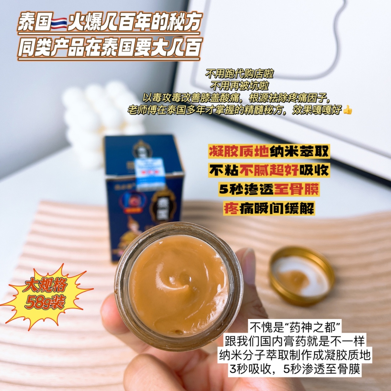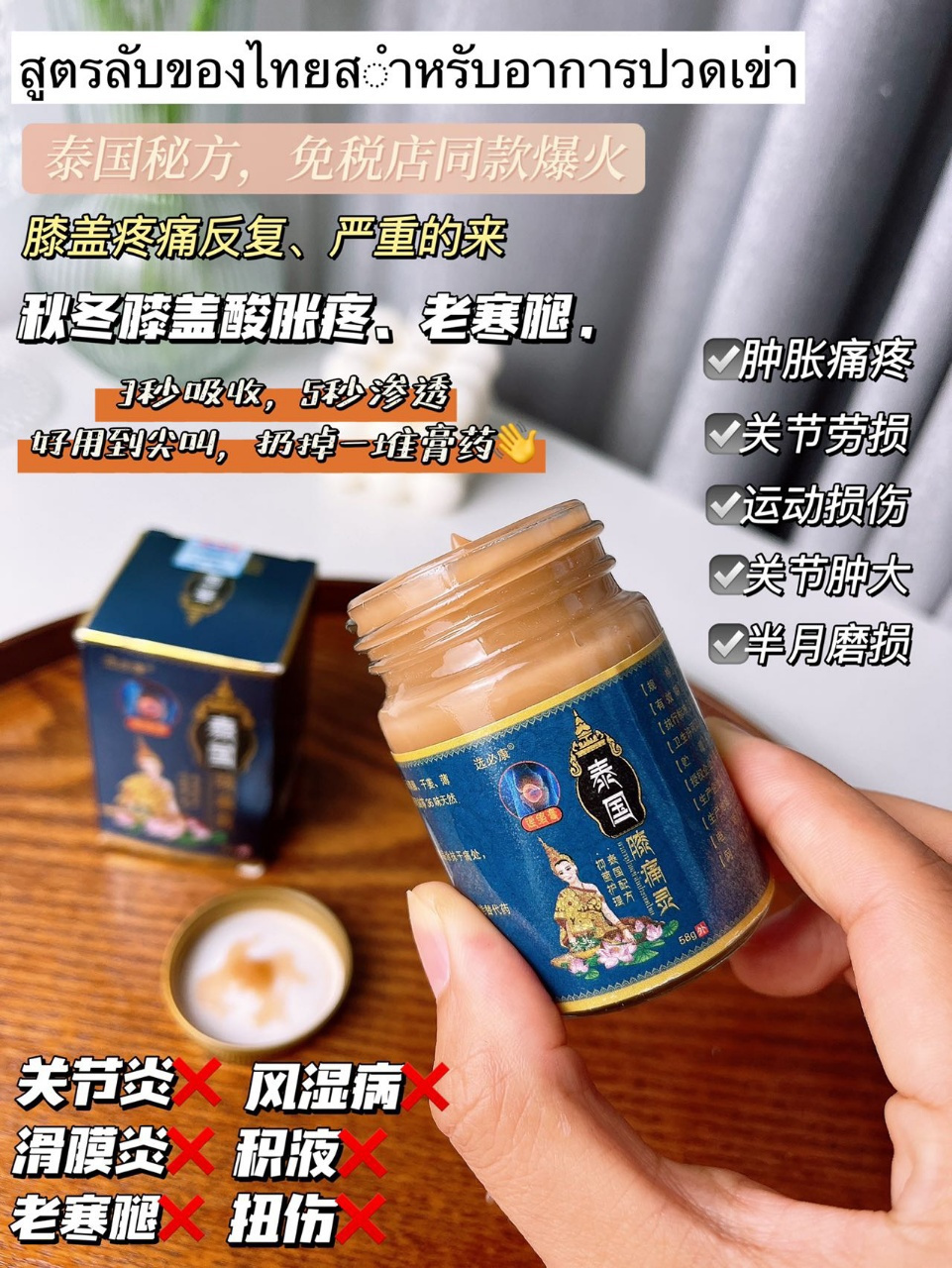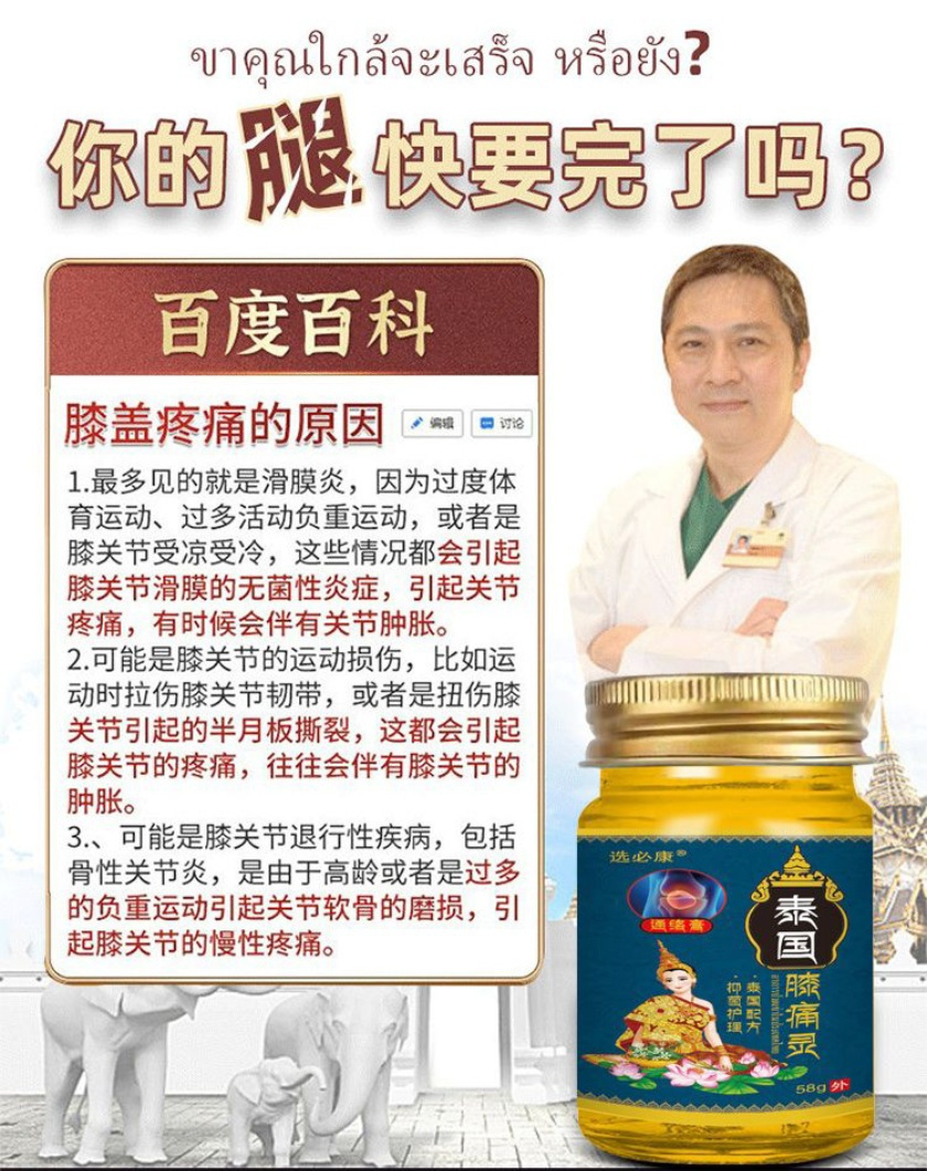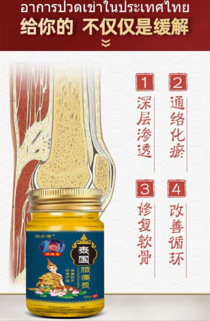 选必康泰国百年传承古方膝痛灵,祛痛健骨,消炎止痛,专门针对膝关节各种不适症状✅抹一抹快速见效!通经活络、舒血化瘀、缓解疼痛让您和家人远离老寒腿、关节炎、膝盖肿痛的折磨‼️