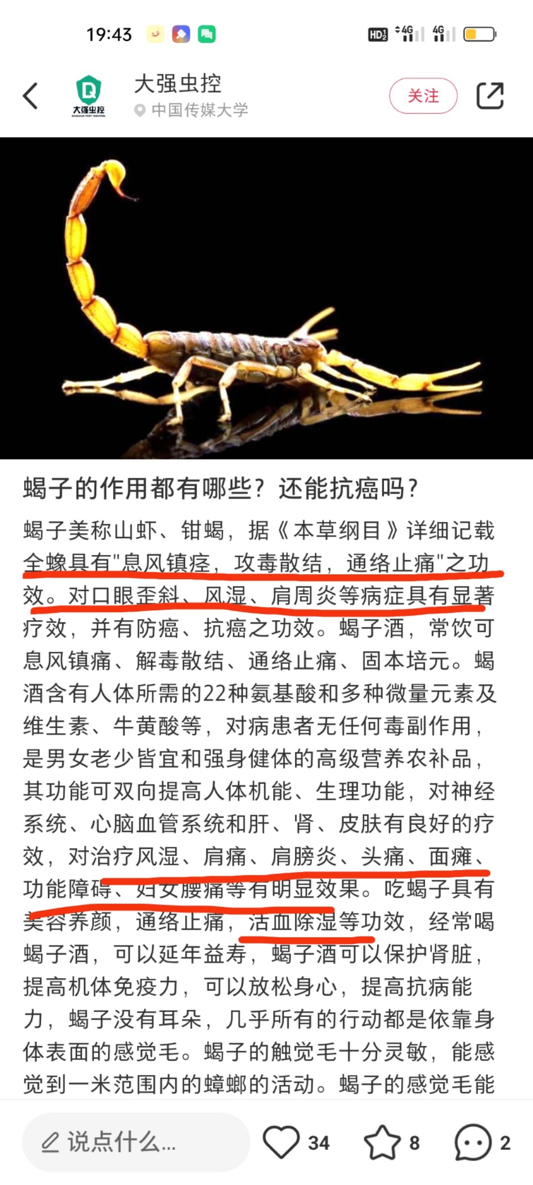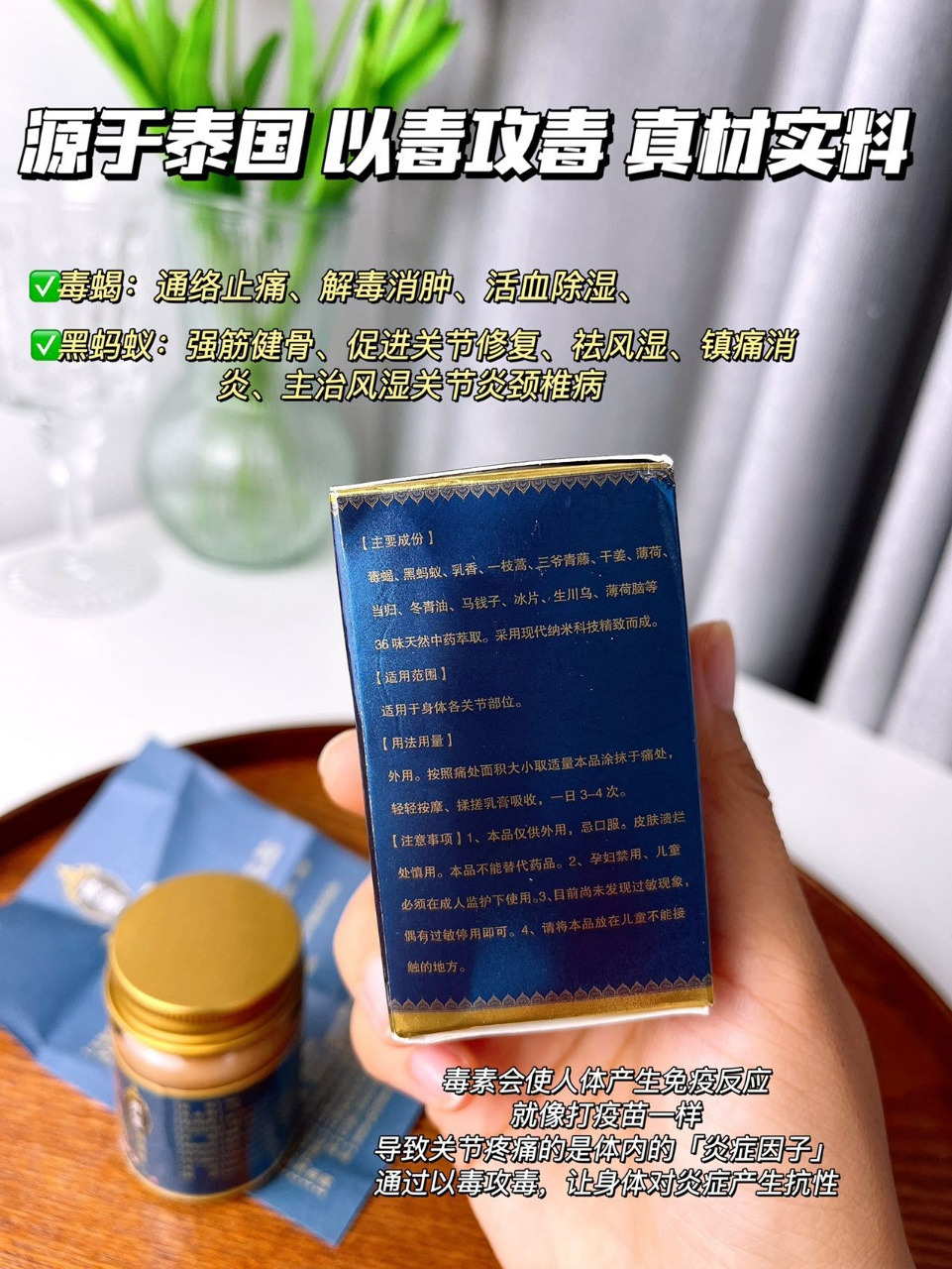 膝痛灵效果为何这么好?关键在于里面添加了可以以毒攻毒的毒蝎、黑蚂蚁✅毒蝎:通络止痛、解毒消肿、活血除湿、✅黑蚂蚁:强筋健骨、促进关节修复、祛风湿、镇痛消炎、主治风湿关节炎颈椎病很多人都知道中医会“以毒代药”可以修复损伤,让关节更强壮但大部分人不知道其中的原理普通药膏里一般只添加植物成分药效肯定没有动物成分好