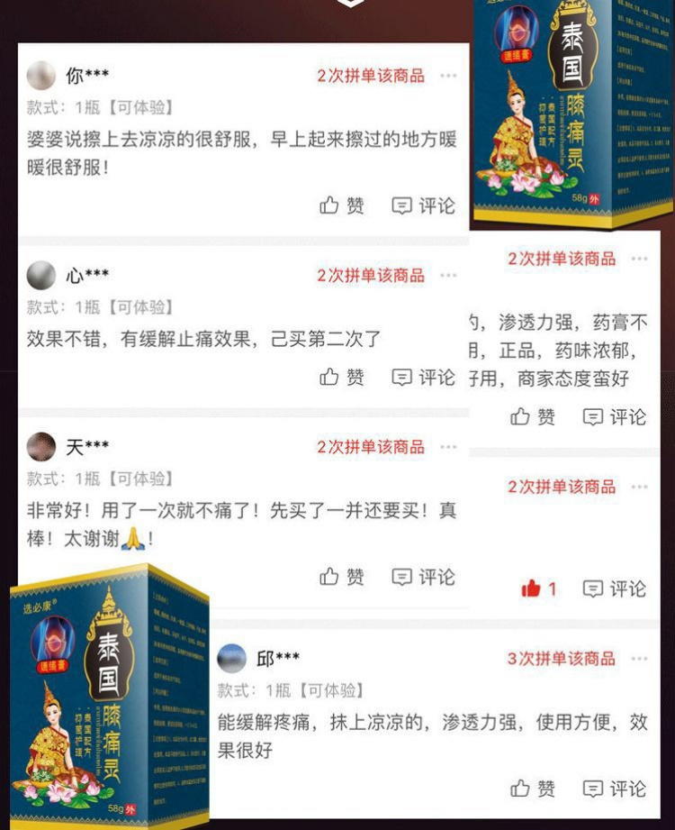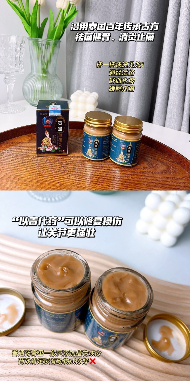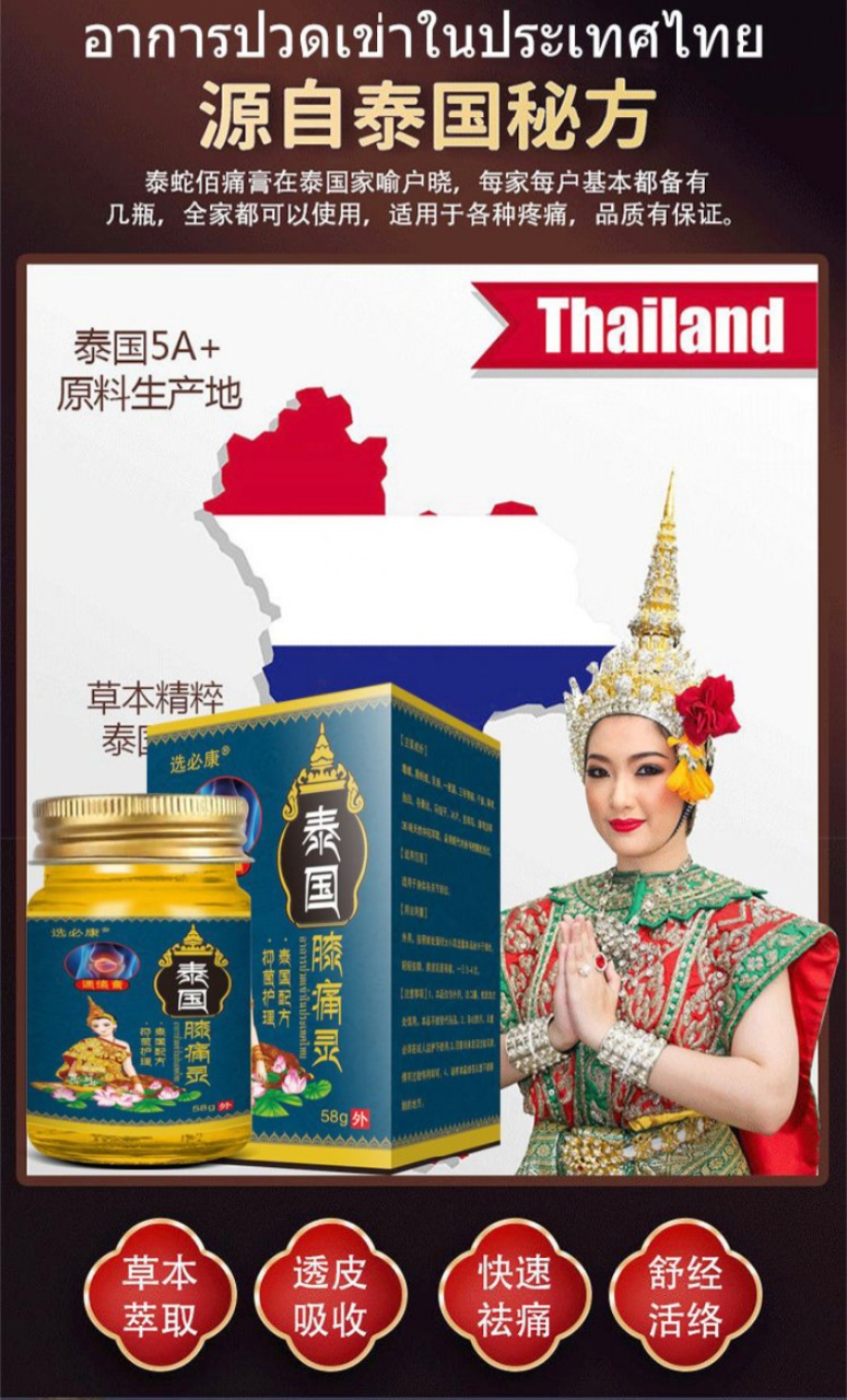 这款泰国古方膝痛灵——沿用泰国神奇秘方,精选泰国5A生产地泰国对药物管控十分严格不用担心药物成分会刺激皮肤膝痛灵的配方经过专业药剂师测试