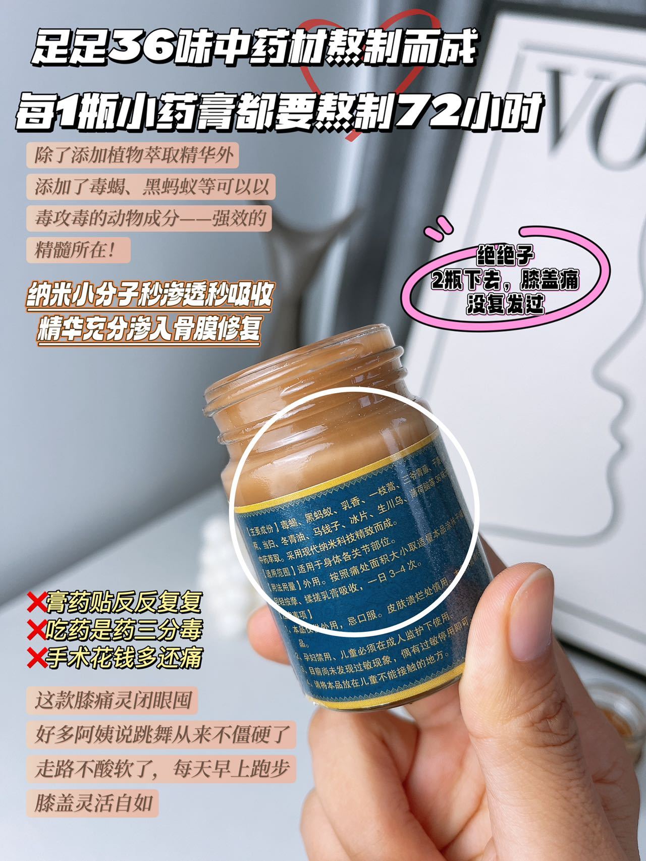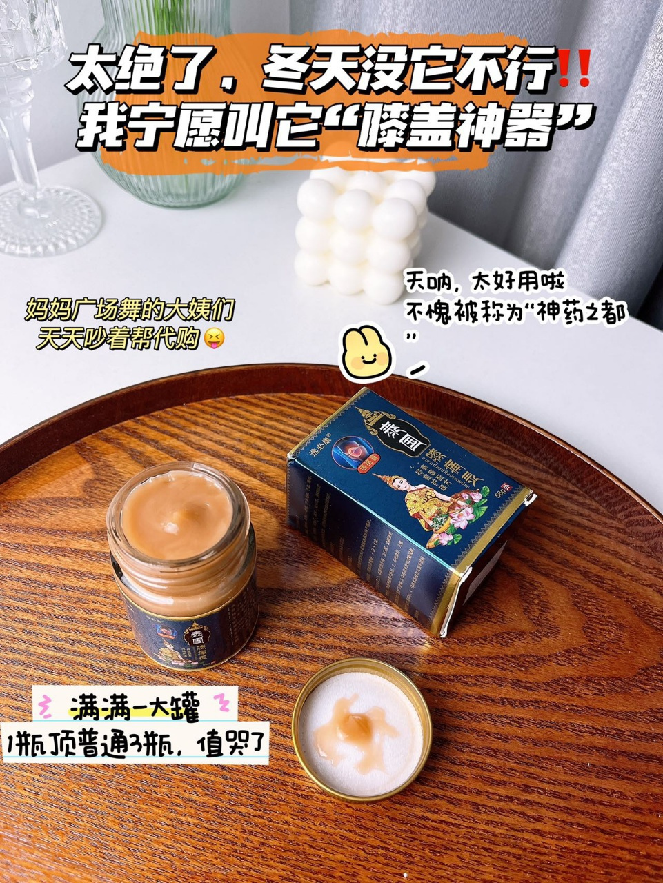 大跌降温,一夜之间膝盖酸痛像针扎似的,尤其是家里父母老人,多年的关节炎风湿病,半月板老化,滑膜炎…都在这一刻爆发,晚上疼白天疼,药店买的膏药不管用强烈推荐这款“膝关节救星”,精选泰国古老秘方,同款泰国膝痛膏代购要178一瓶,同配方配比我们今天只需¥XX元2大瓶,58g大规格装‼️‼️每一次全家都能用,家里人膝盖不好的一定一定要屯,你用了就知道他比普通膏药让你惊艳