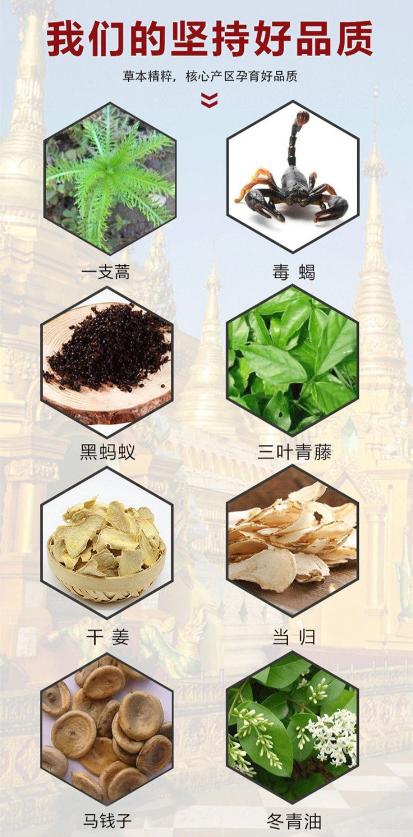 除此之外,还添加了多种中草药植物成分,动植物精华合力多用,涂抹一次比用普通一瓶效果都好一支蒿:风湿骨痛、跌打损伤、肢体疼痛、肿痛三叶青藤:清热利湿、活血通络干姜:温补驱寒,活血化瘀,疏通血液循环当归:补血活血、抗炎镇痛、促进造血马钱子:活血化瘀、通络止痛、散结消肿冬青油:舒缓风湿、肌肉疼痛、关节炎肌腱炎疼痛