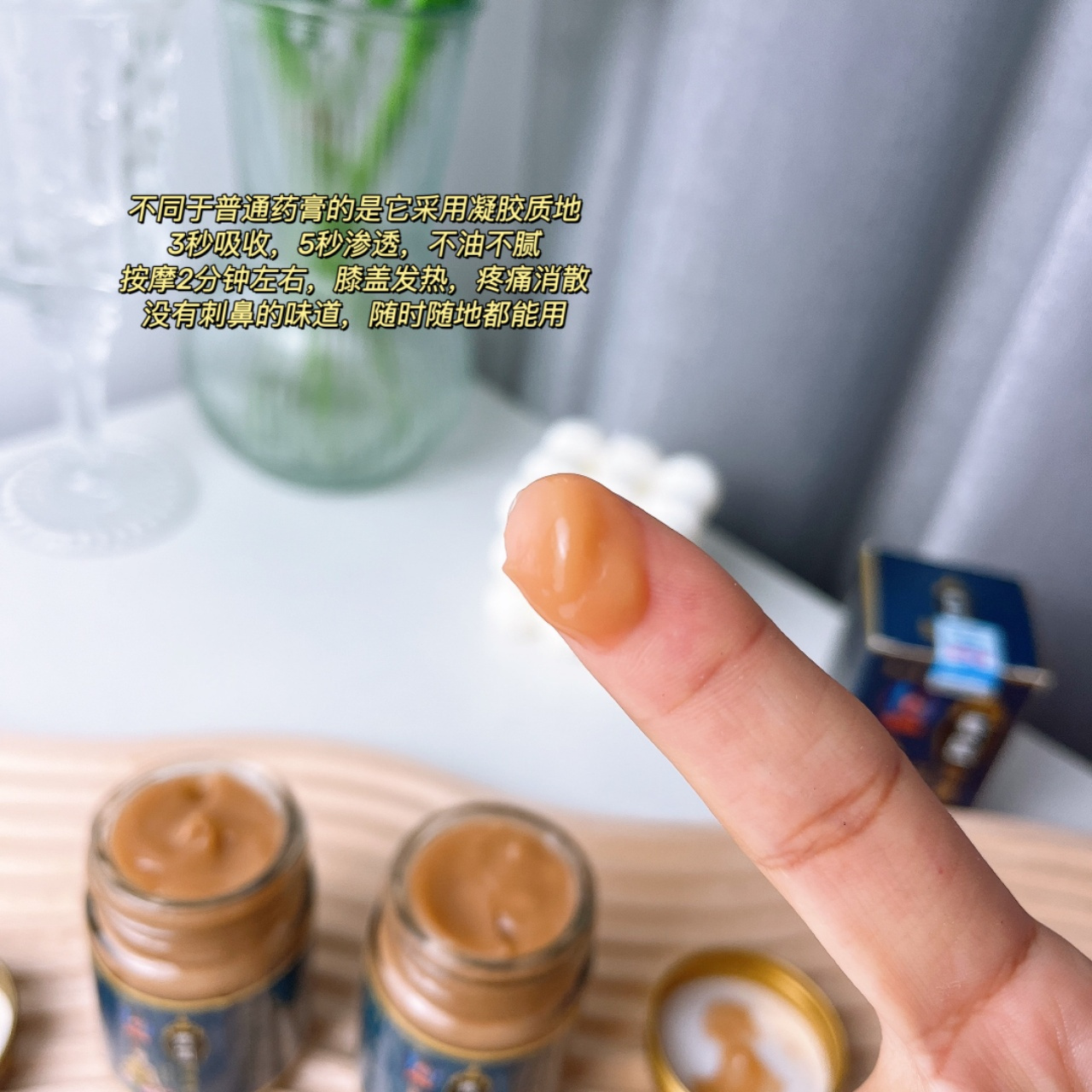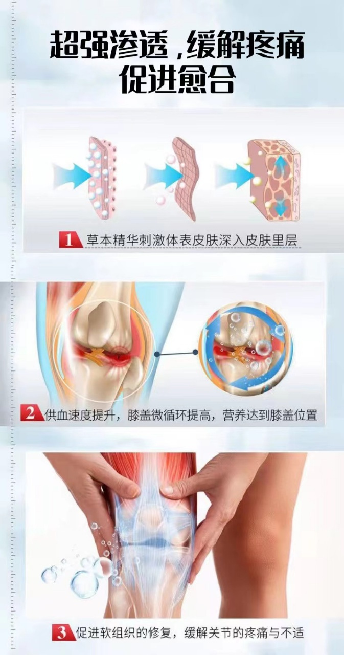 不同于普通药膏的是它采用凝胶质地一抹化水,不油不腻,3秒吸收,5秒渗透可以多按摩2分钟,使药液充分渗透骨膜直达病灶,1分钟膝盖轻松舒畅没有刺鼻味道,随时随地都能用膝盖、关节痛起来再也不用忍