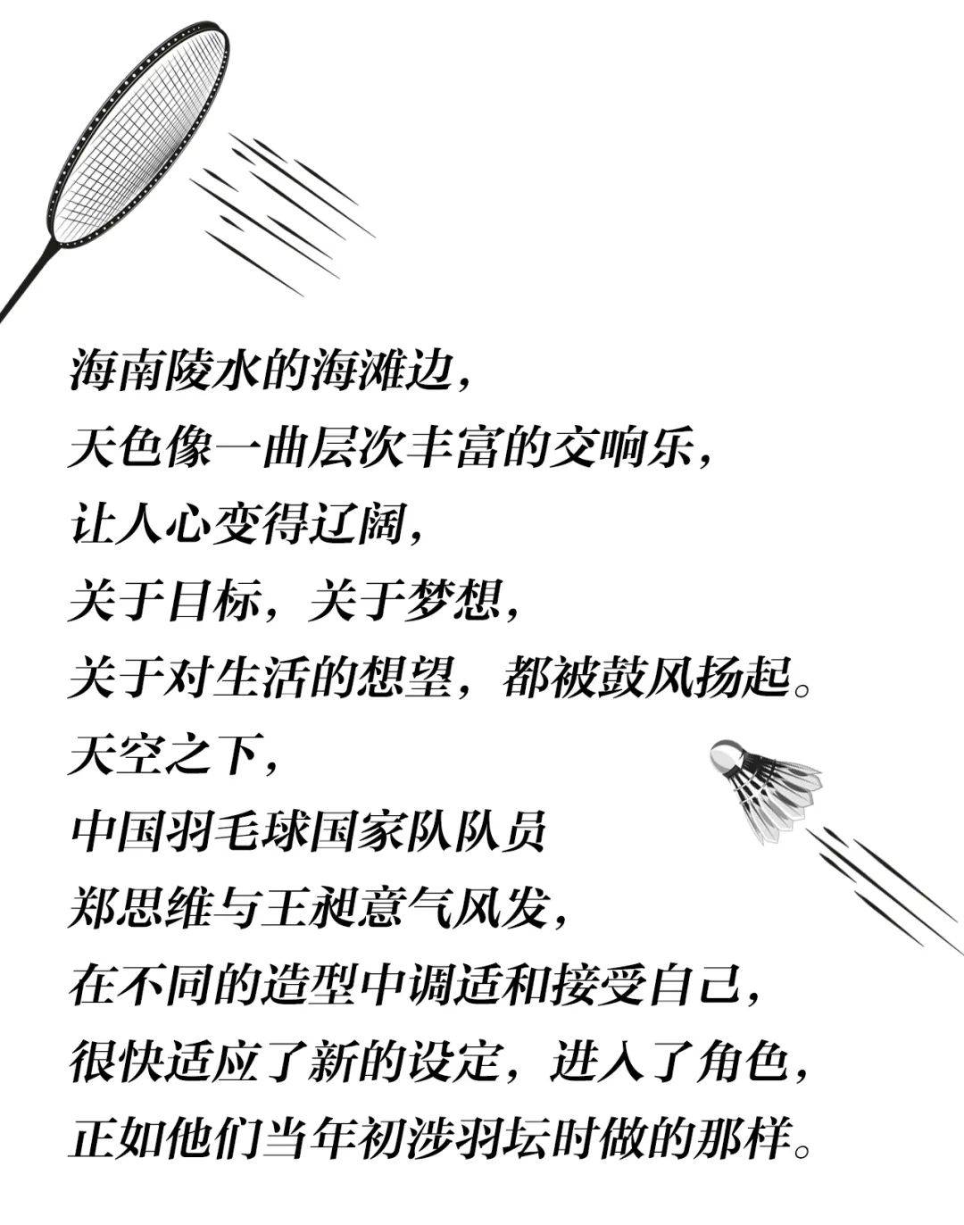 那一整天,海滩边先是阳光热烈,又经历短暂的阵雨,之后雨过天晴,晚霞满天,海潮随即幽暗。天色像一曲层次丰富的交响乐,让人心变得辽阔,关于目标,关于梦想,关于对生活的想望,都被鼓风扬起。天空之下,他们在不同的造型中调适和接受自己,很快适应了新的设定,进入了角色,正如他们当年初涉羽坛时做的那样。