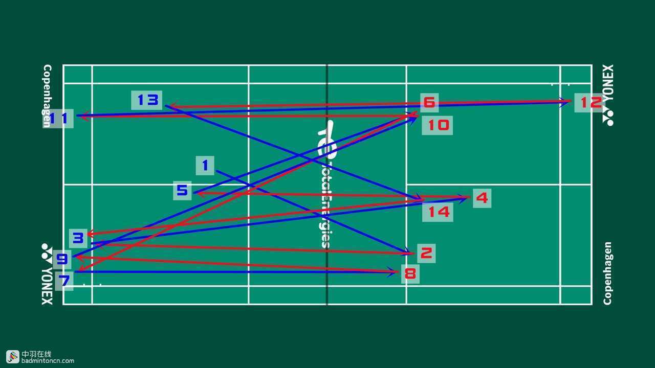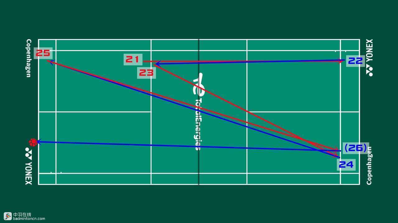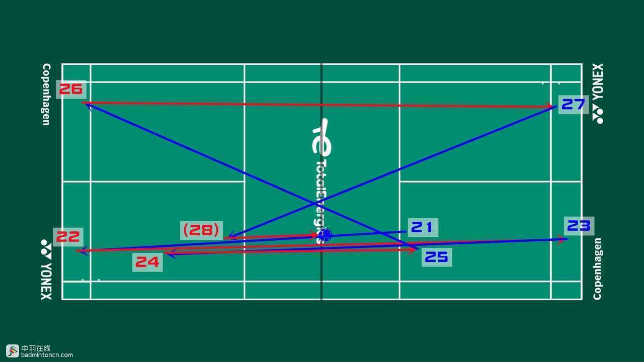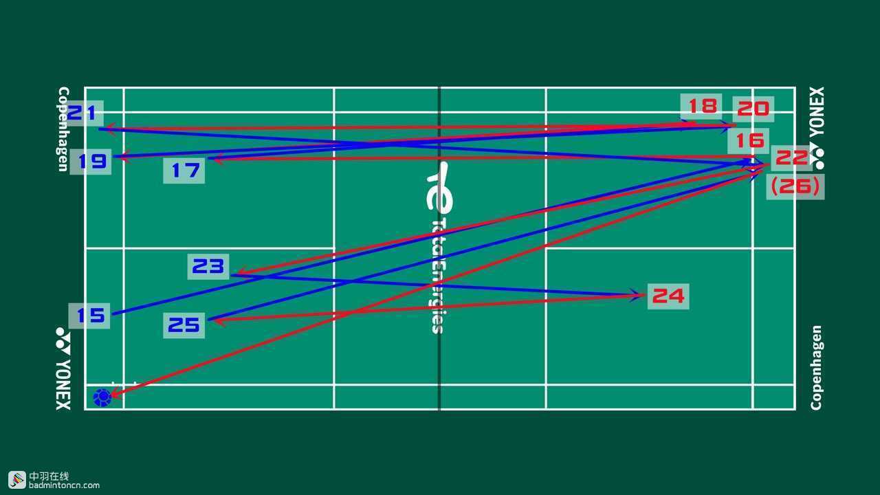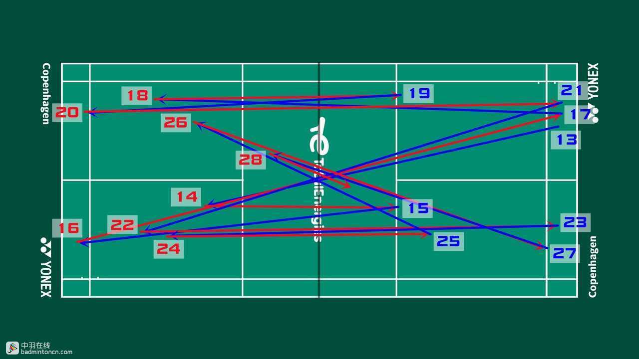 但戴资颖对马林的反拍顶后场准备不是非常充分,球过顶后只能后仰回一拍高远球,回合迎来第一次攻防转换。马林同样采用了头顶轻杀直线保持连贯,戴资颖挡对角调动马林,马林上网准备充分,回勾对角。戴资颖网前继续推直线压制马林的反手底线,马林反手加力过渡抽直线防抓网前,戴资颖继续挡对角。这几拍的线路和开局几拍类似,戴资颖相对处于主动,但马林也展示了扎实的反手技术,即使在被动以及大范围跑动的情况下也保持稳定,没有露出破绽,而双方的球路也都比较保守,看得出还在开局试探的阶段。