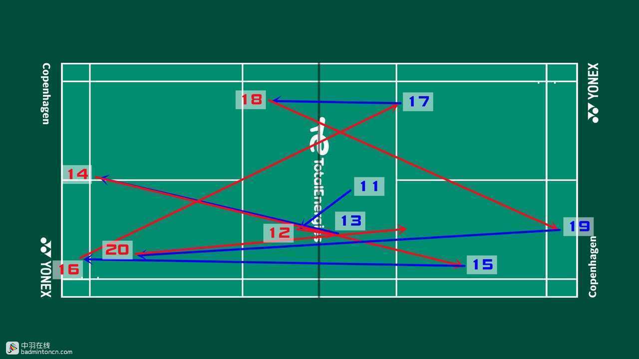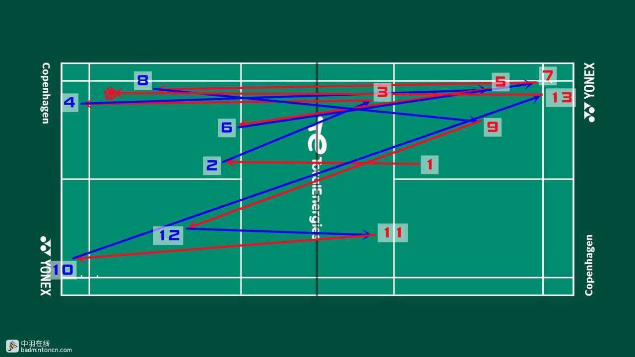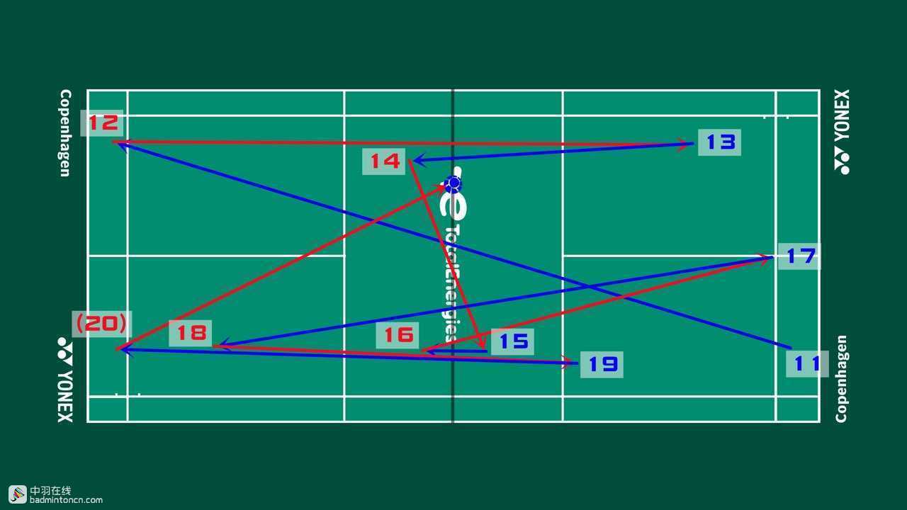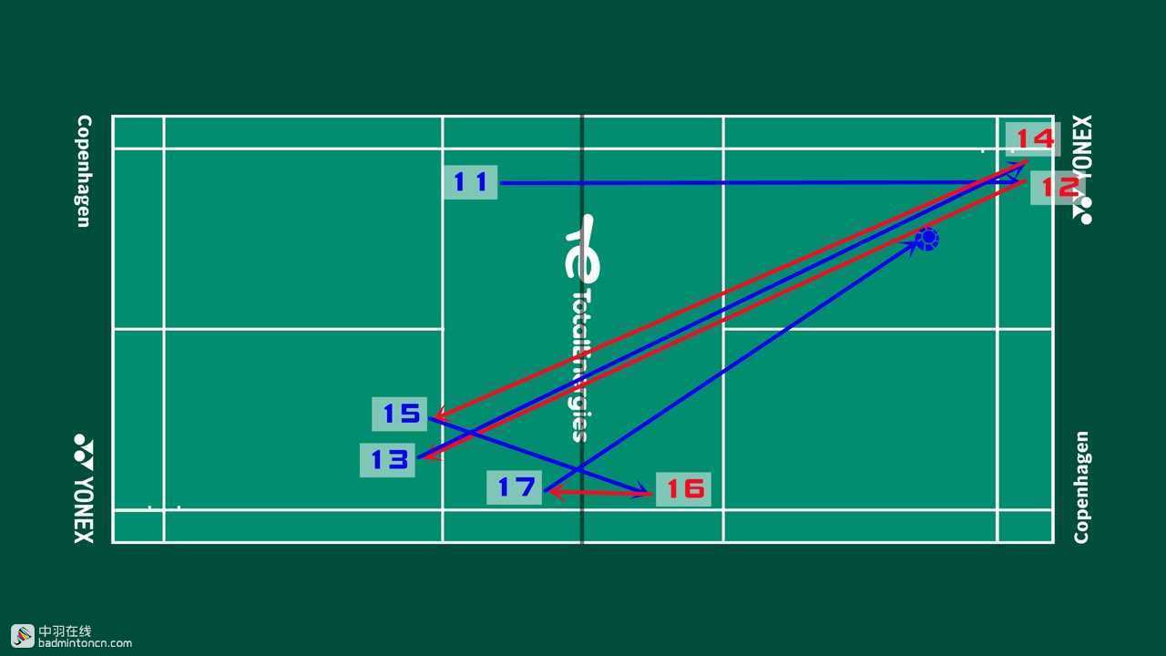 13:17,戴资颖的防守反击,最终得分线路和前半局2:0的一球类似。