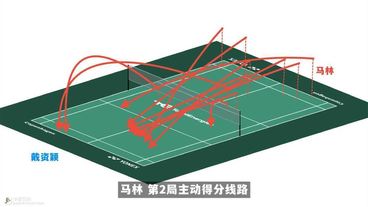 随后,戴资颖倚仗逆风一侧的控球优势,开始连续压制马林的头顶区,最终马林高远球摆脱出边线。