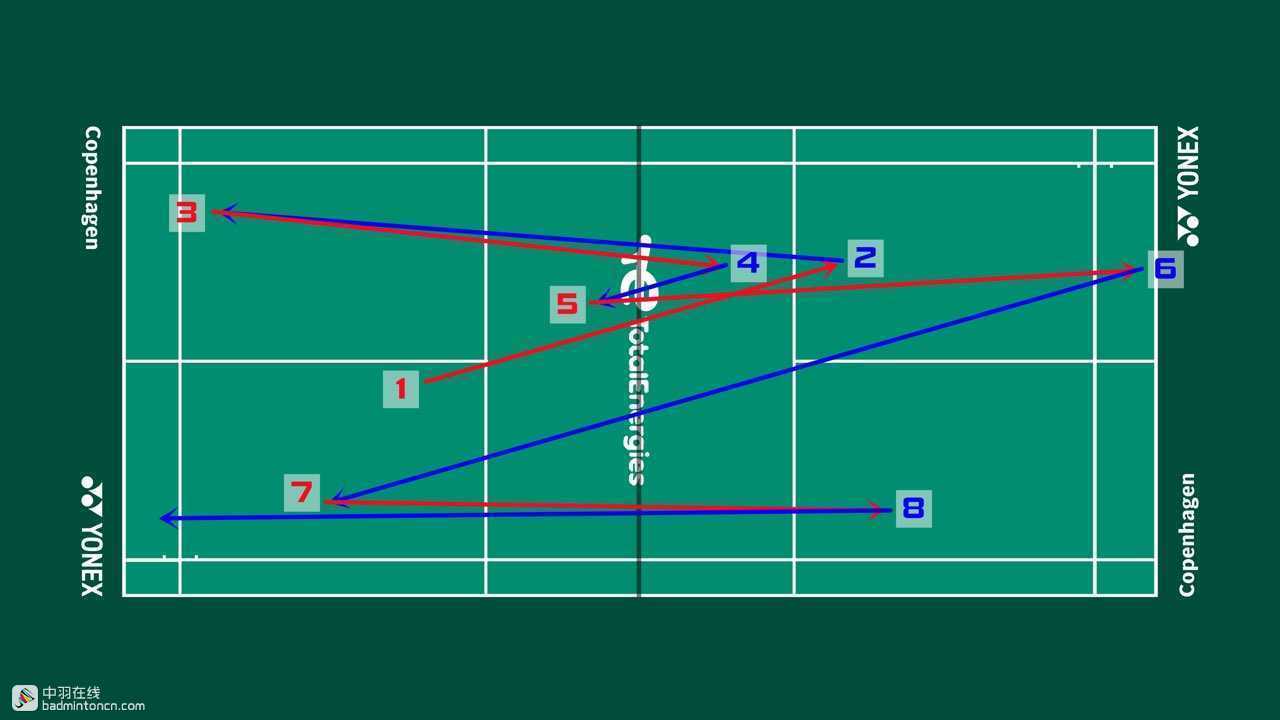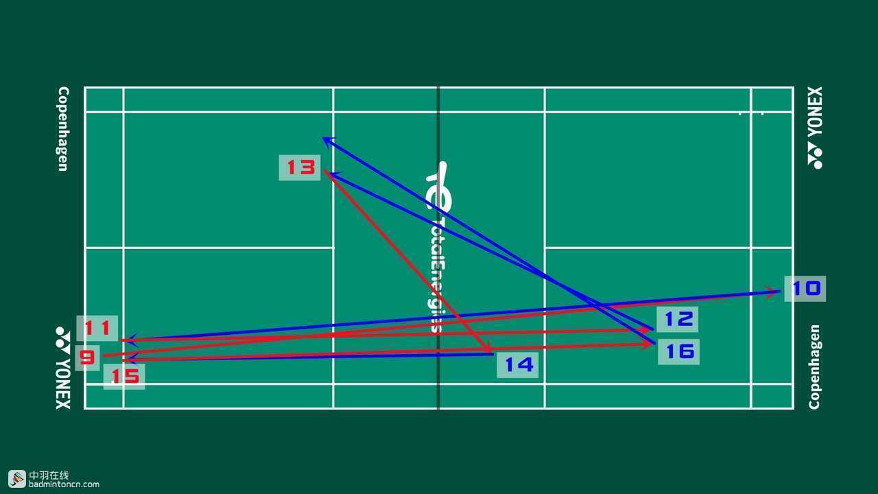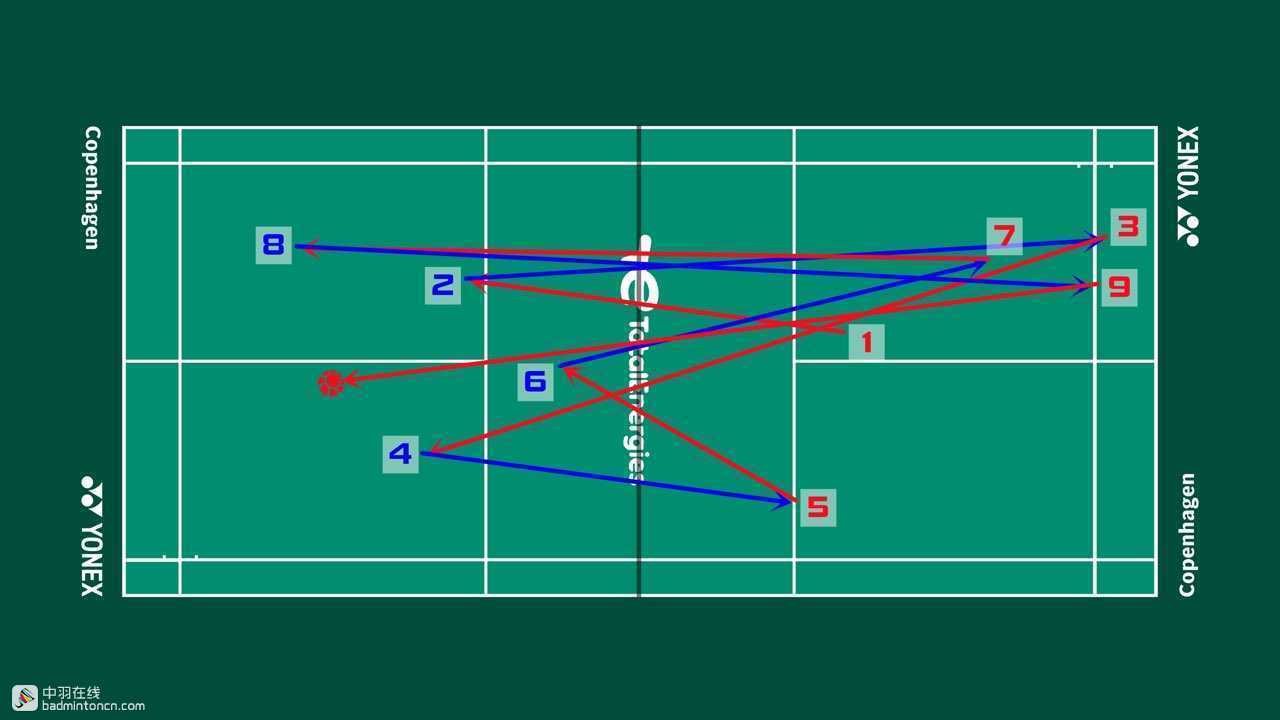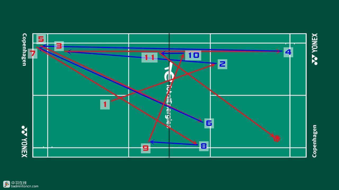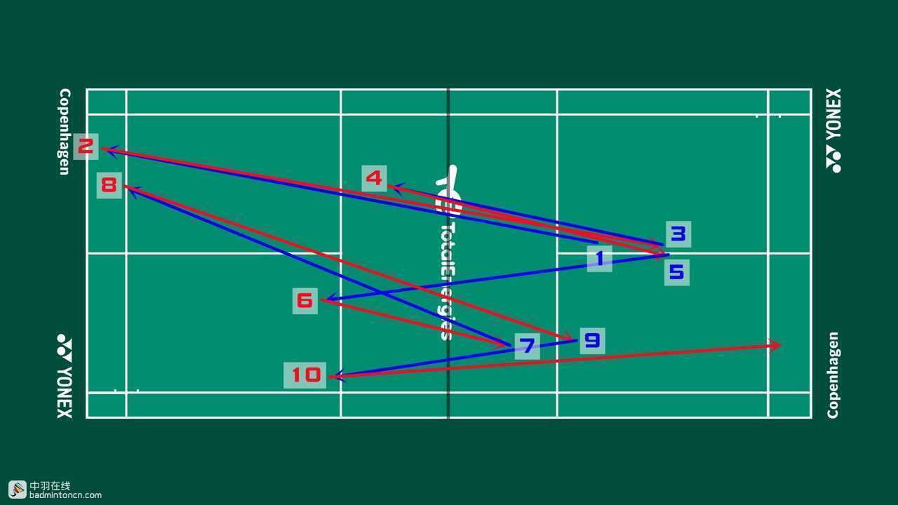 挡网后抓推,直线结合斜线,连杀两拍,在戴资颖回以对角平高球后,马林最终以一记头顶长杀直线打穿戴资颖的防线。