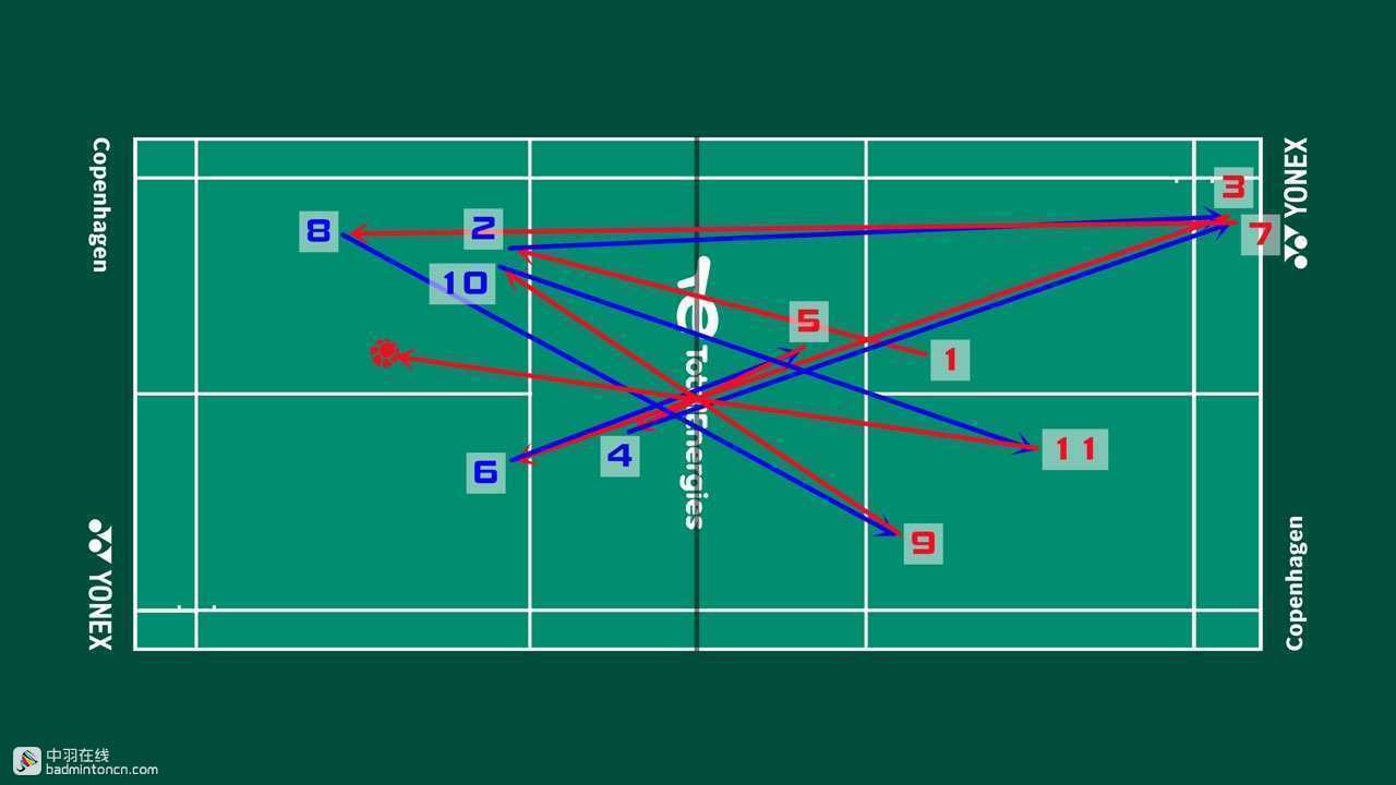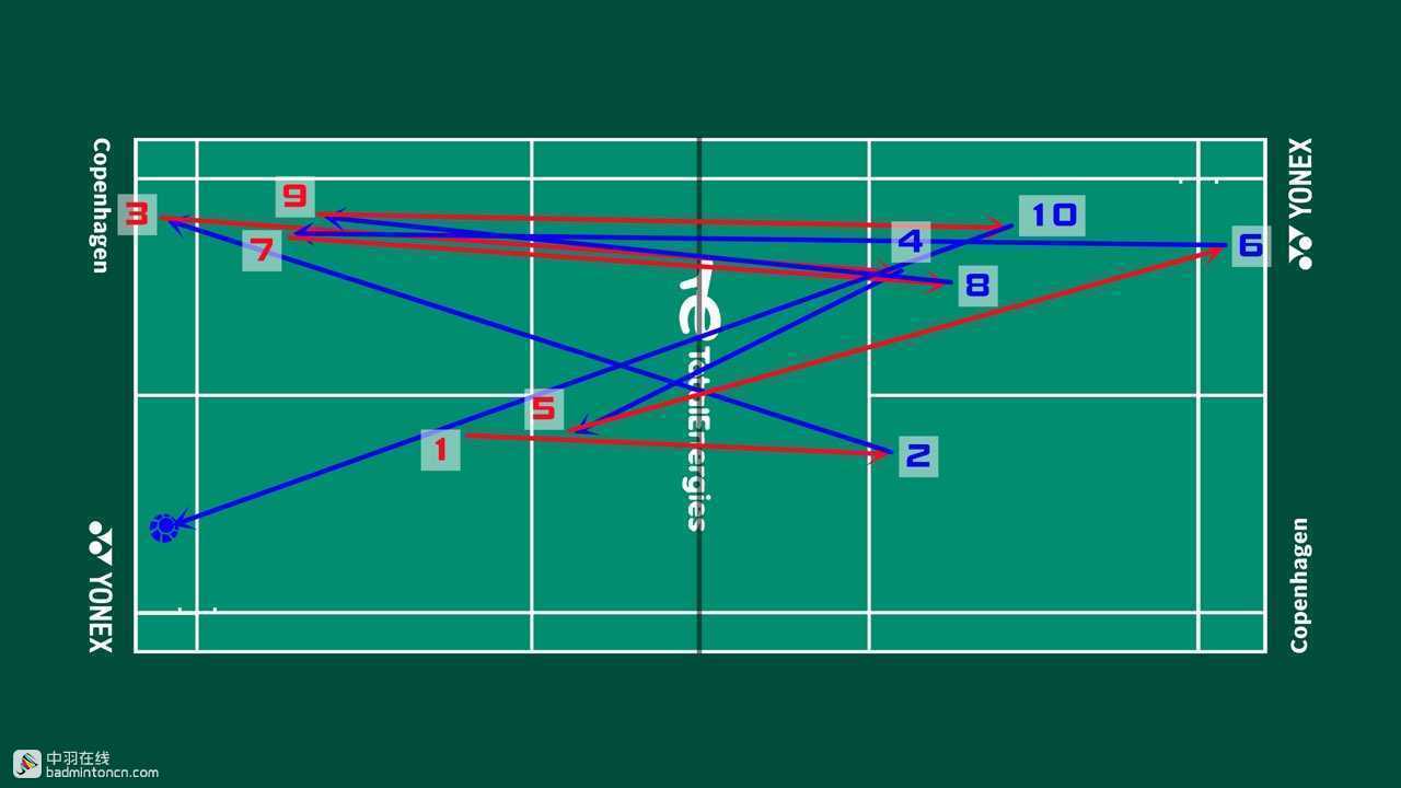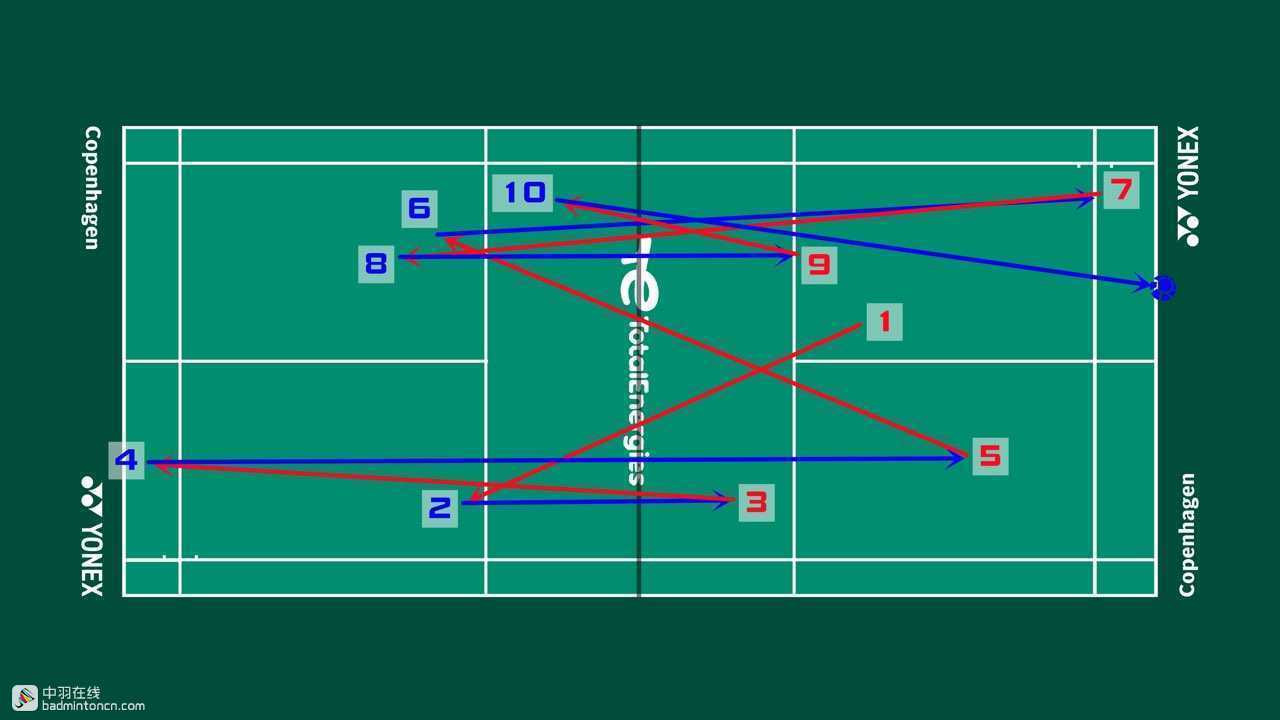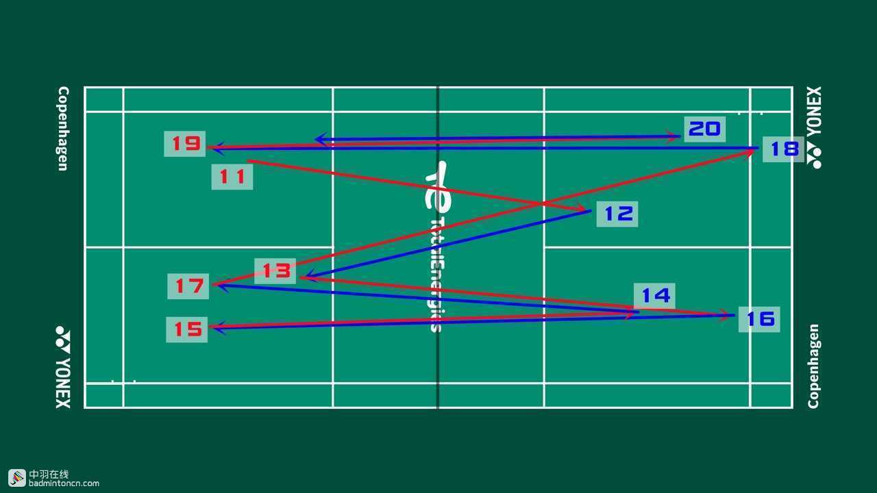 挡网后抓推,直线结合斜线,连杀两拍,在戴资颖回以对角平高球后,马林最终以一记头顶长杀直线打穿戴资颖的防线。