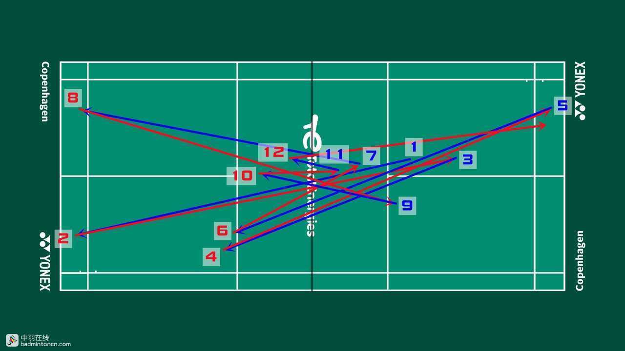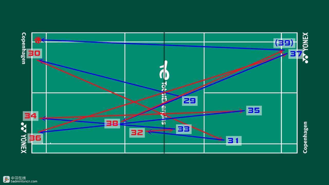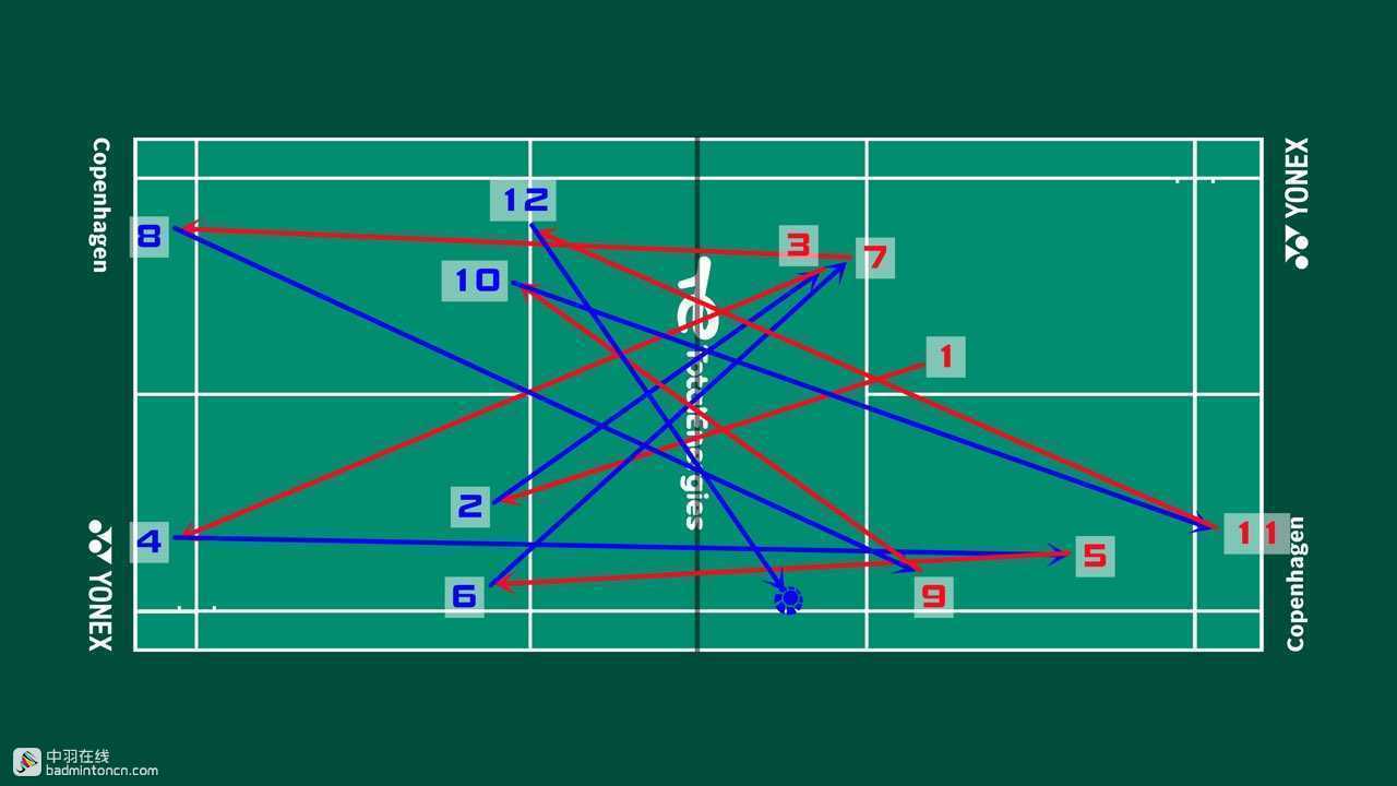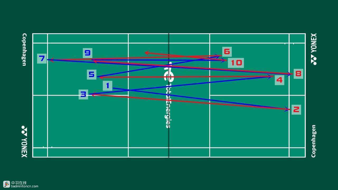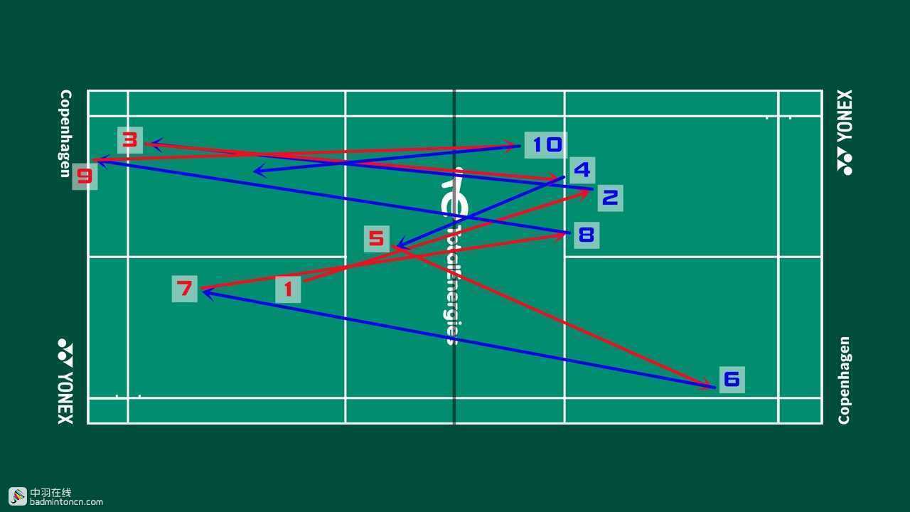 挡网后抓推,直线结合斜线,连杀两拍,在戴资颖回以对角平高球后,马林最终以一记头顶长杀直线打穿戴资颖的防线。