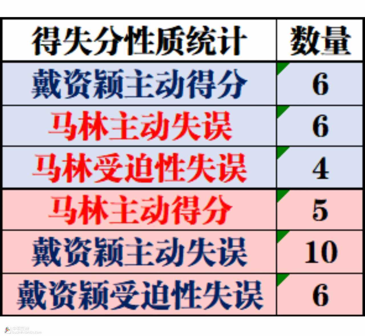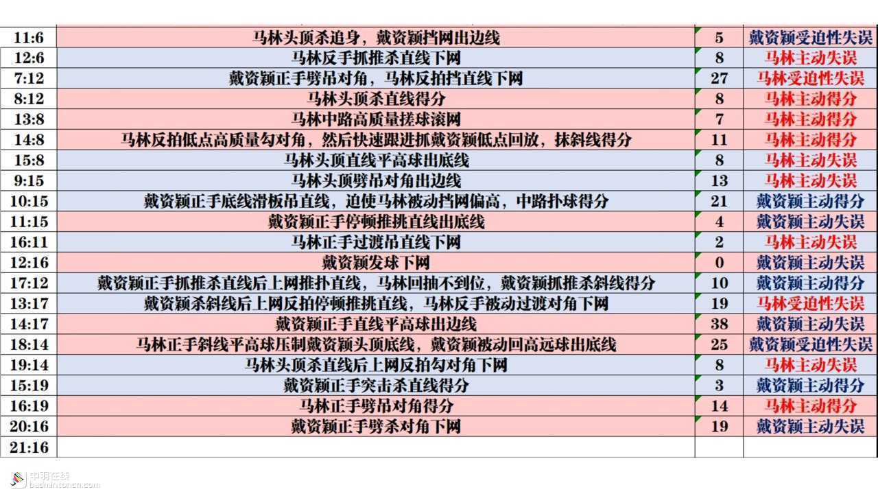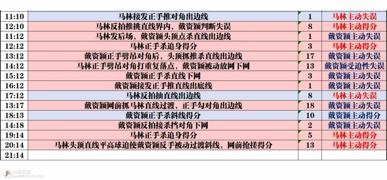 从3:3开始,戴资颖逐渐适应马林的速度,双方进入相持。但此后直到局休的这个阶段,戴资颖出现了大量的主动失误,导致比分被快速拉开,而马林在此阶段积累的领先分差,也成为了首局比赛胜负的关键。