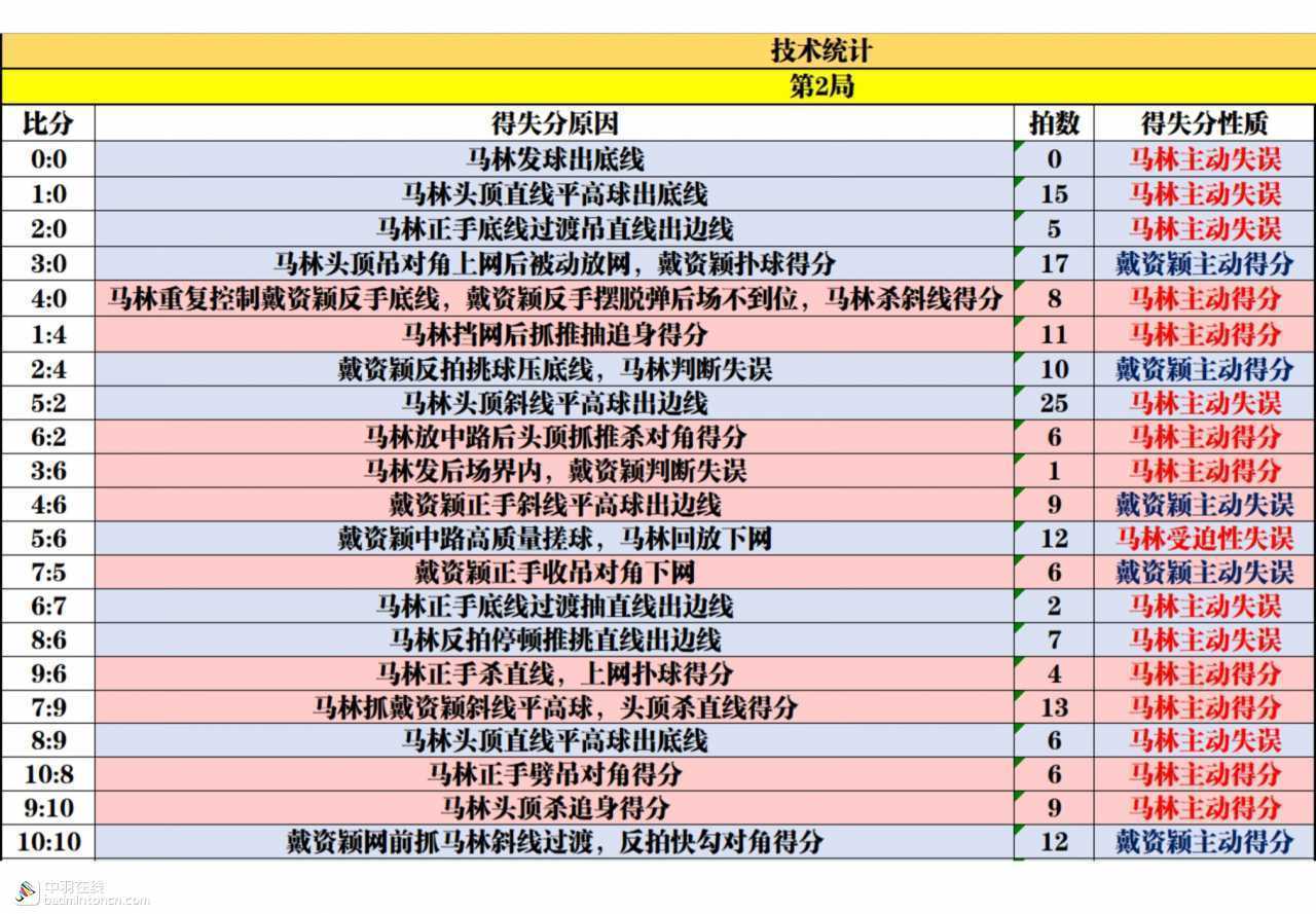 到了第二局,换到逆风一侧的戴资颖做出针对性的调整,开局起在控制球上就明显更加敢出手,积极推挑控制马林的底线,也保持了较快的速度。开局几分,在顺风一侧的马林反而显得较为被动,面对戴资颖积极的控制,自己的连贯就做得不是很好,同时还频频出现控球的失误,比如在反控戴资颖底线时打出界外,或过渡网前出边线等。戴资颖以4:0取得领先。