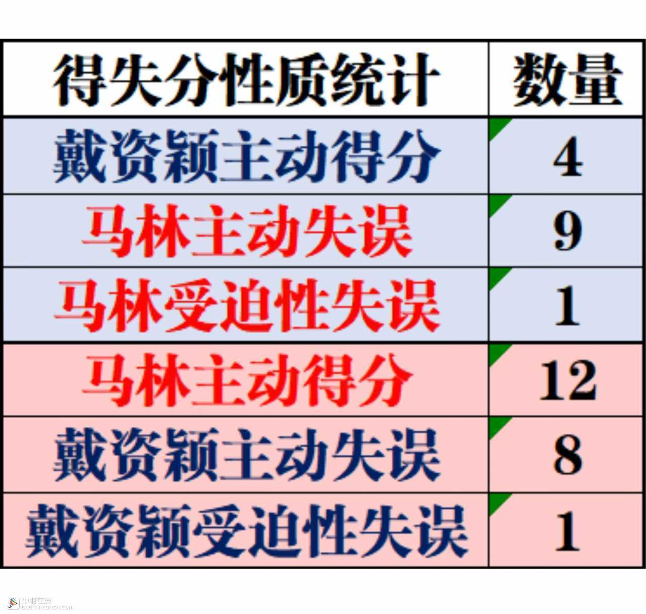 前半段马林处于攻势,她的进攻以及戴资颖的防守和摆脱都集中在左侧场区,戴资颖的防守和控制非常耐心。马林以反手过渡对角率先做出变化,但戴资颖非常冷静,回以重复落点的推挑,最终马林的滑板吊对角在球速和落点上都不理想,导致了自己的丢分。
