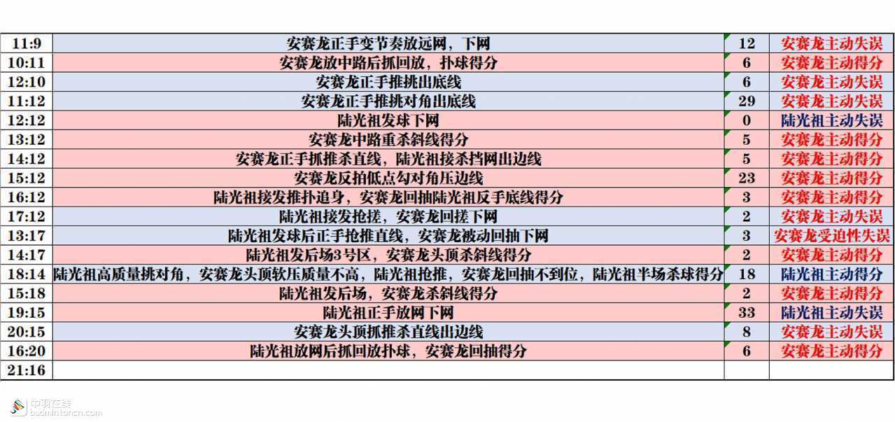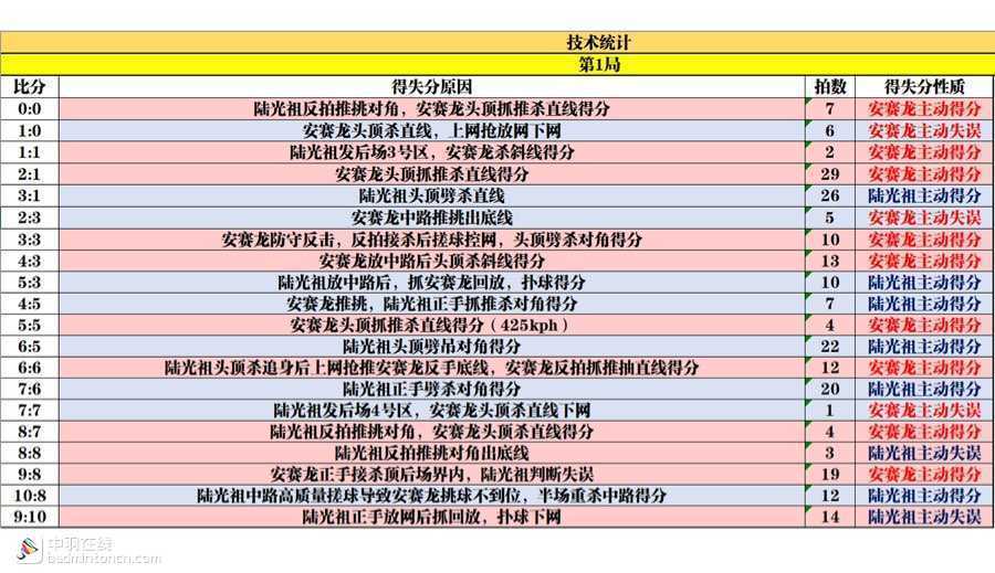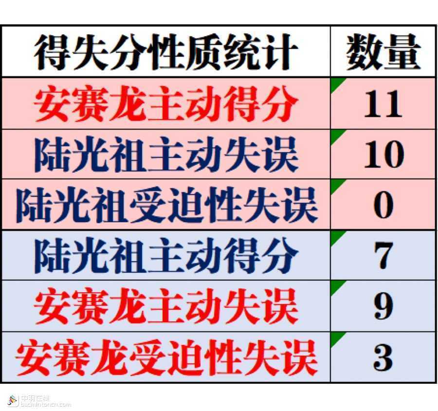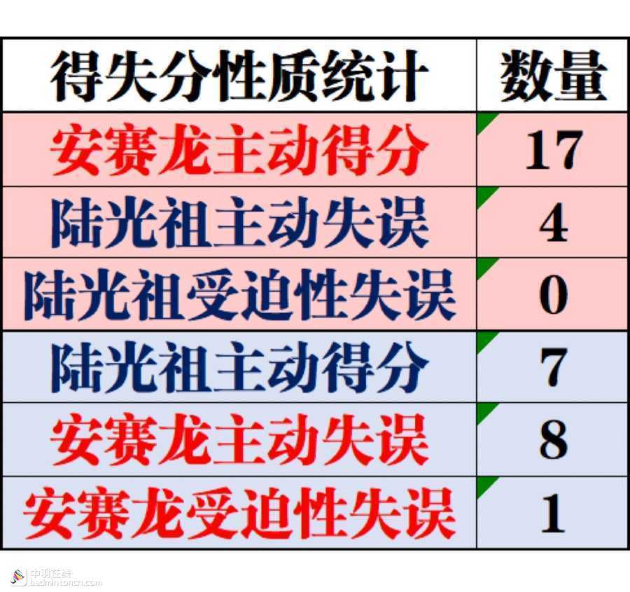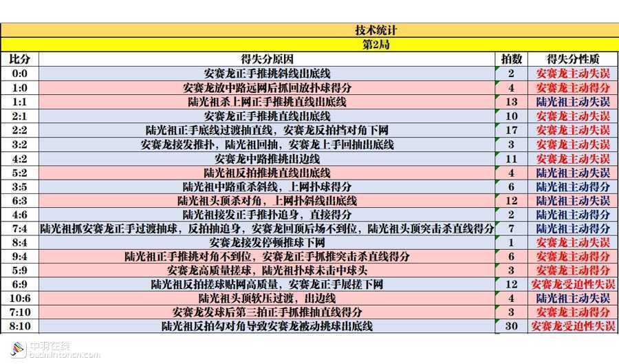 两人的主动得分都以杀球为主,安赛龙的9个主动得分里更是有6个来自抓推,可见其抓推突击能力之强和战术执行的坚决。而陆光祖的主动得分则相对丰富一些,除了控网抢攻、抓推突击以外,还结合了劈杀、劈吊等打节奏变化的球,网前积极控网、抓回放,在首局前半段表现出的得分手段更为全面。