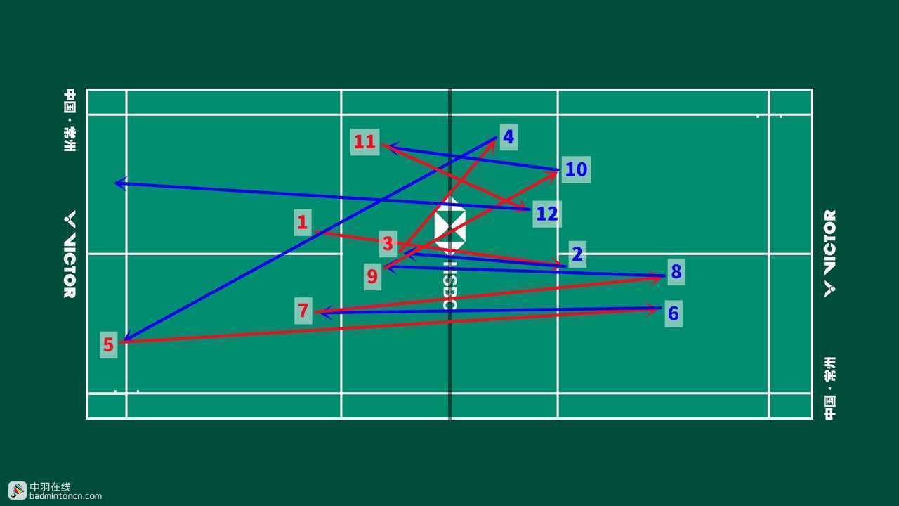 陆光祖的注意力和重心在中前场,因此球过顶后只能选择回拉高远球过渡。安赛龙在头顶区抓住机会杀直线,这一拍落点并不是很靠边,陆光祖的防守压力不大,挡斜线后快速转身化解安赛龙上网的推扑。此后陆光祖在网前保持积极,较高的拿点有效限制安赛龙,中路果断推挑,然后抓过渡,快勾对角,迫使安赛龙起球,然后打出最后一击,在以抓推突击为主的快节奏对抗中突然滑板劈对角,巧妙拿下这一分。